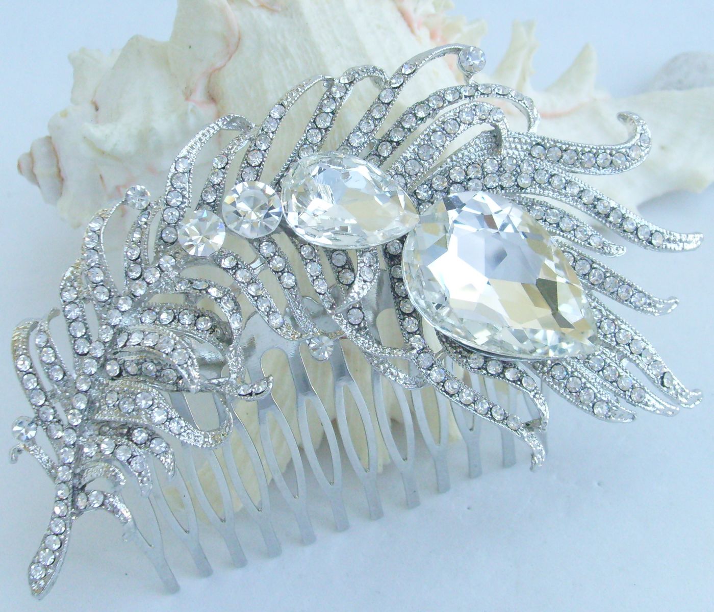 Sindary Wedding Bridal Headpiece Peacock Feather Hair Clip Side Comb Rhinestone Hair Comb HC05038 (Silver-Tone Clear)