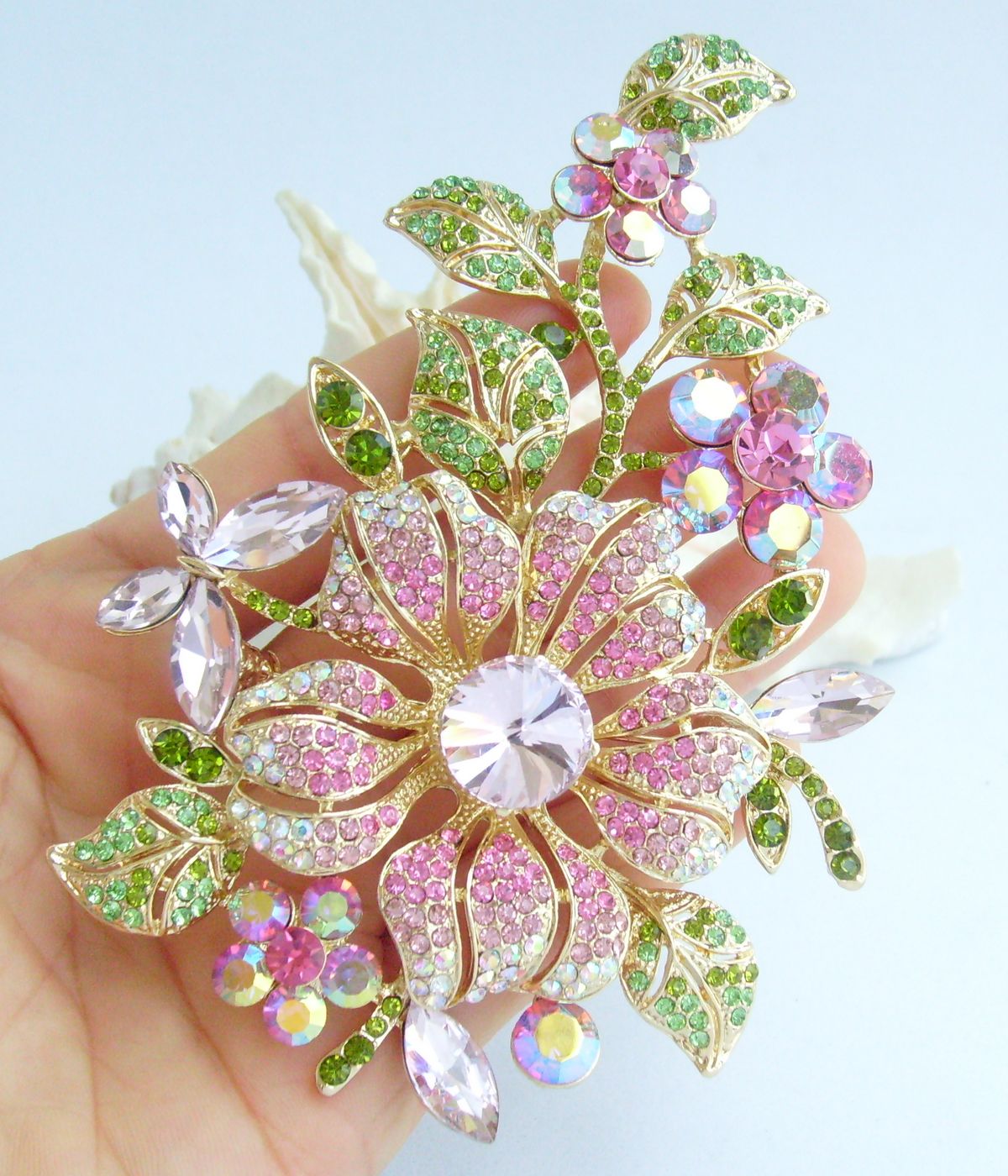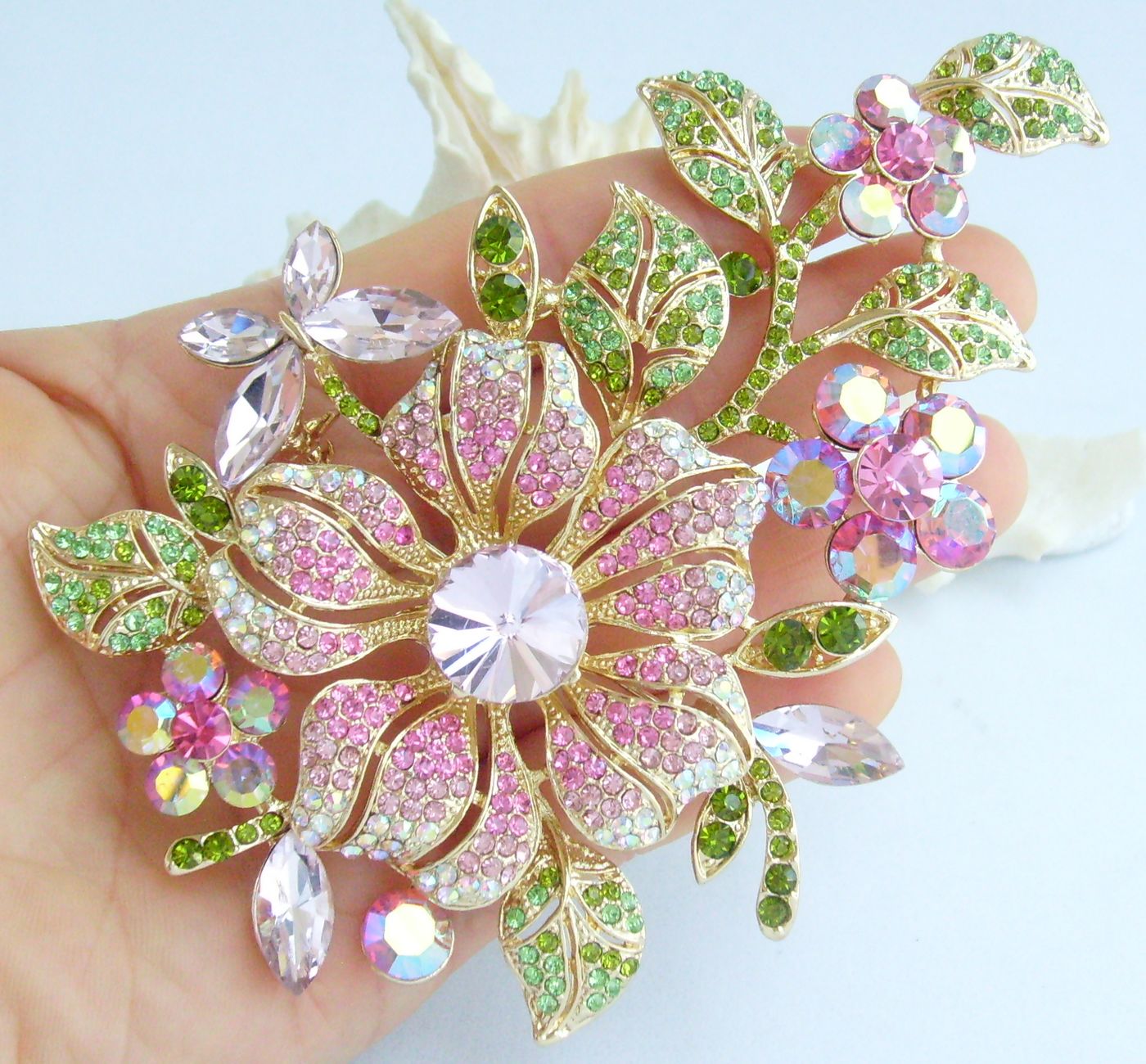 Sindary Party Jewelry Rhinestone Crystal Flower Brooch Pin Pendant BP04712 (Gold-Tone Pink) 70g