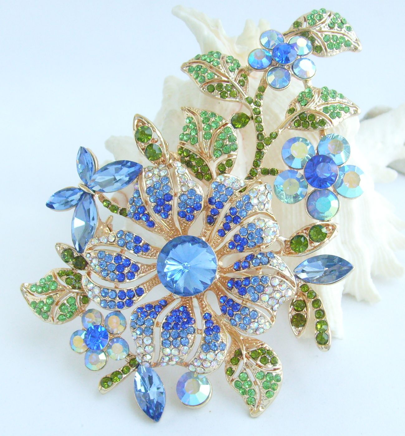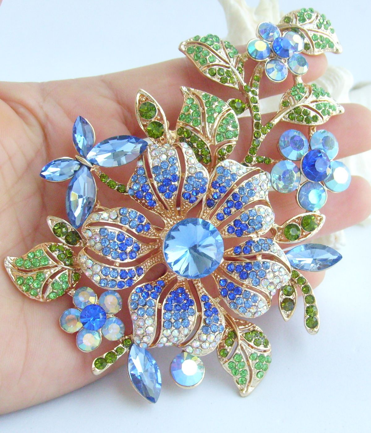 Sindary Party Jewelry Rhinestone Crystal Flower Brooch Pin Pendant BP04712 (Gold-Tone Blue) 70g