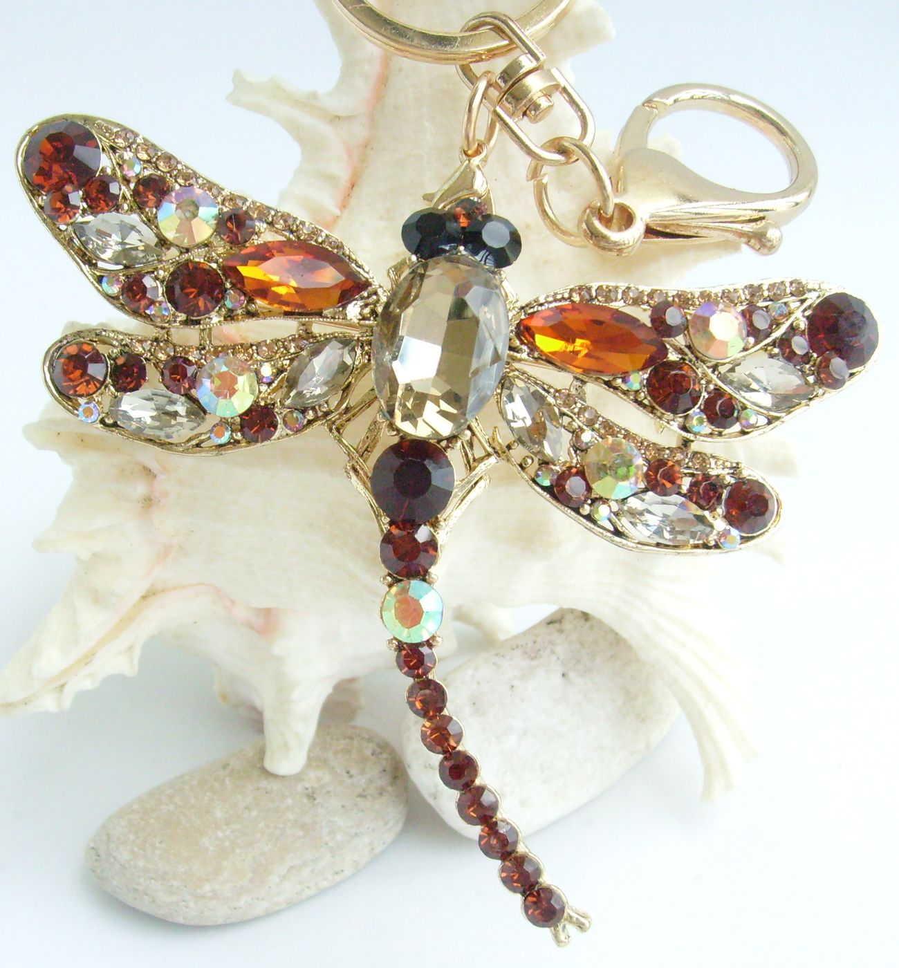 Sindary Pretty Insect Dragonfly Keychain Pendant Rhinestone Crystal KP05684 (Gold-Tone Brown) 50g