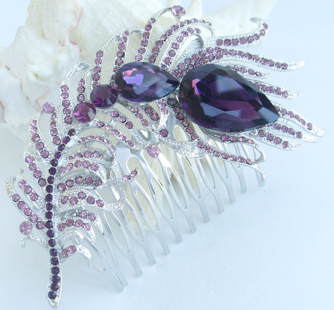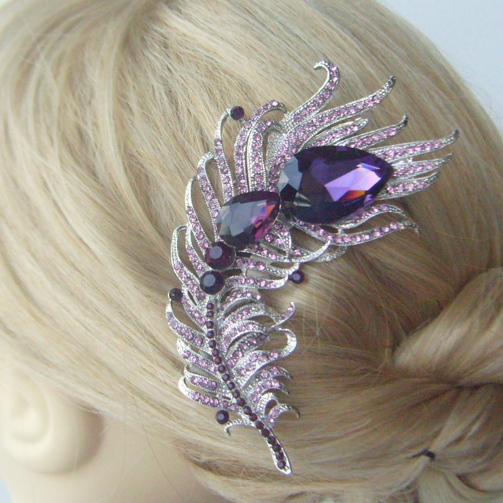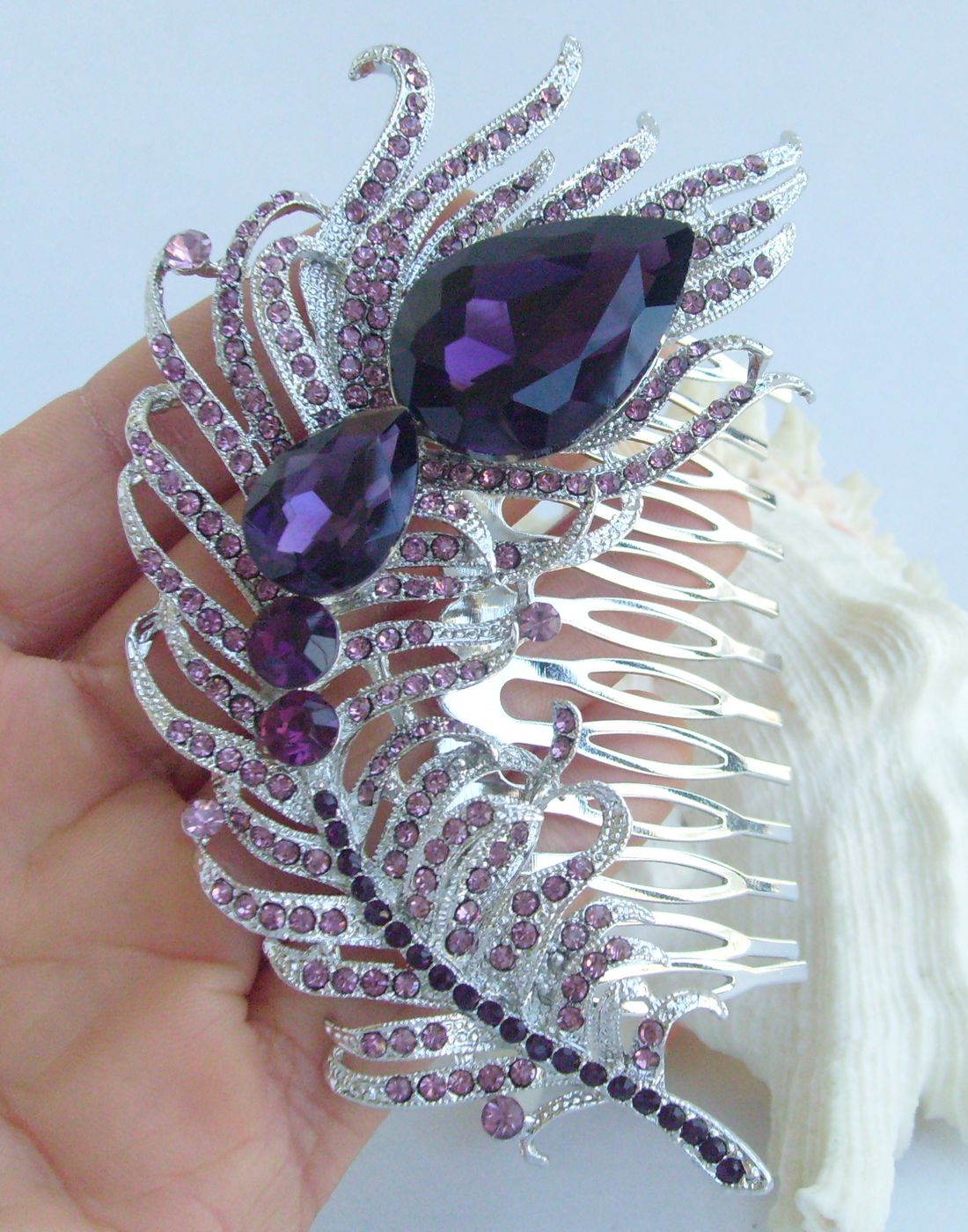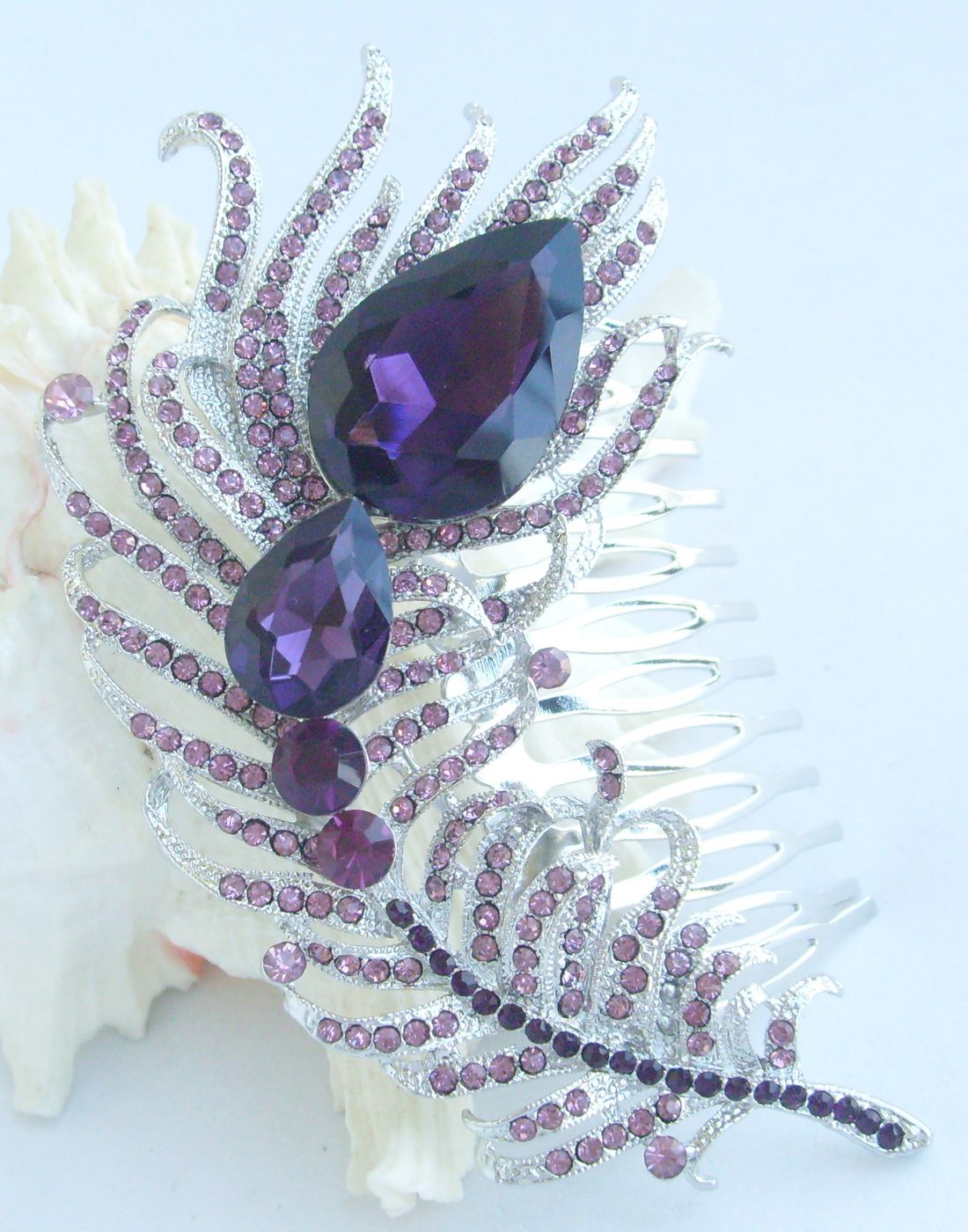 Sindary Wedding Bridal Headpiece Peacock Feather Hair Clip Side Comb Rhinestone Hair Comb HC05038 (Silver-Tone Purple)