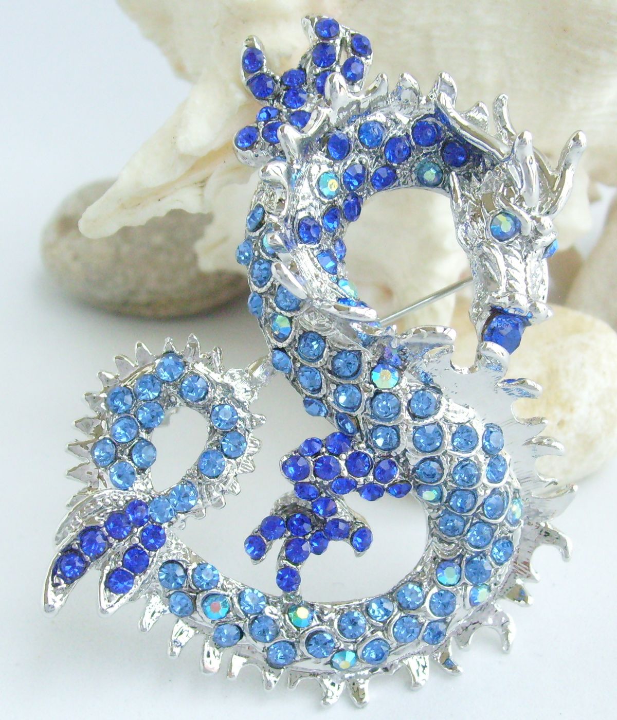 Sindary Unique Rhinestone Crystal Dragon Animal Brooch Pin Pendant BP02980 (Silver-Tone Blue) 20g