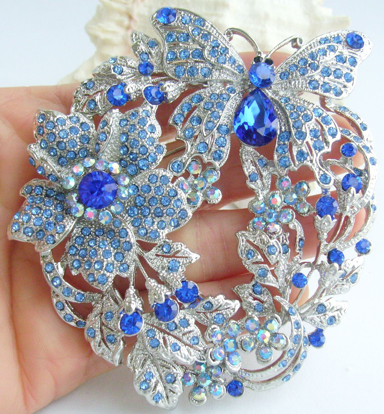 Sindary Charming Butterfly Flower Brooch Pin Pendant Rhinestone Crystal BP04489 (Silver-Tone Blue) 65g