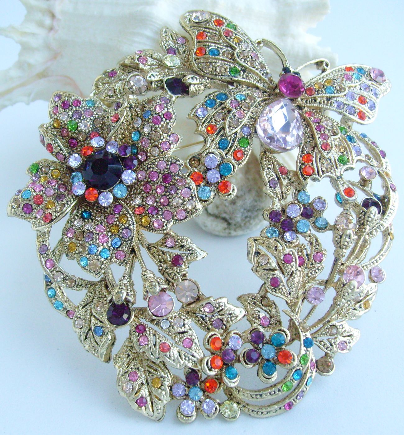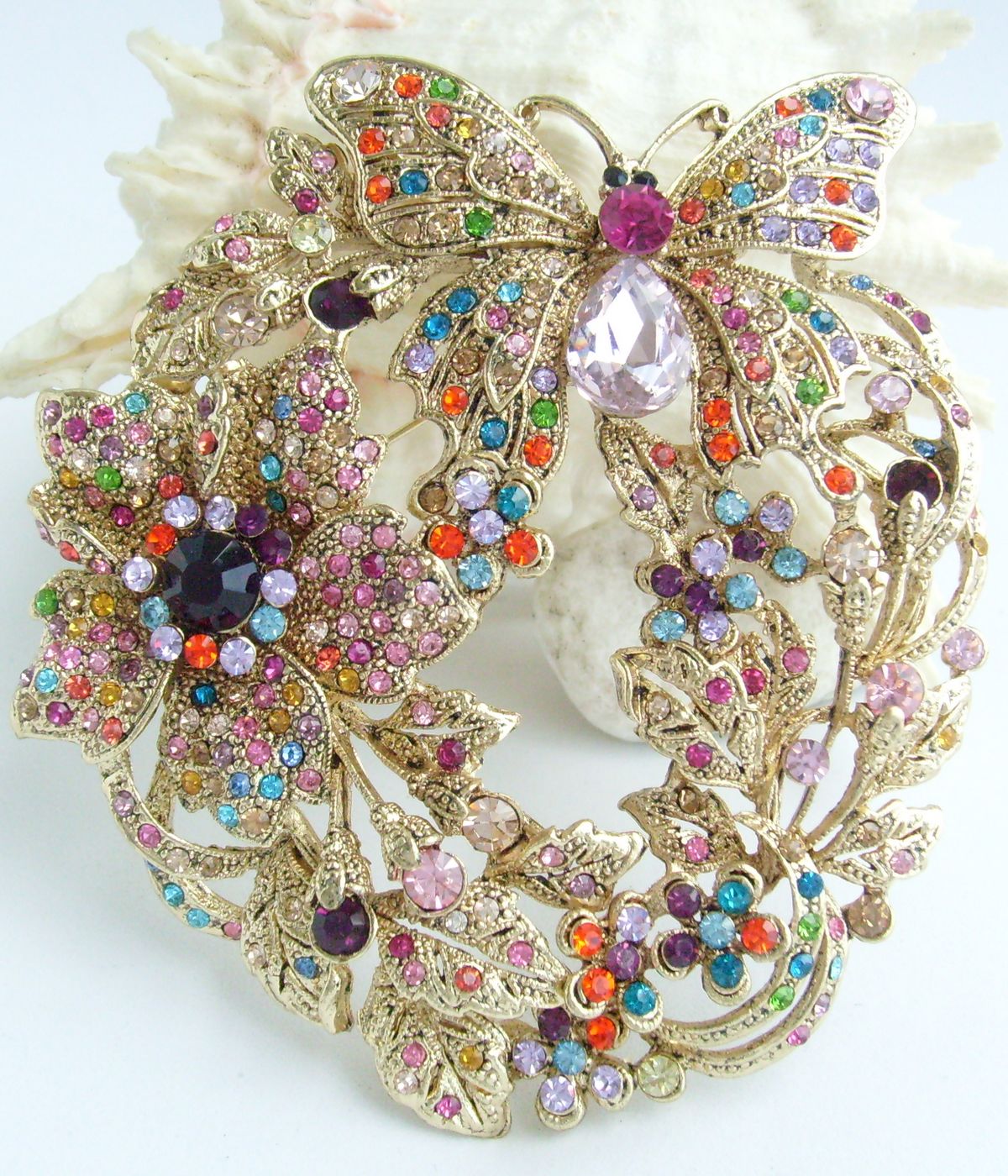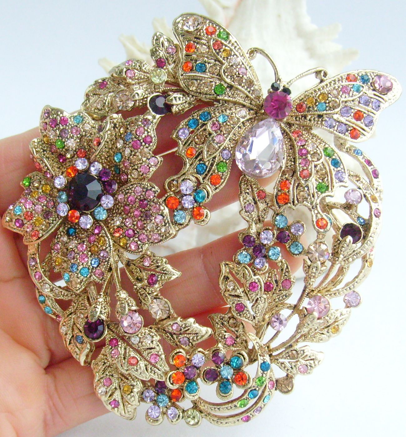 Sindary Charming Butterfly Flower Brooch Pin Pendant Rhinestone Crystal BP04489 (Gold-Tone Multicolor) 65g
