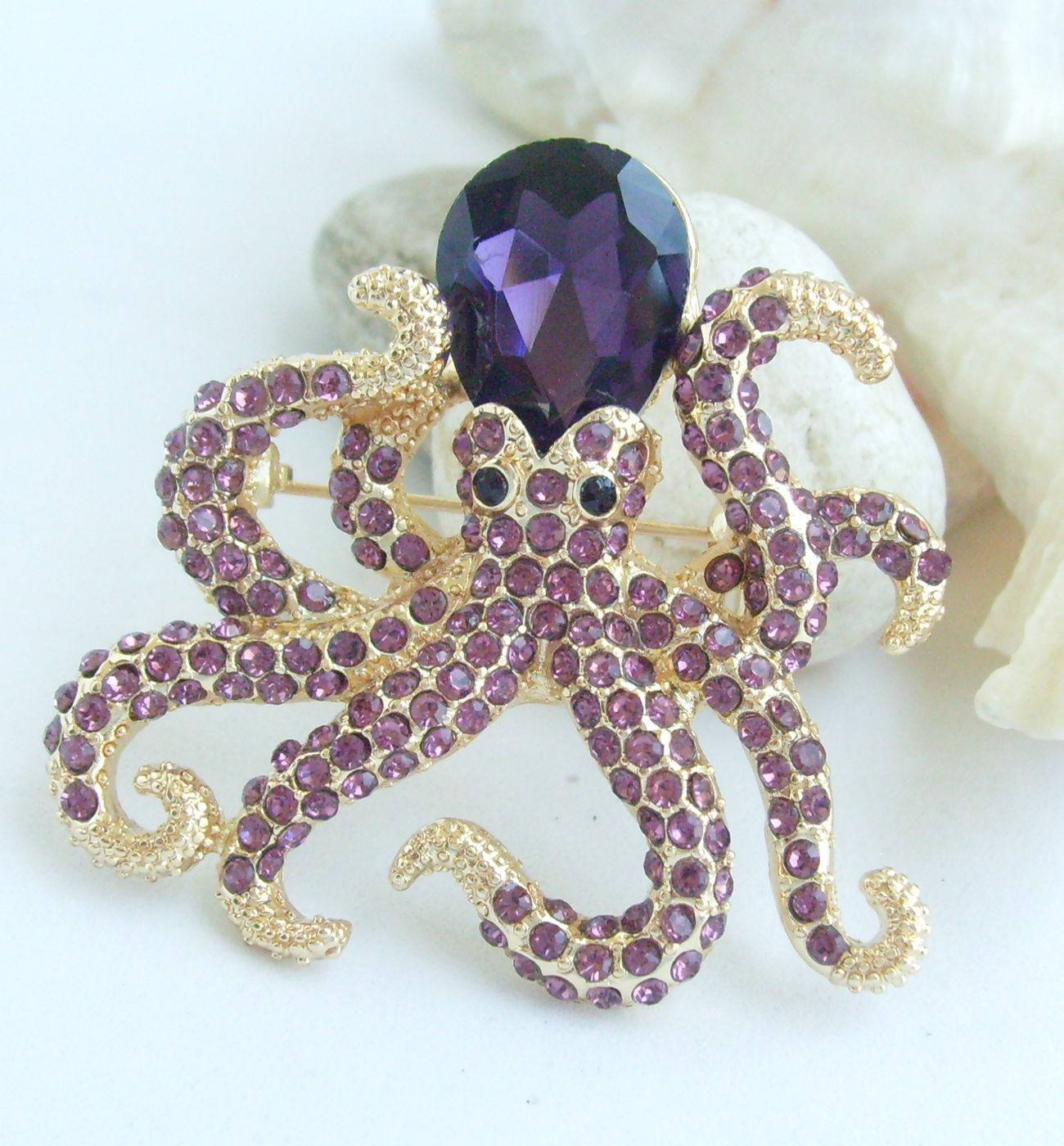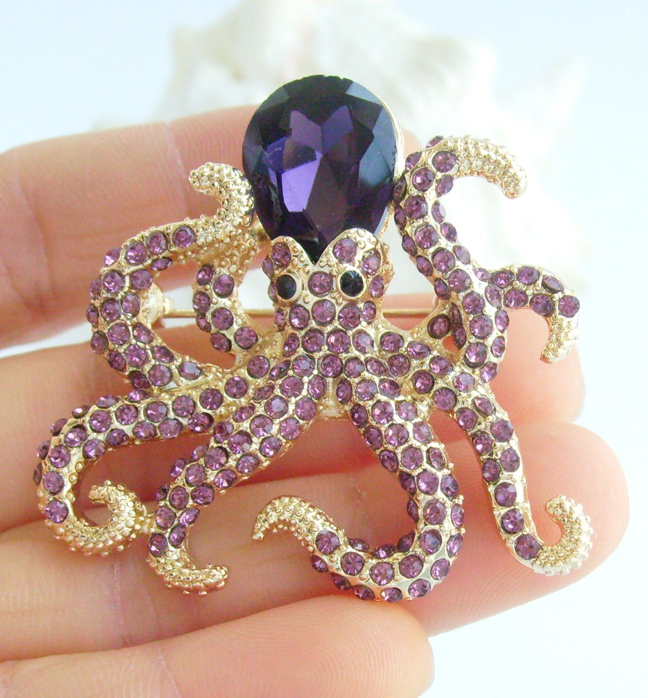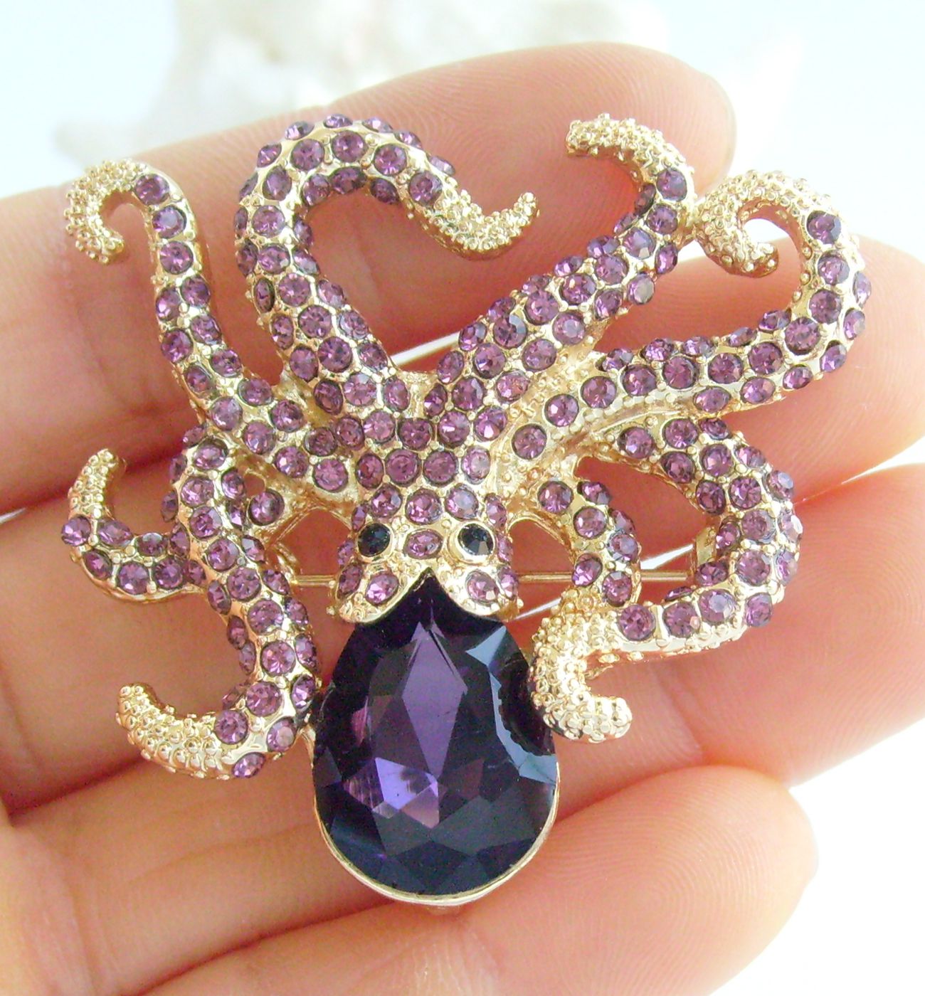 Sindary Unique Rhinestone Animal Octopus Brooch Pin Pendant BP083 (Gold-Tone Purple) 20g