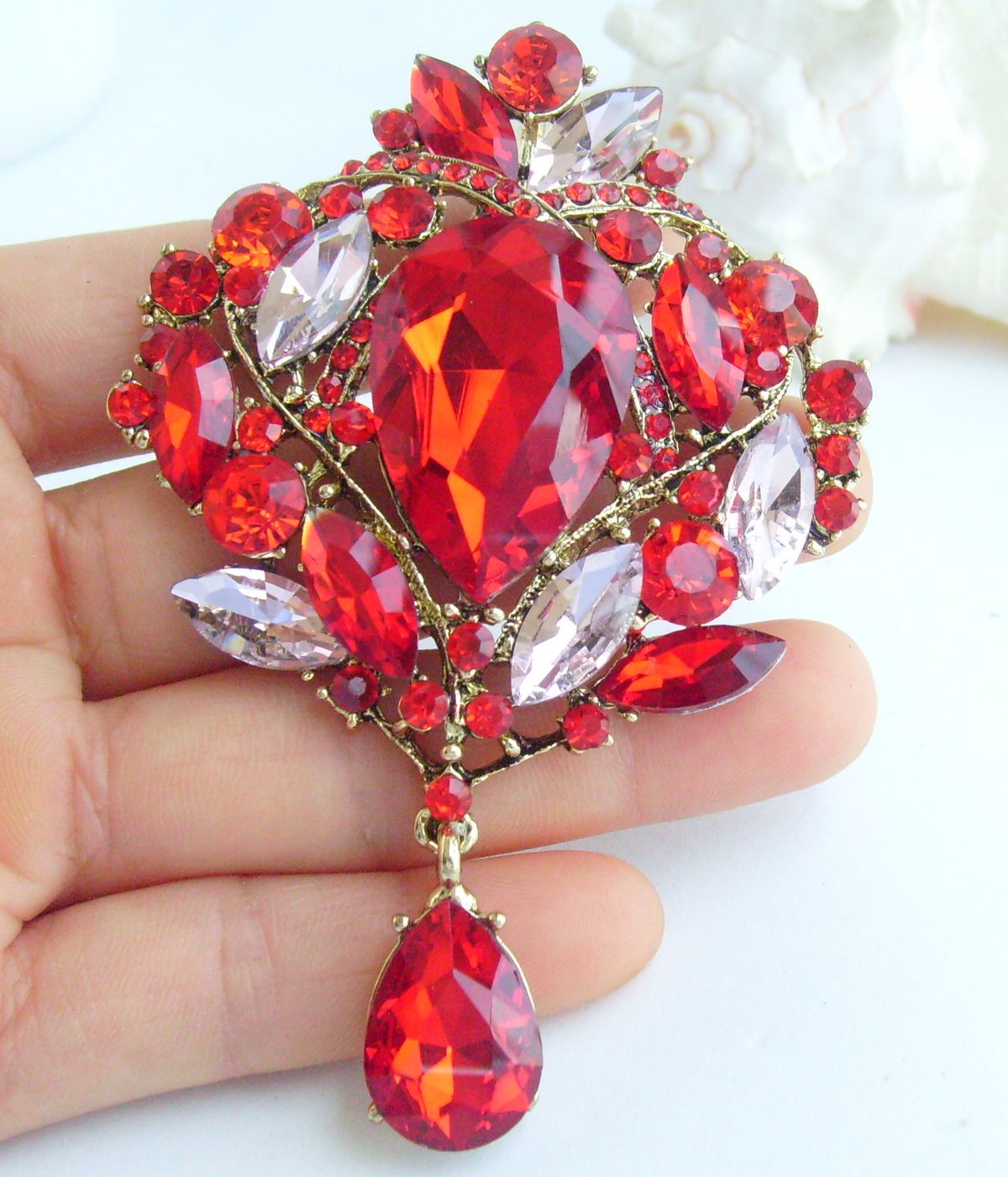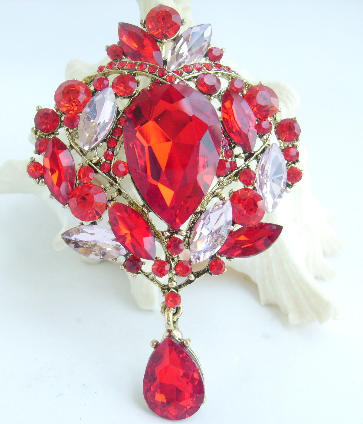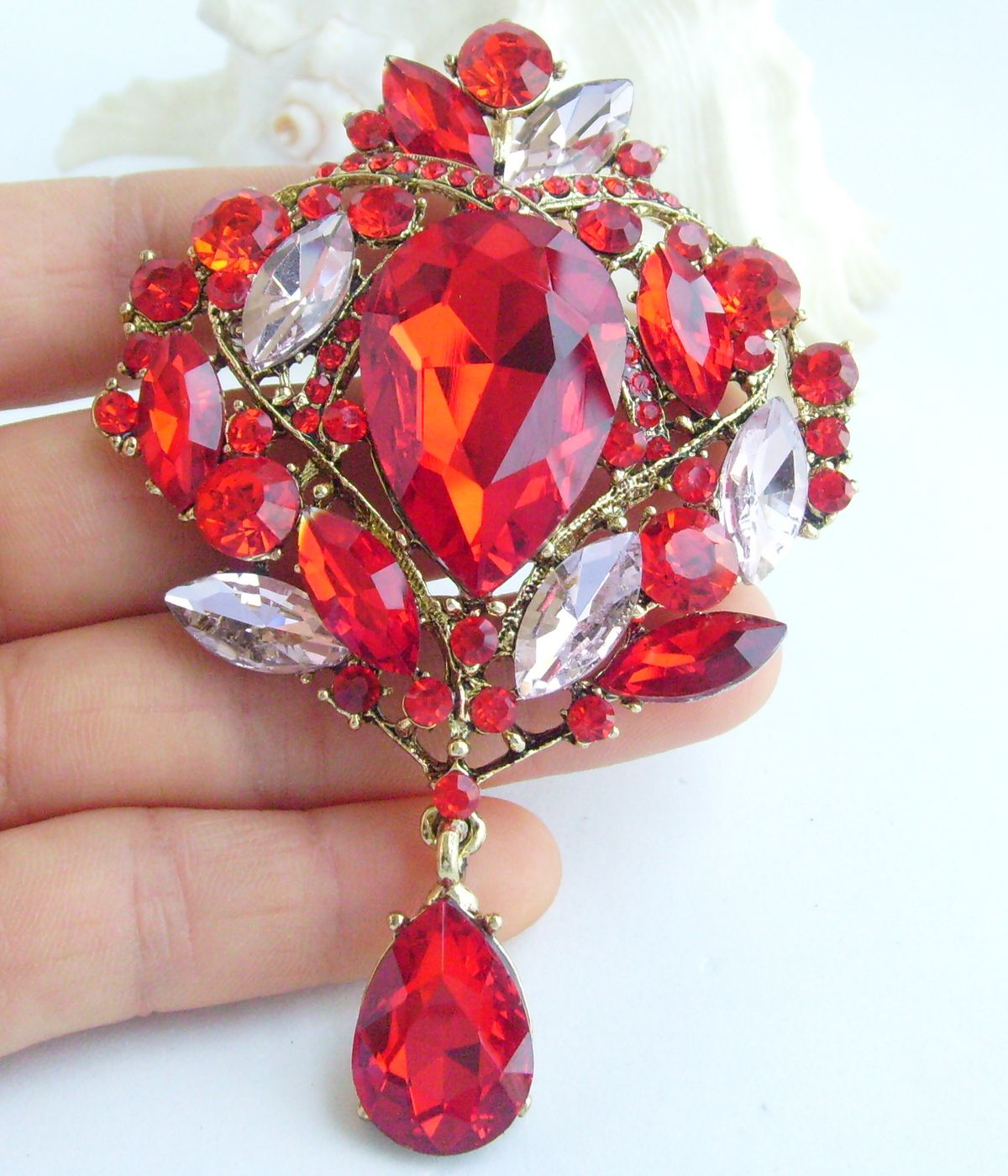 Sindary Classic Teardrop Brooch Pin Pendant Rhinestone Crystal Teardrop Pin BP04082 (Gold-Tone Red Pink) 50g