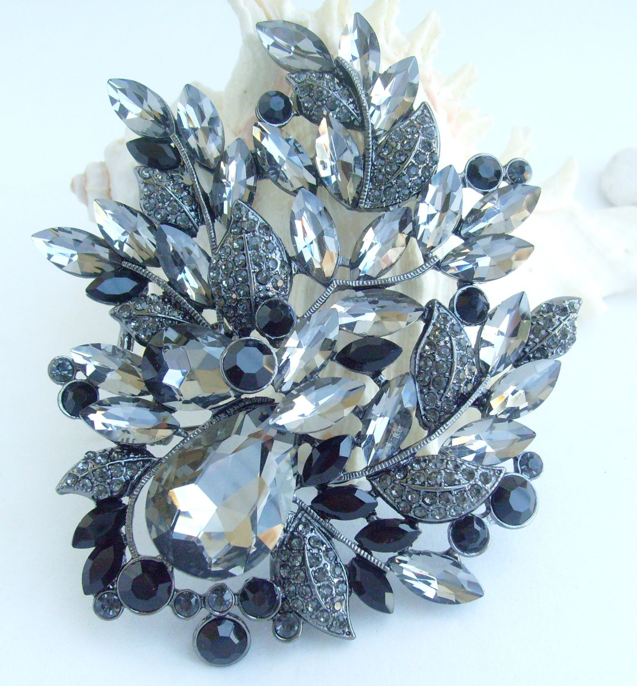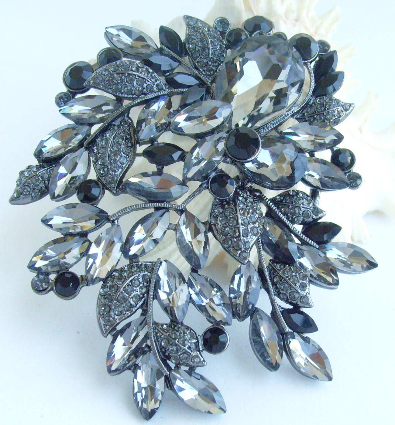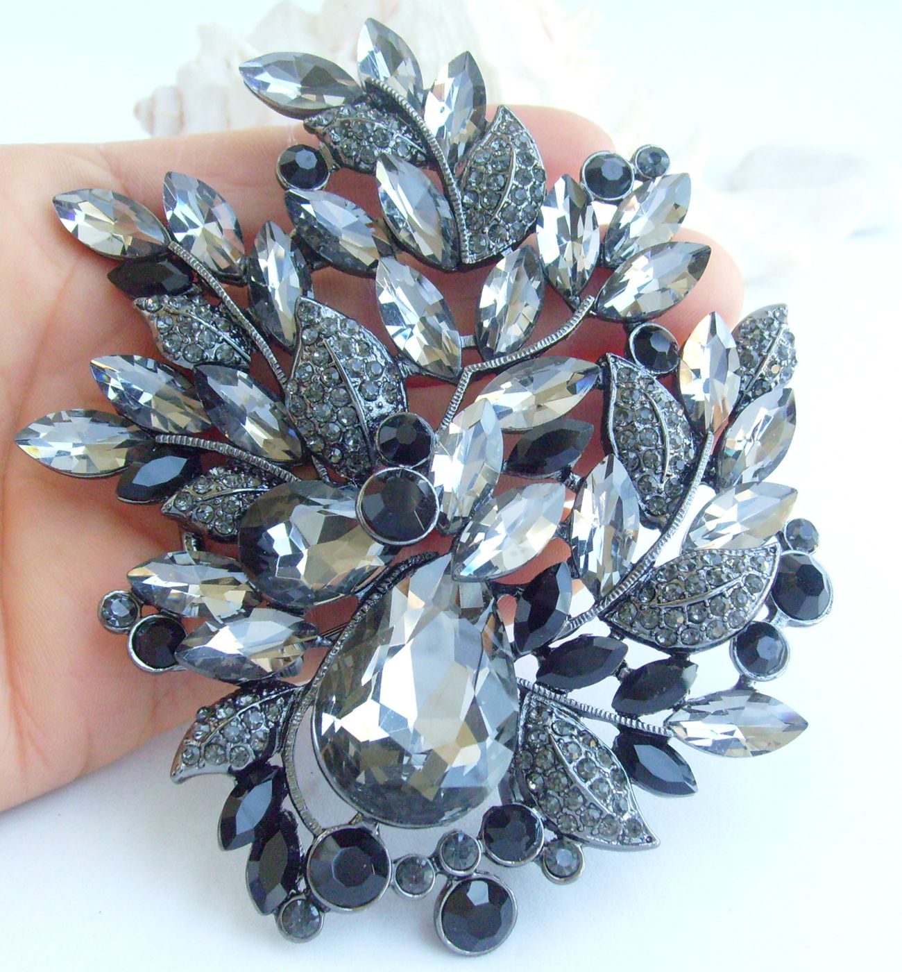 Sindary Rhinestone Crystal Teardrop Leaf Flower Brooch Pin Pendant Large Brooch for Women BP04672 (Black-Tone Black Gray) 90g