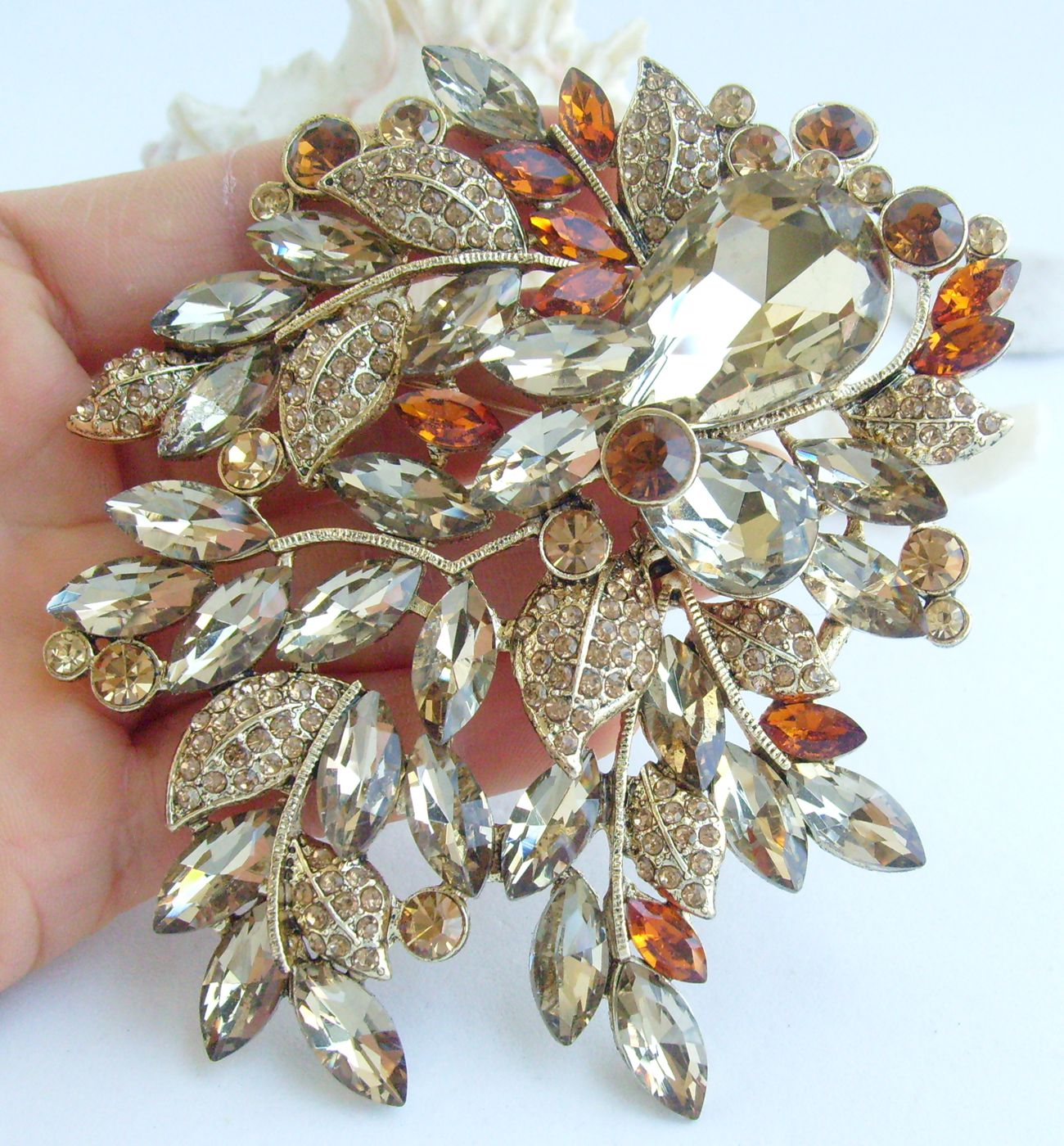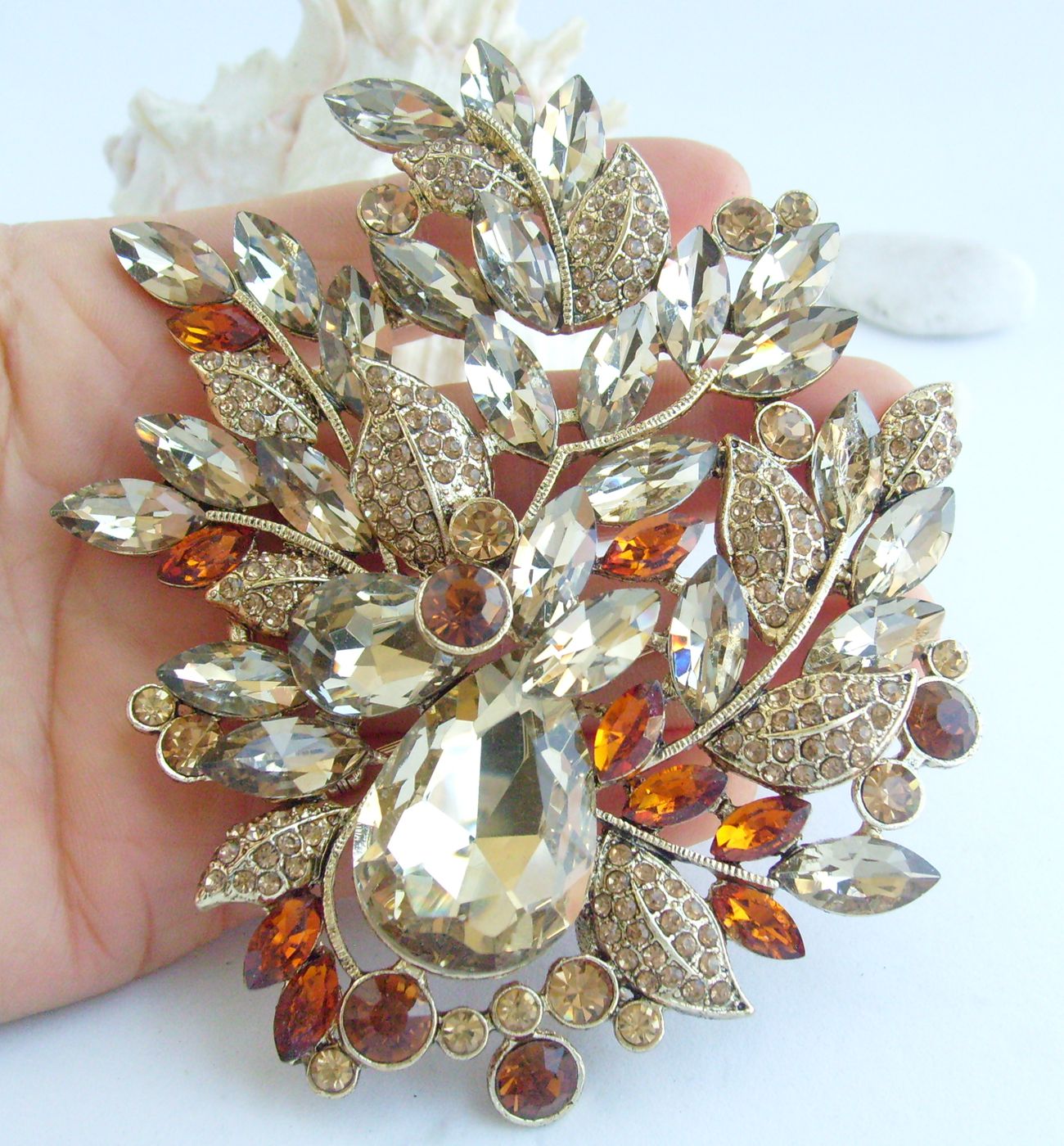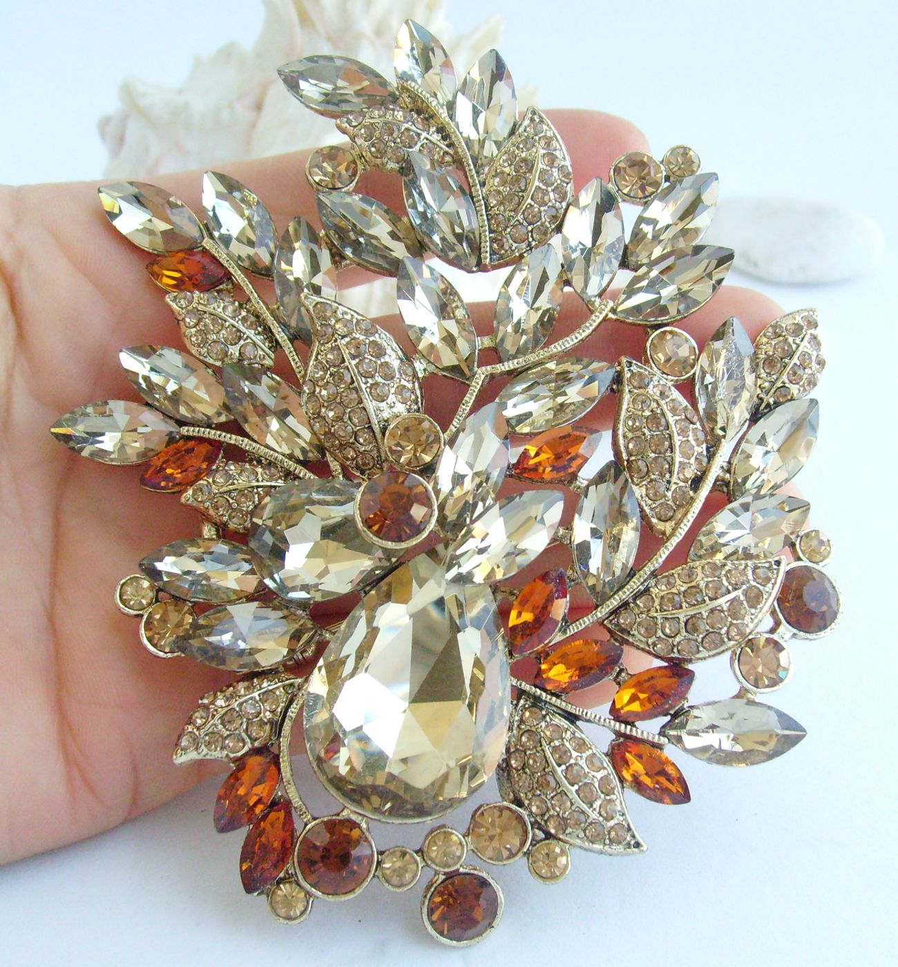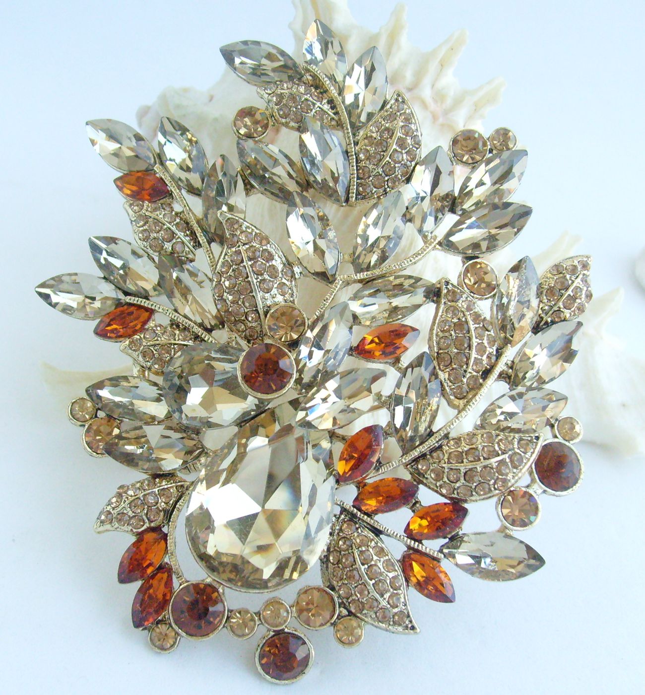 Sindary Rhinestone Crystal Teardrop Leaf Flower Brooch Pin Pendant Large Brooch for Women BP04672 (Gold-Tone Brown) 90g