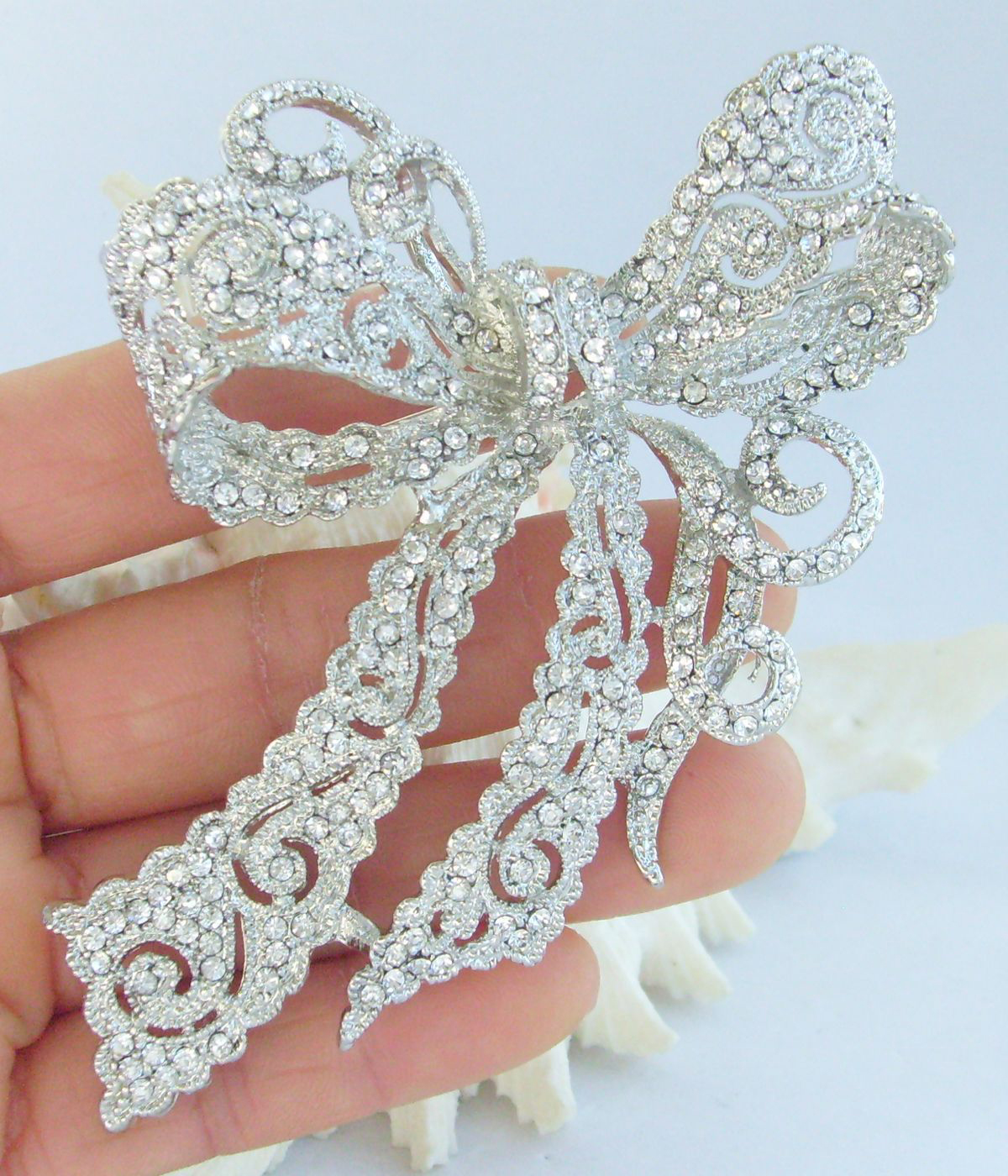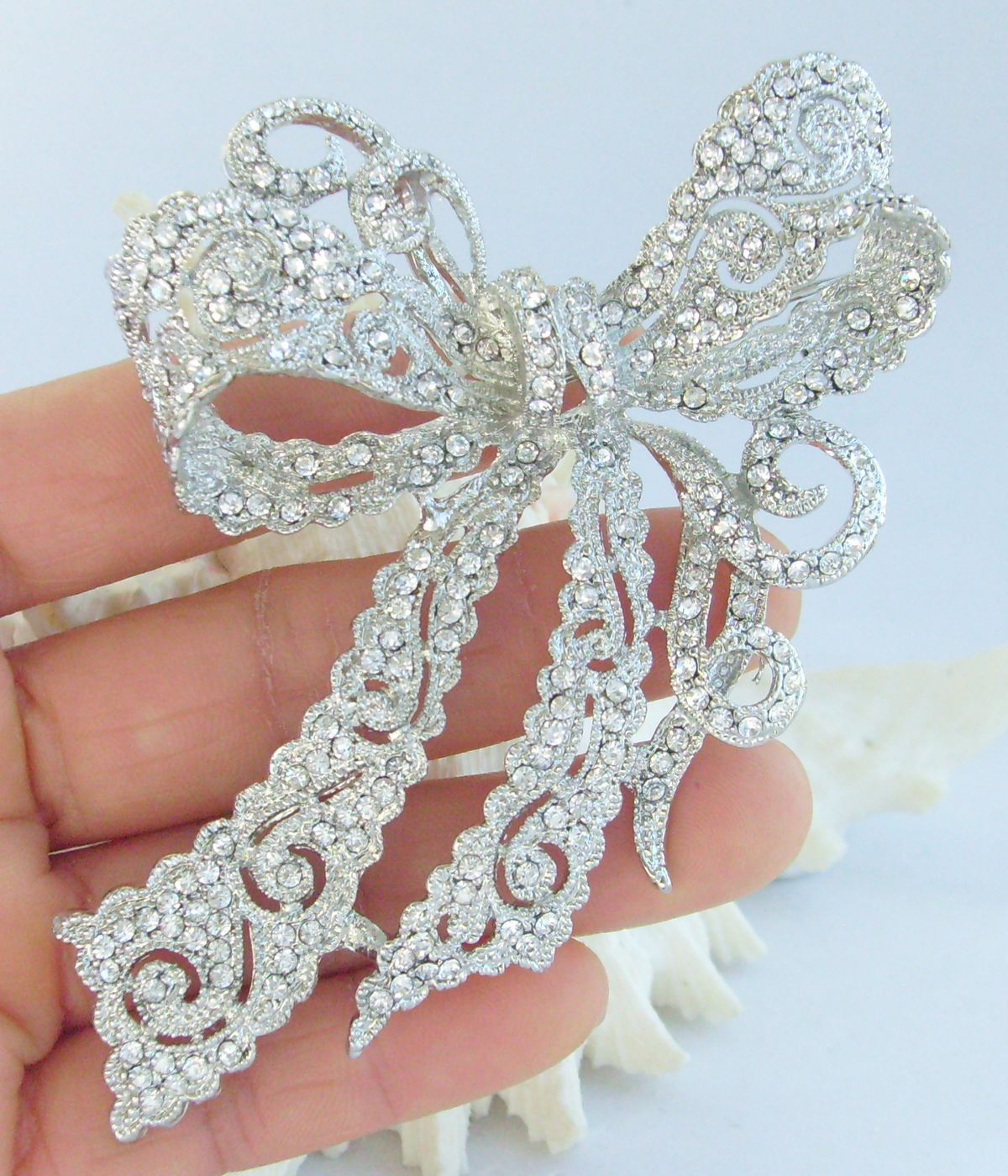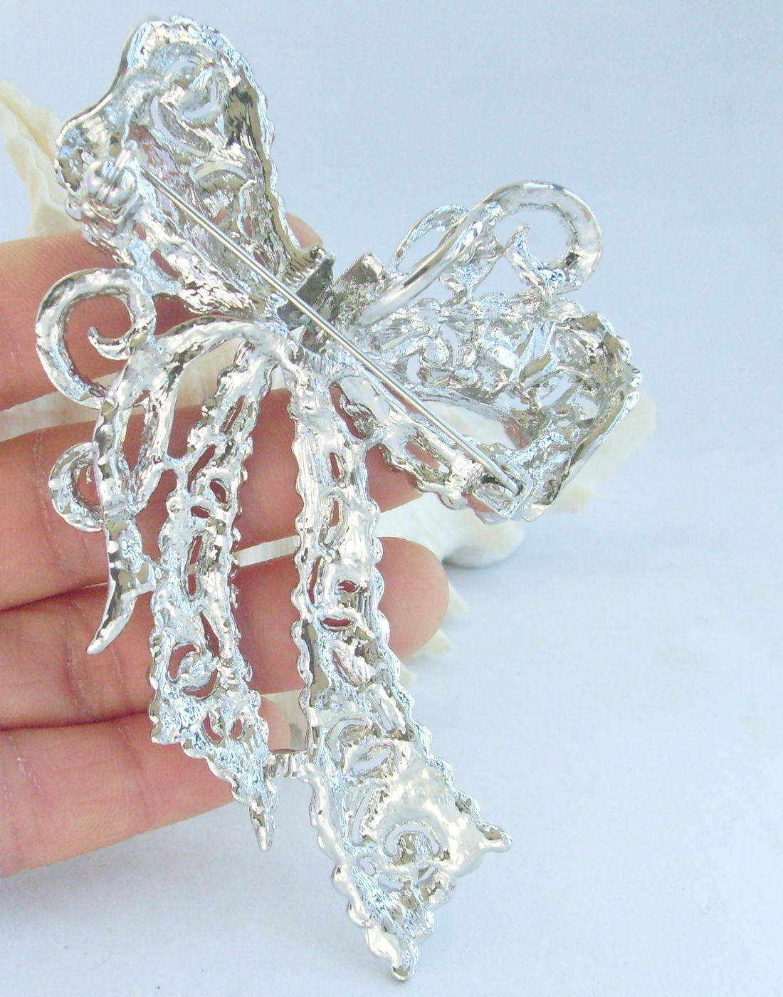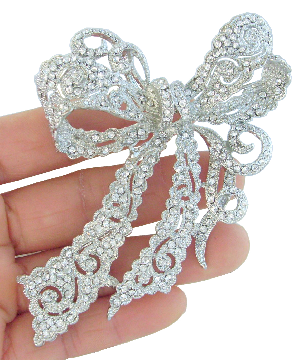 Sindary 4 Inch Rhinestone Crystal Bowknot Brooch Pin Pendant BP05823 (Silver-Tone Clear) 40g