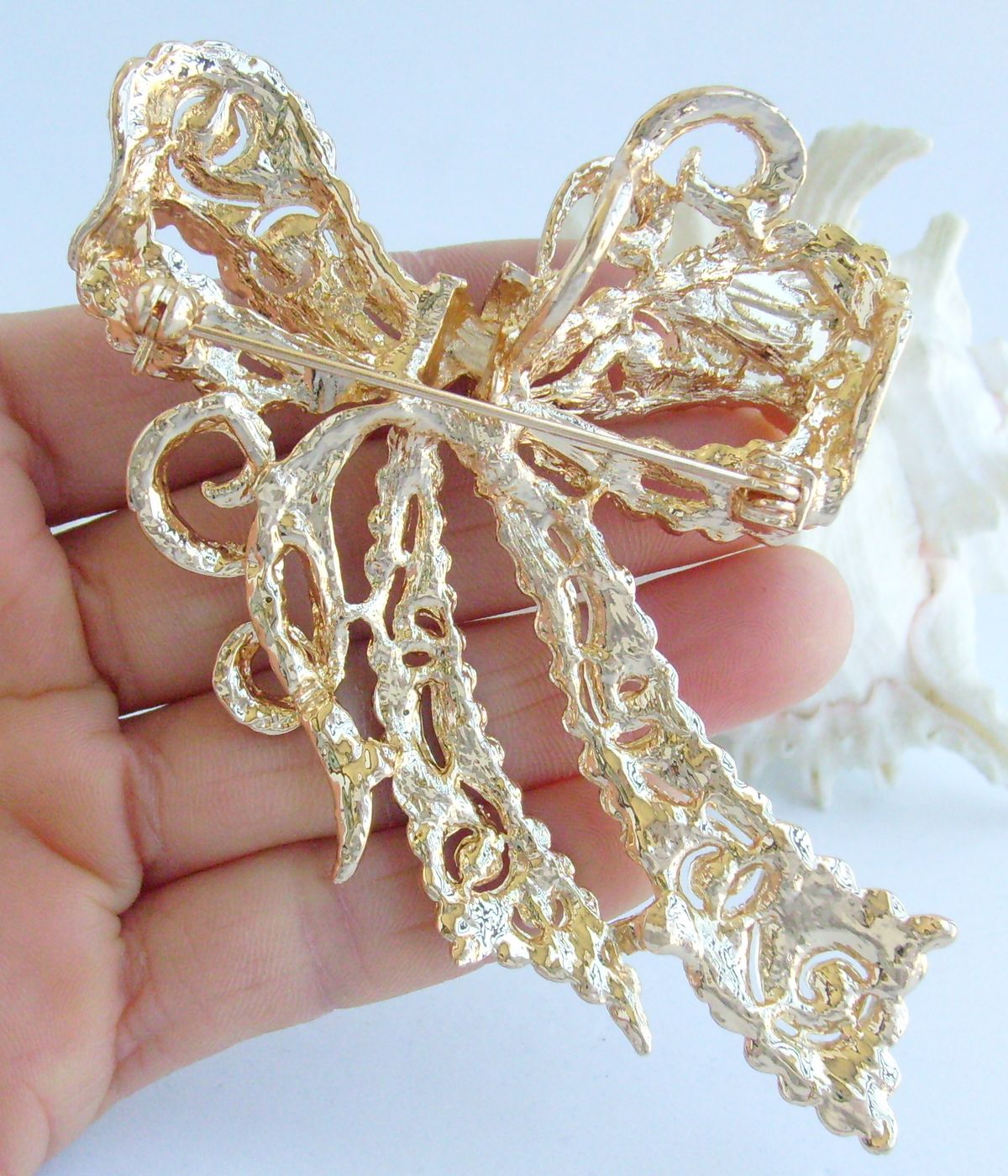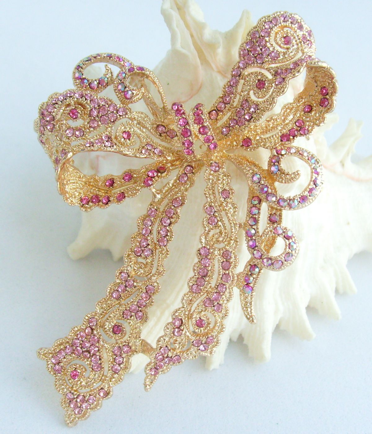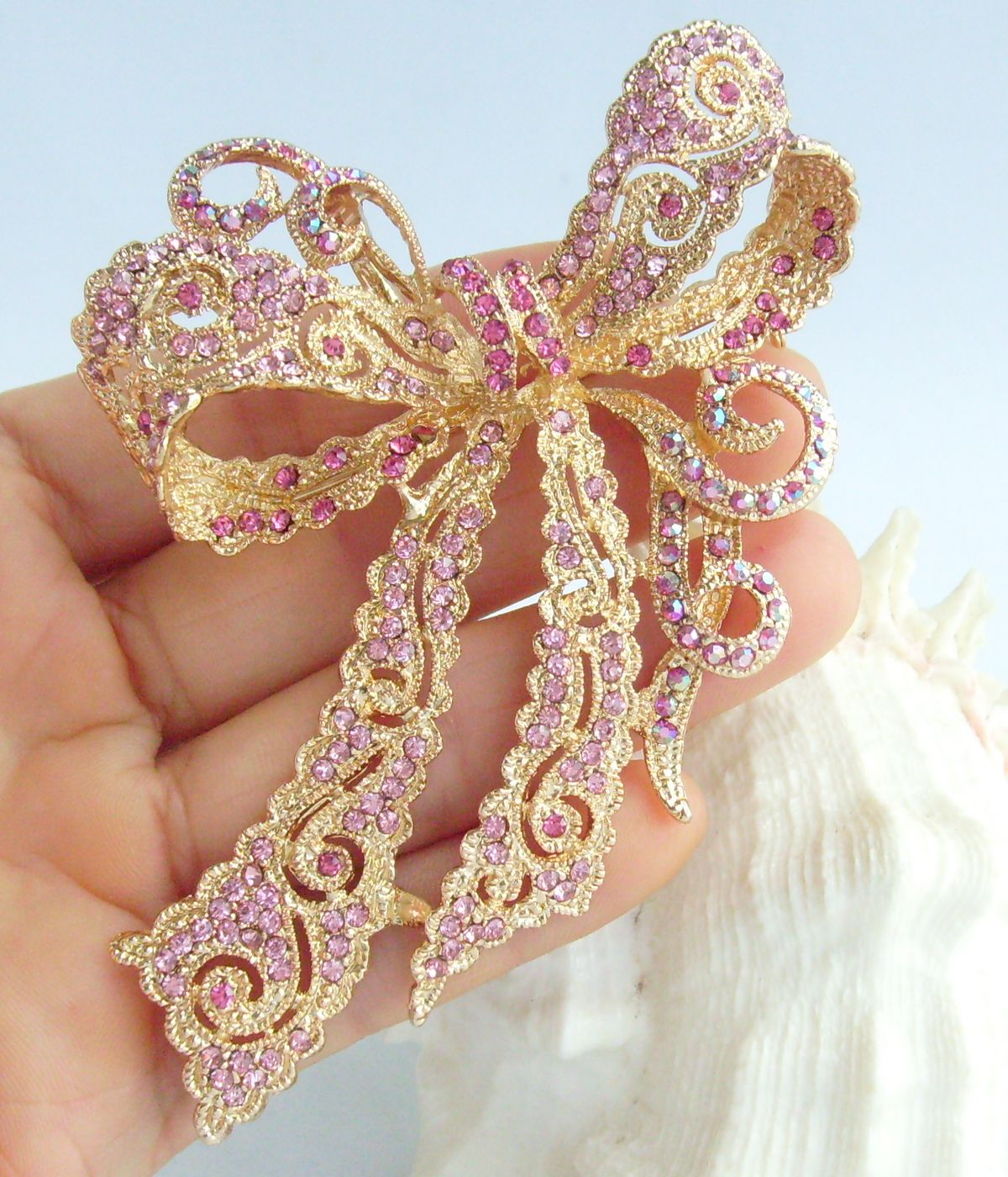 Sindary 4 Inch Rhinestone Crystal Bowknot Brooch Pin Pendant BP05823 (Gold-Tone Pink) 40g