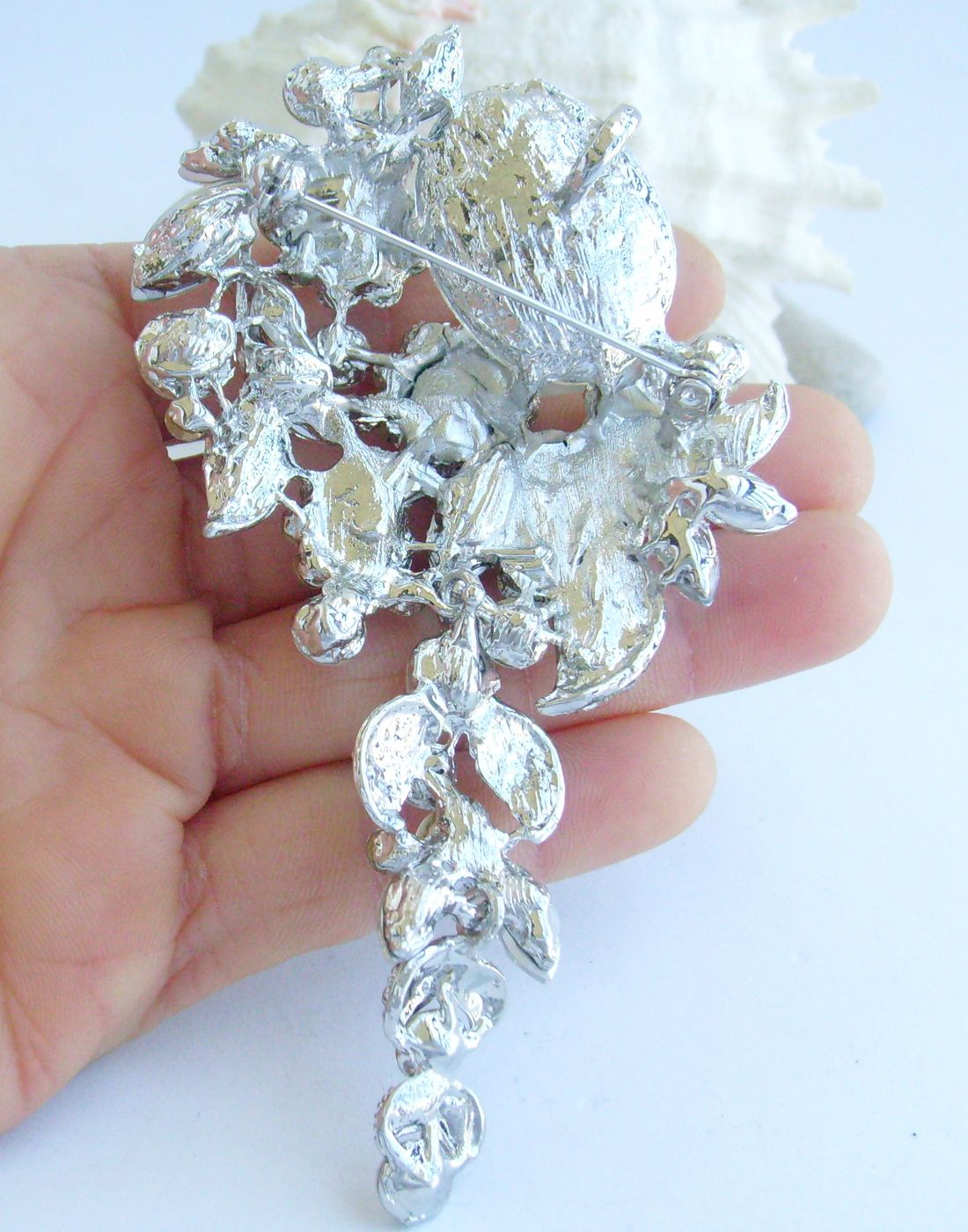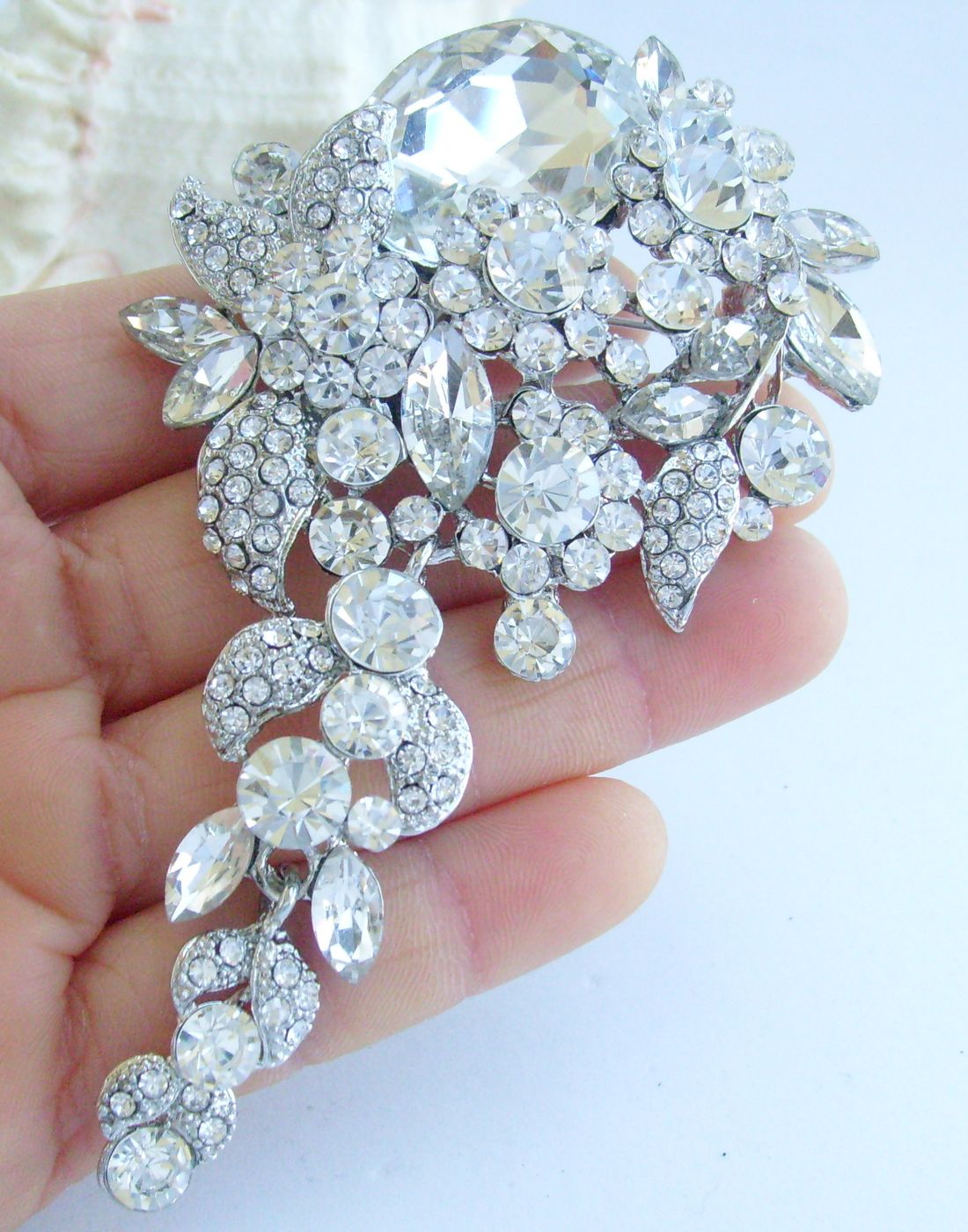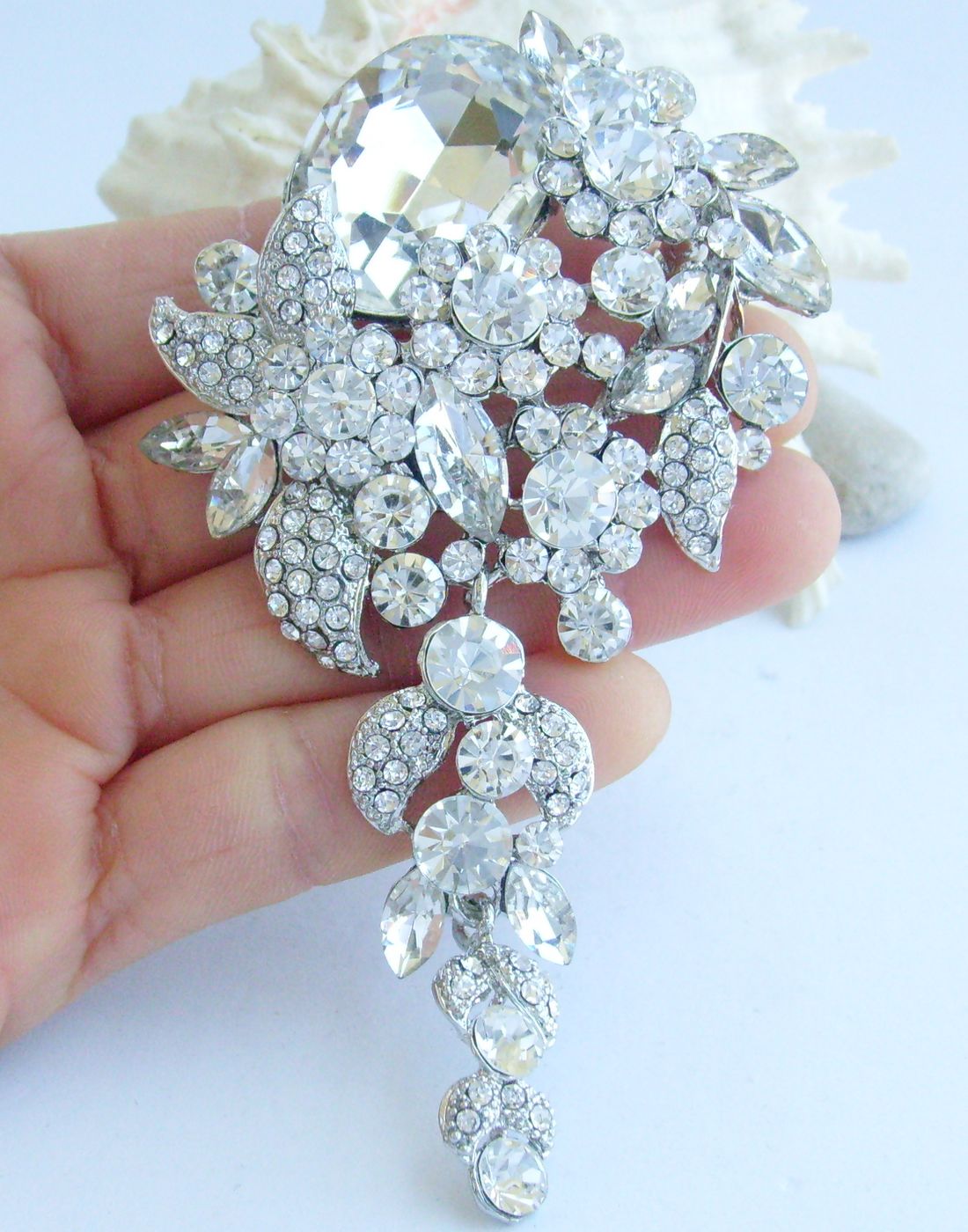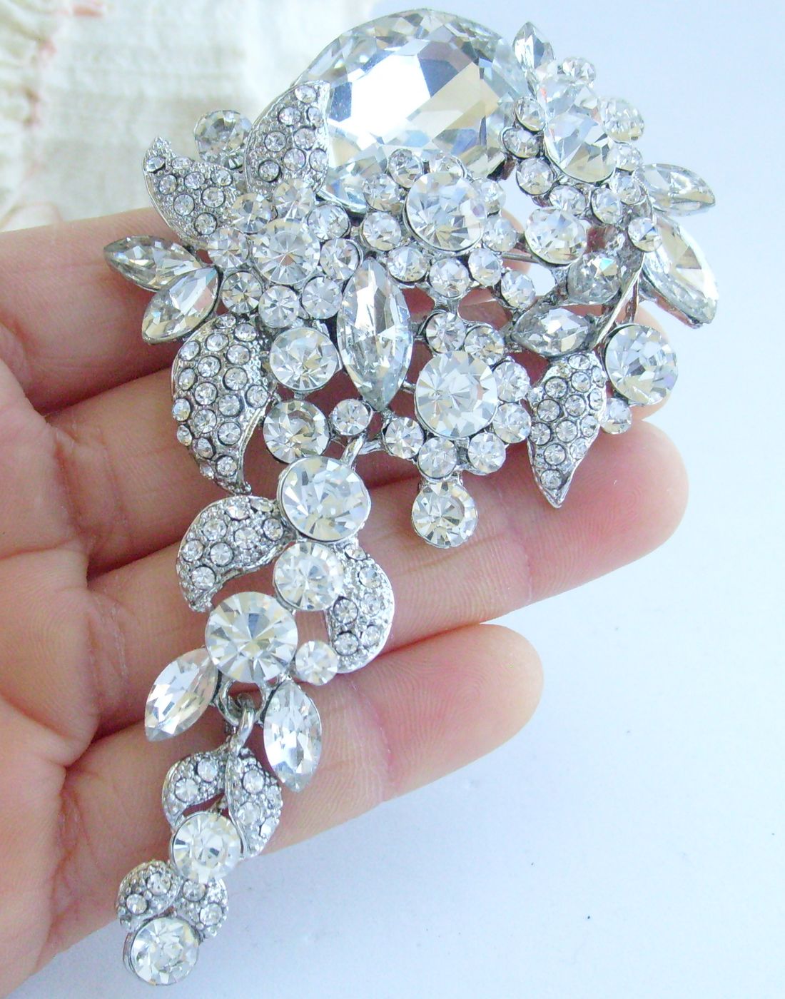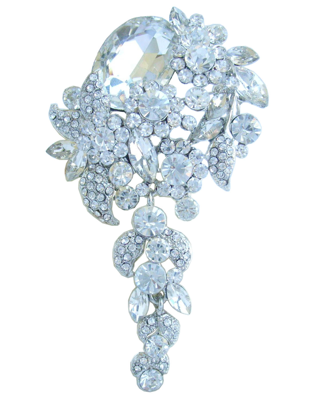Sindary 4 Inch Rhinestone Crystal Teardrop Flower Brooch Pin Pendant BP06524 (Silver-Tone Clear) 50g