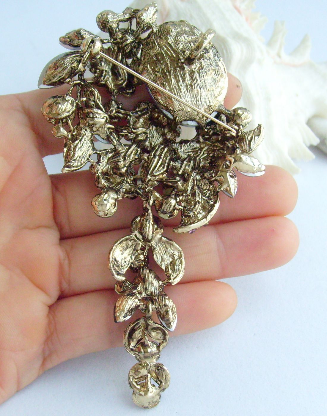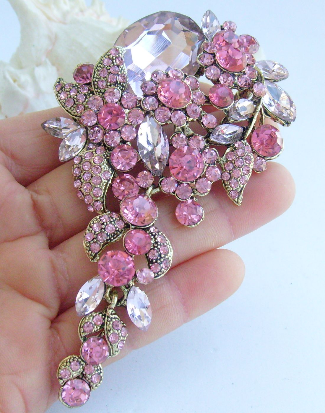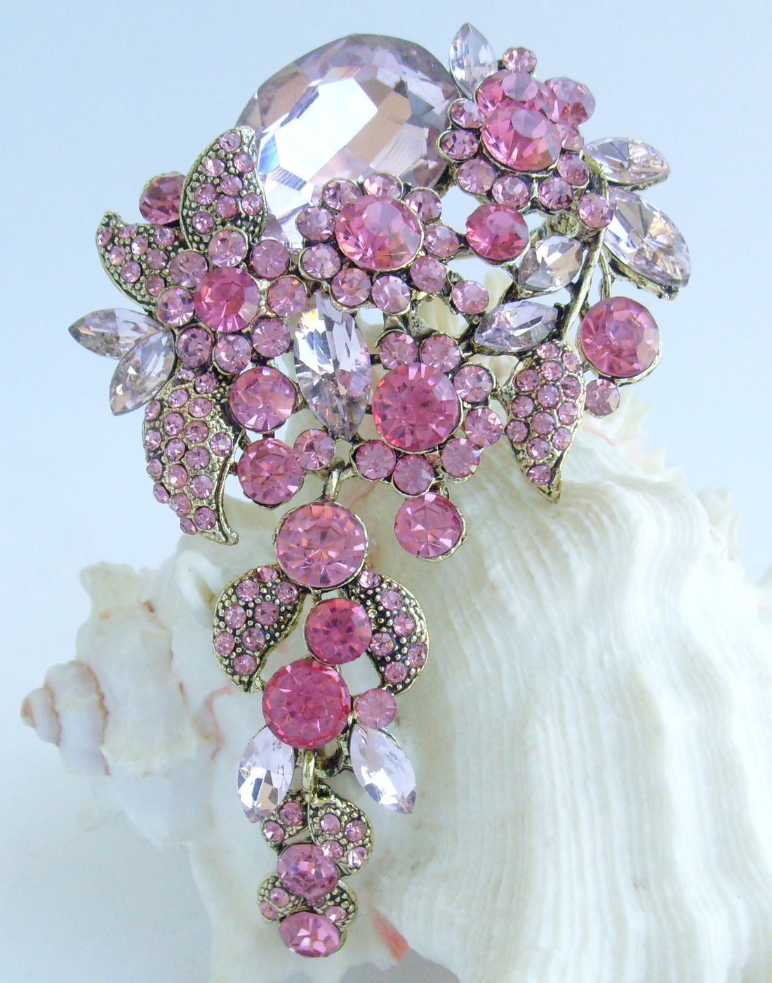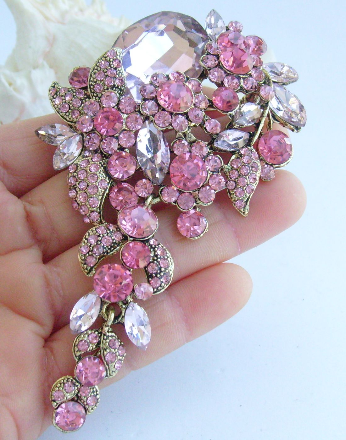 Sindary 4 Inch Rhinestone Crystal Teardrop Flower Brooch Pin Pendant BP06524 (Gold-Tone Pink) 50g