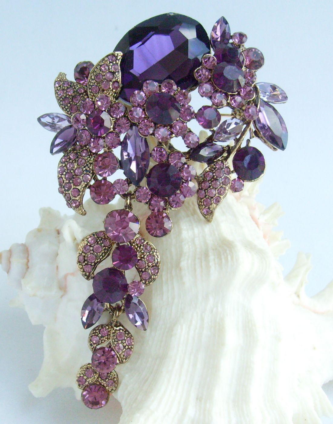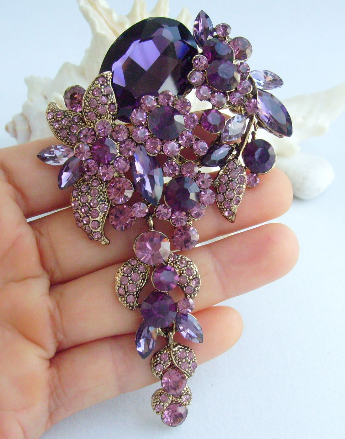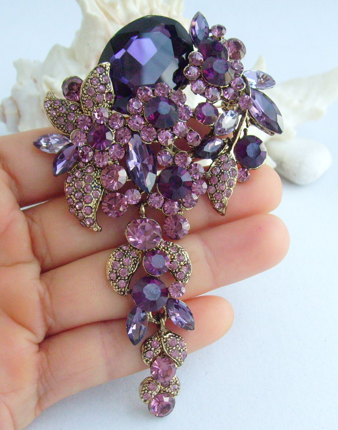Sindary 4 Inch Rhinestone Crystal Teardrop Flower Brooch Pin Pendant BP06524 (Gold-Tone Purple) 50g