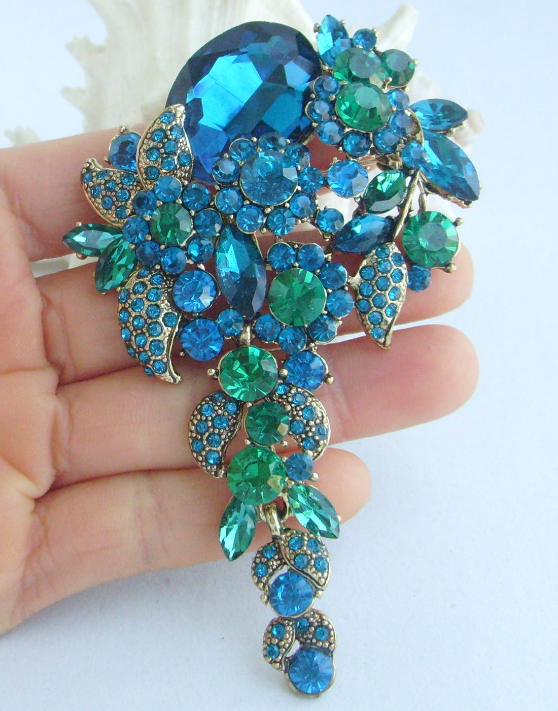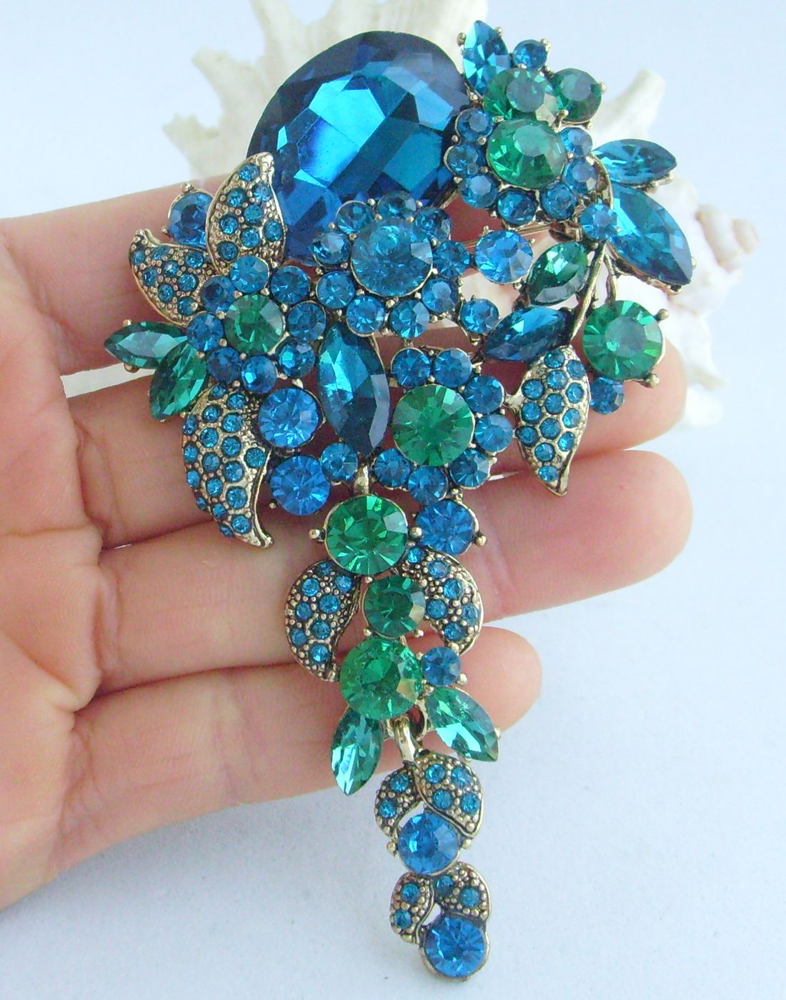 Sindary 4 Inch Rhinestone Crystal Teardrop Flower Brooch Pin Pendant BP06524 (Gold-Tone Turquoise) 50g