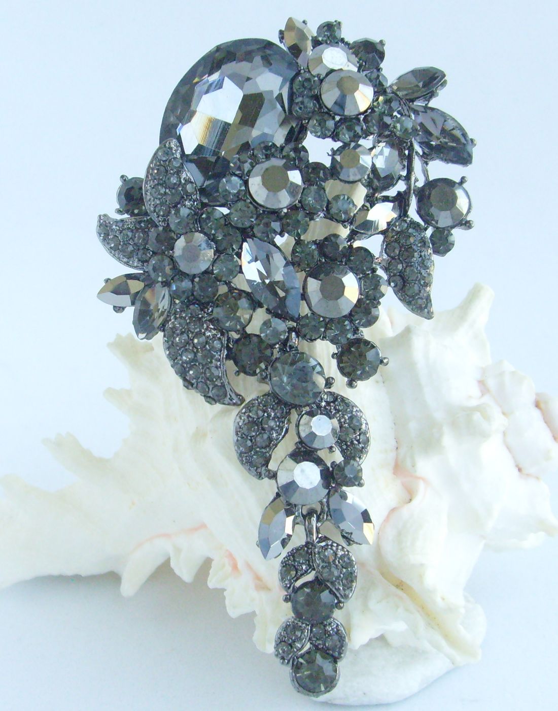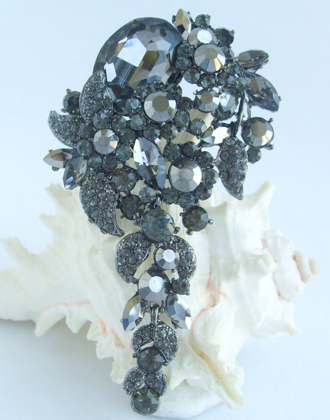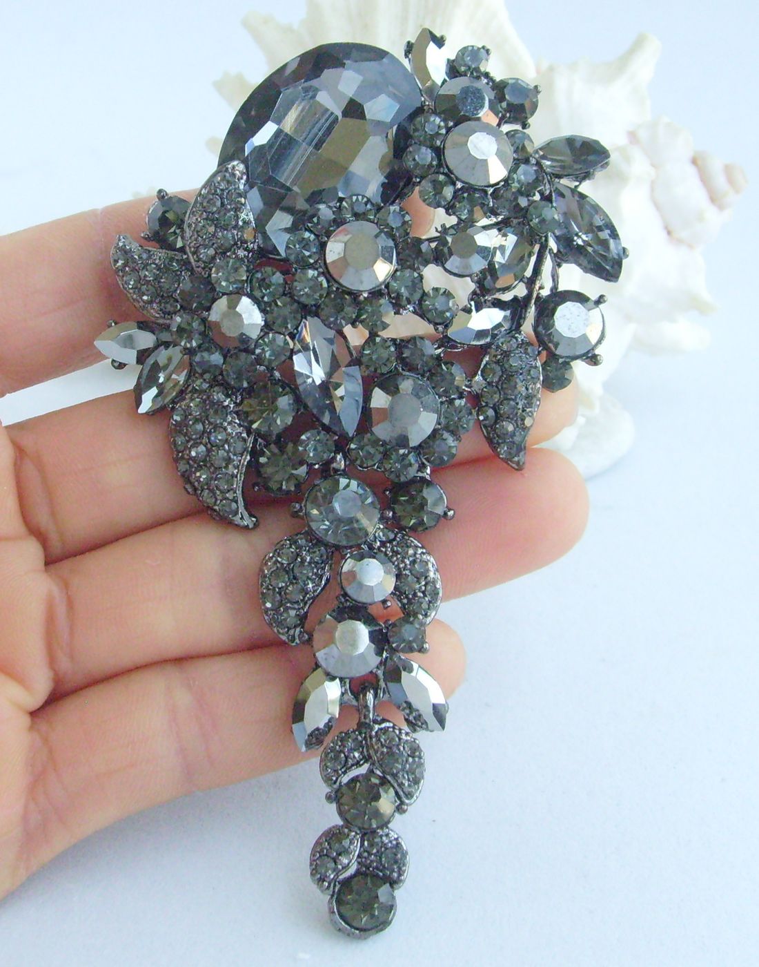 Sindary 4 Inch Rhinestone Crystal Teardrop Flower Brooch Pin Pendant BP06524 (Black-Tone Black Gray) 50g