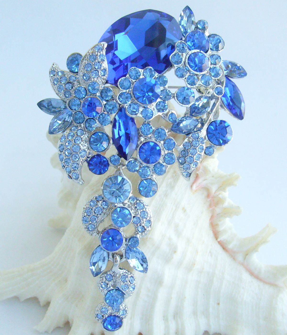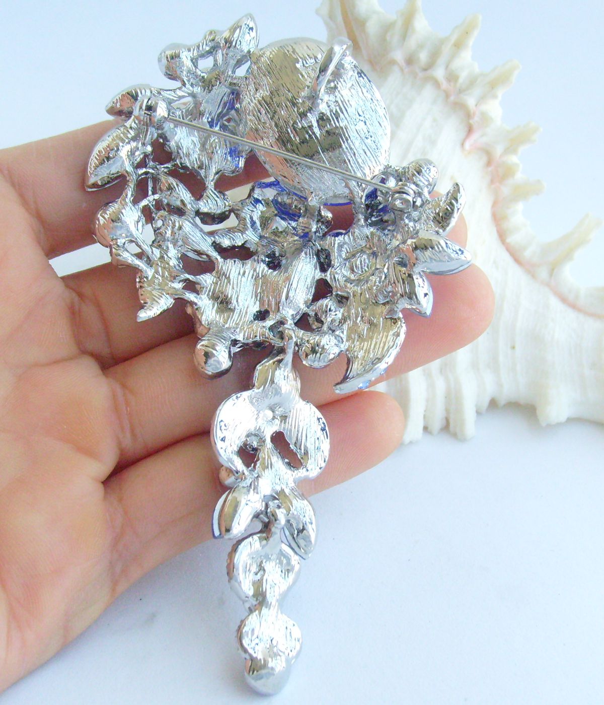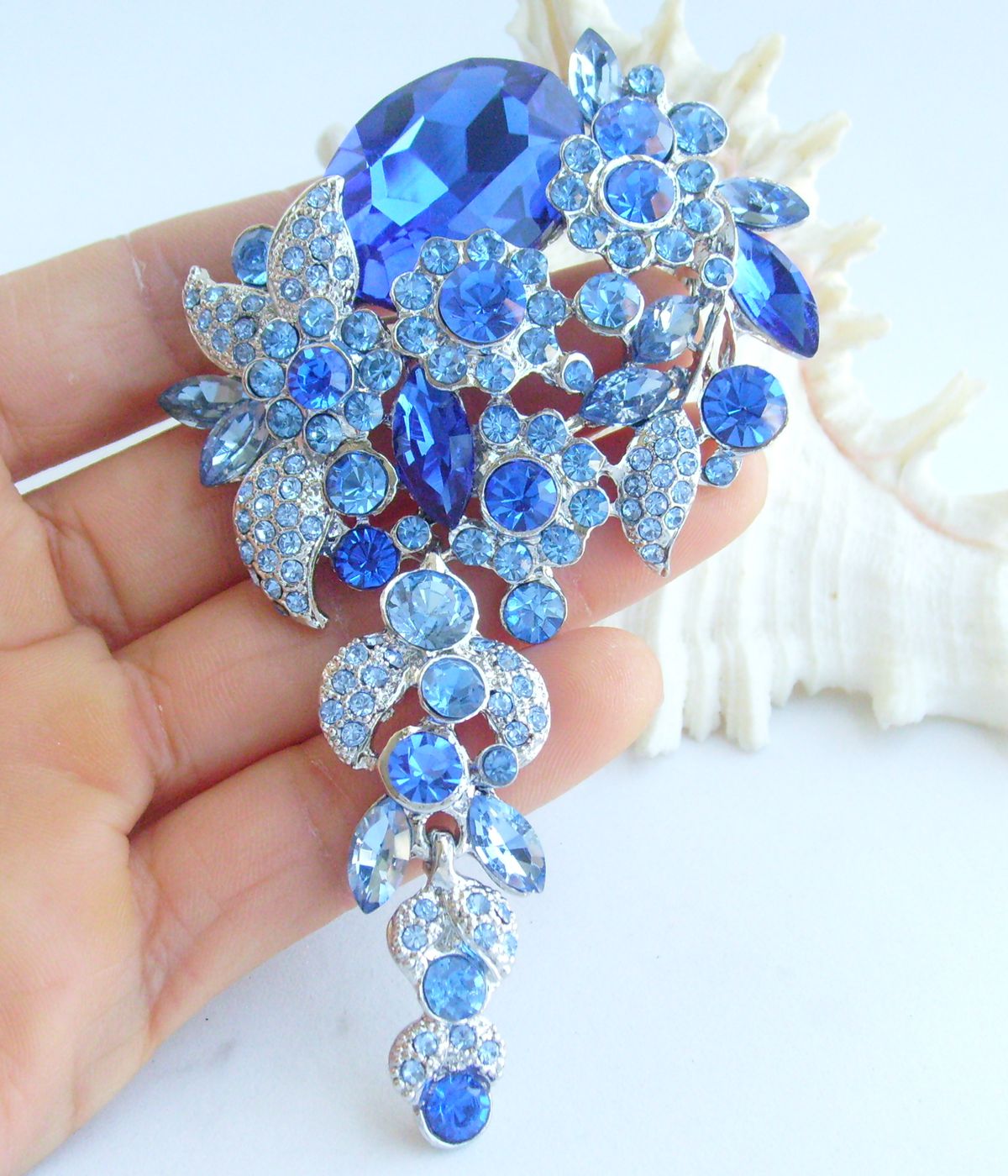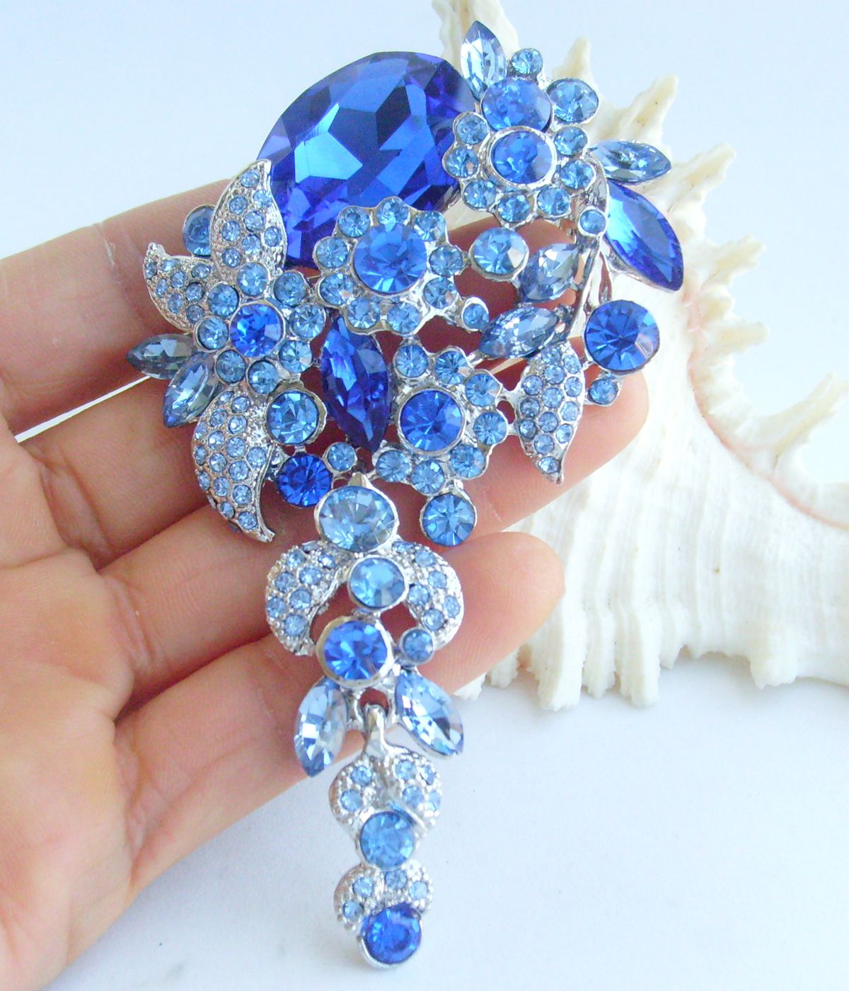 Sindary 4 Inch Rhinestone Crystal Teardrop Flower Brooch Pin Pendant BP06524 (Silver-Tone Blue) 50g