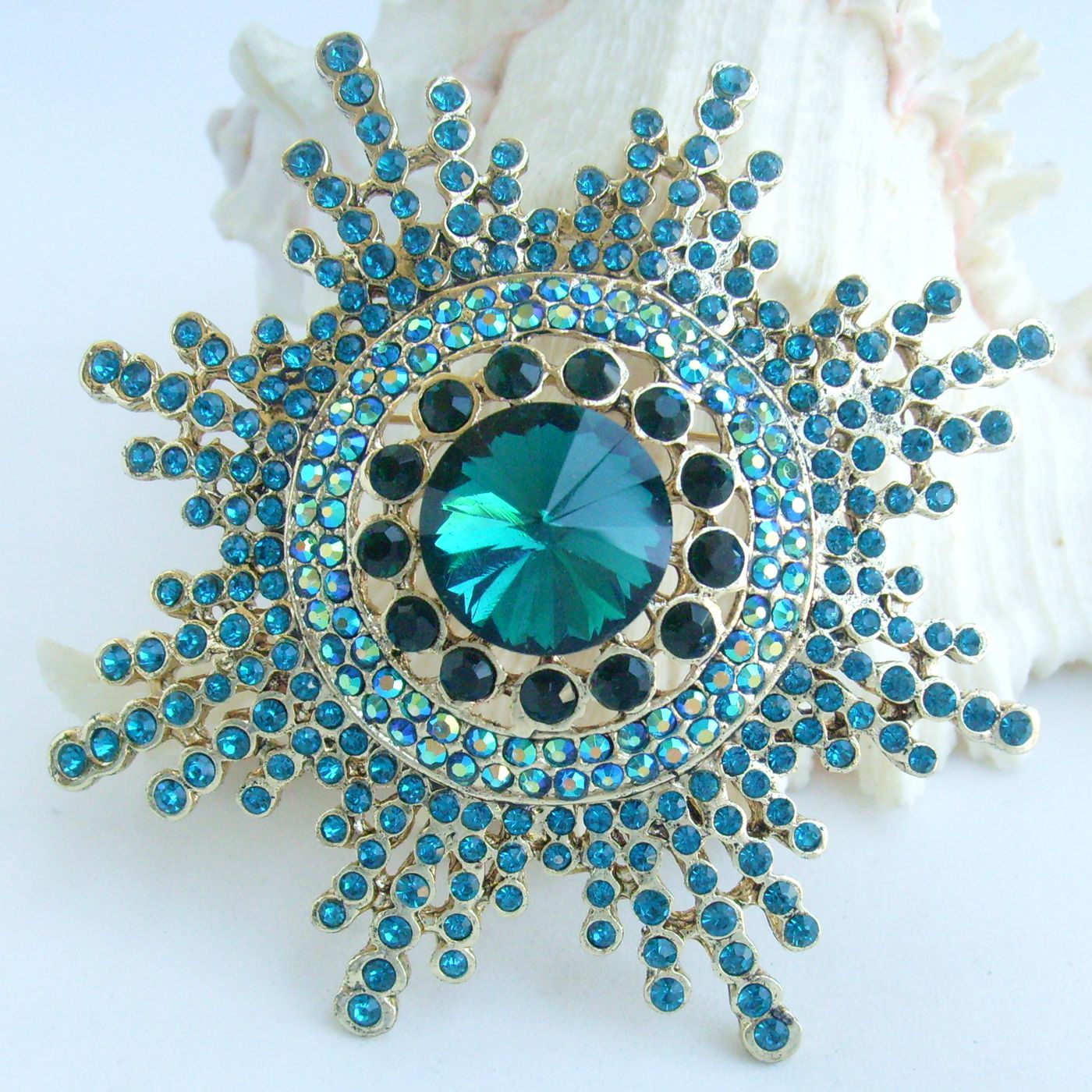 Sindary 3 Inch Austrian Crystal Pin Sunflower Brooch Pin Pendant Boxed BP06014 (Gold-Tone Turquoise) 40g