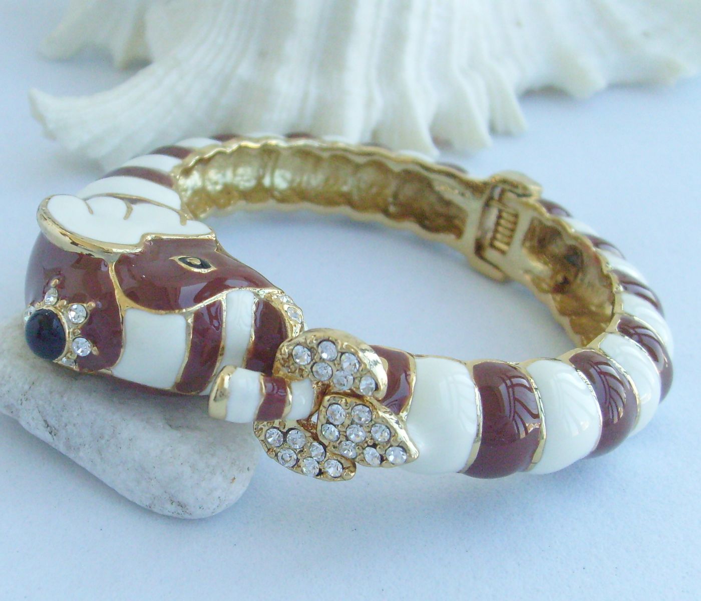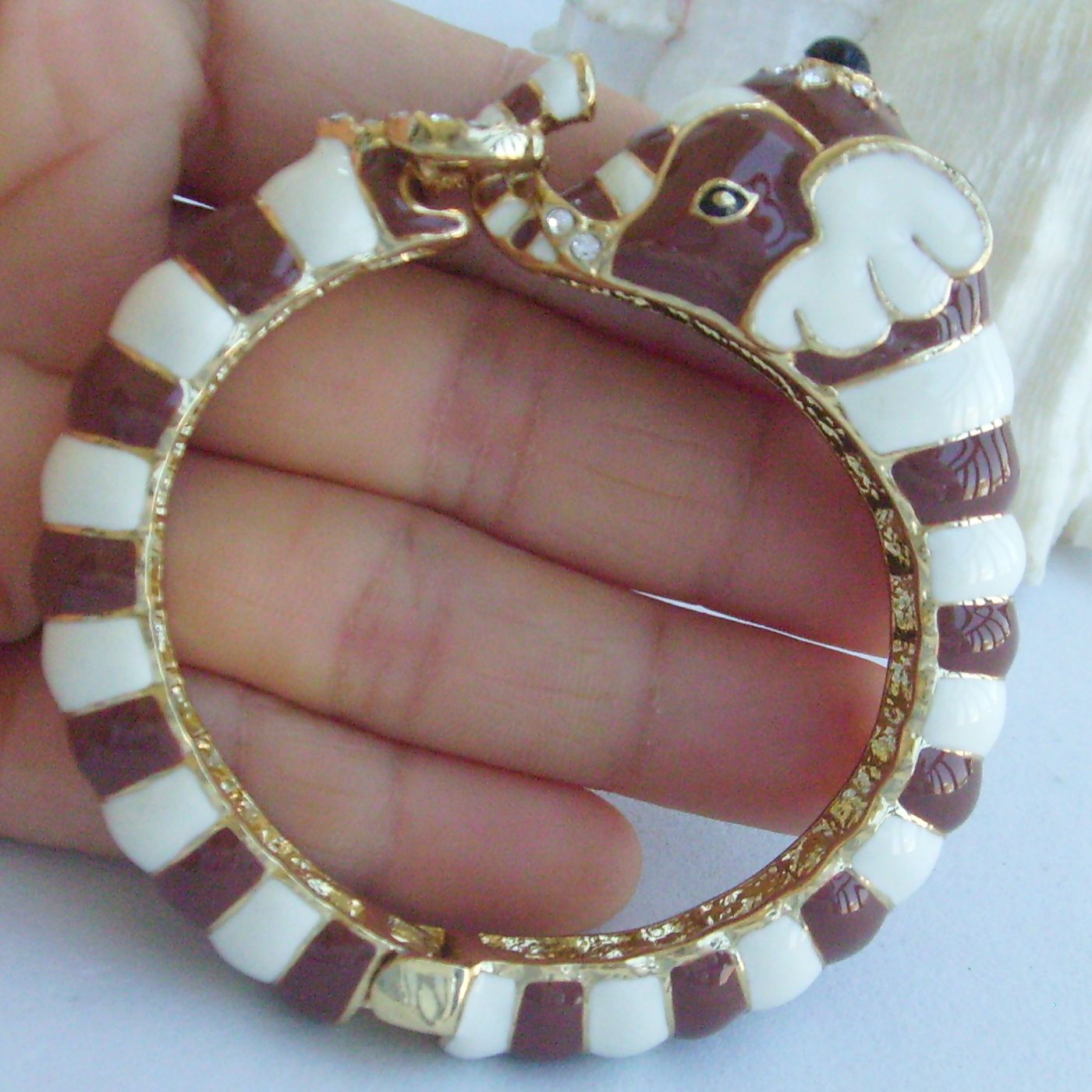 Sindary Unique Animal Elephant Bracelet Bangle Cuff Clear Austrian Crystal BCL509 (Gold-Tone Brown White Enamel Stripe)