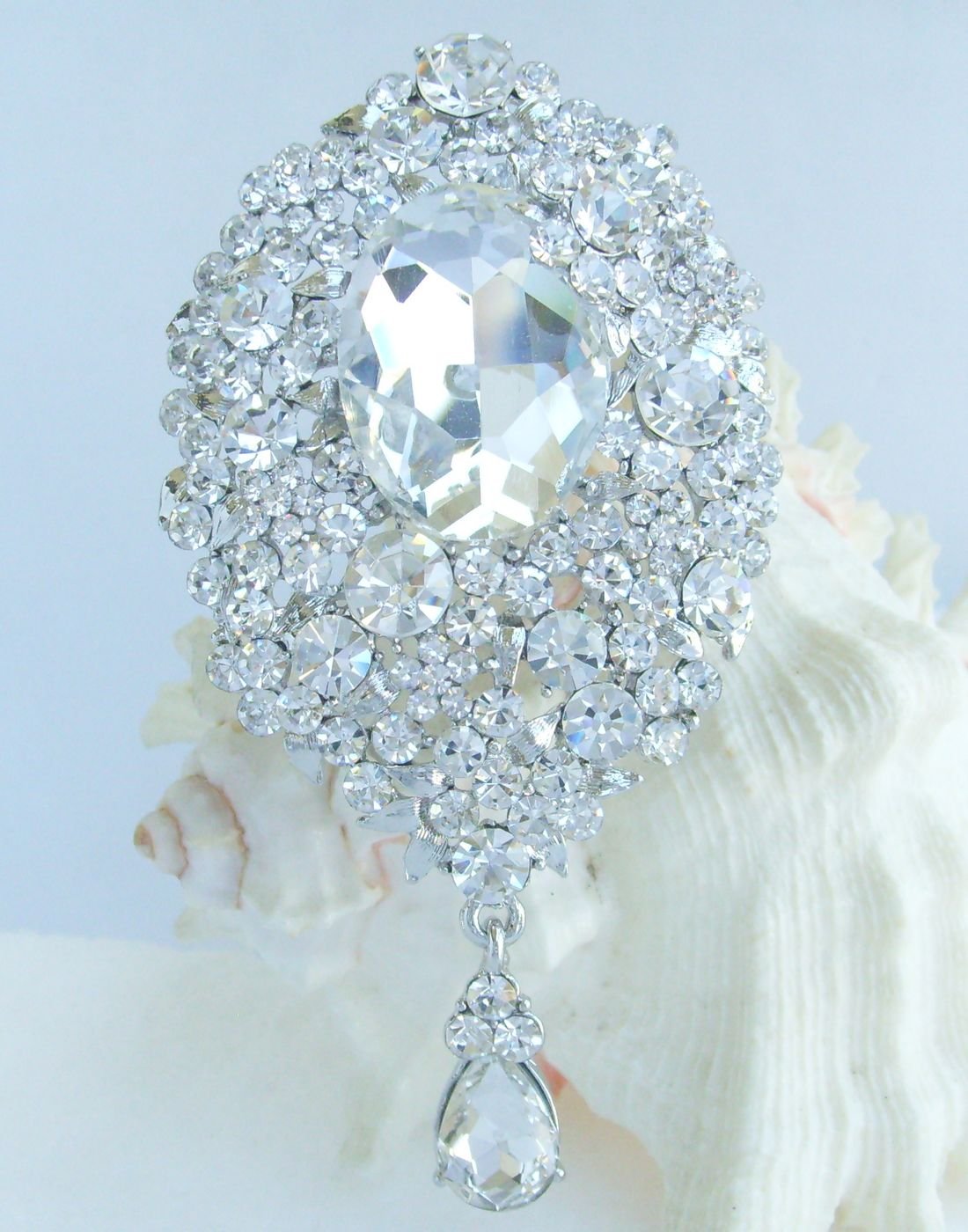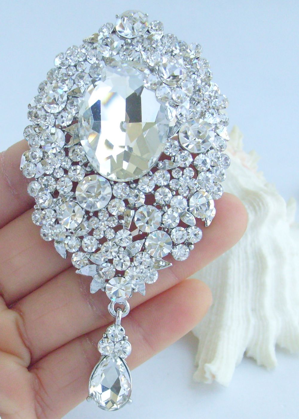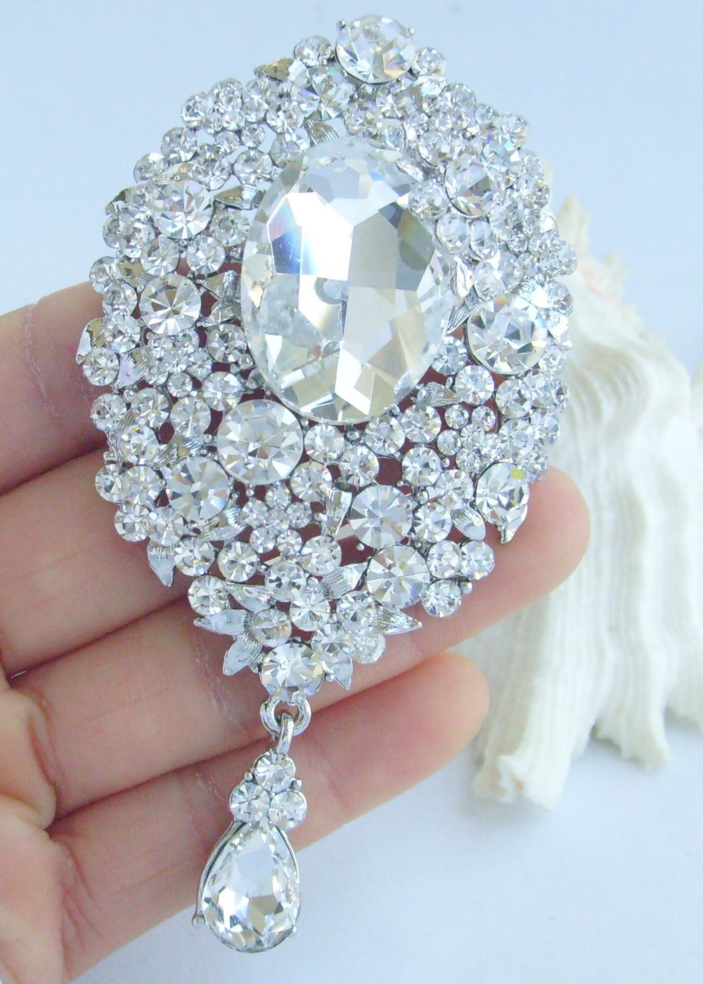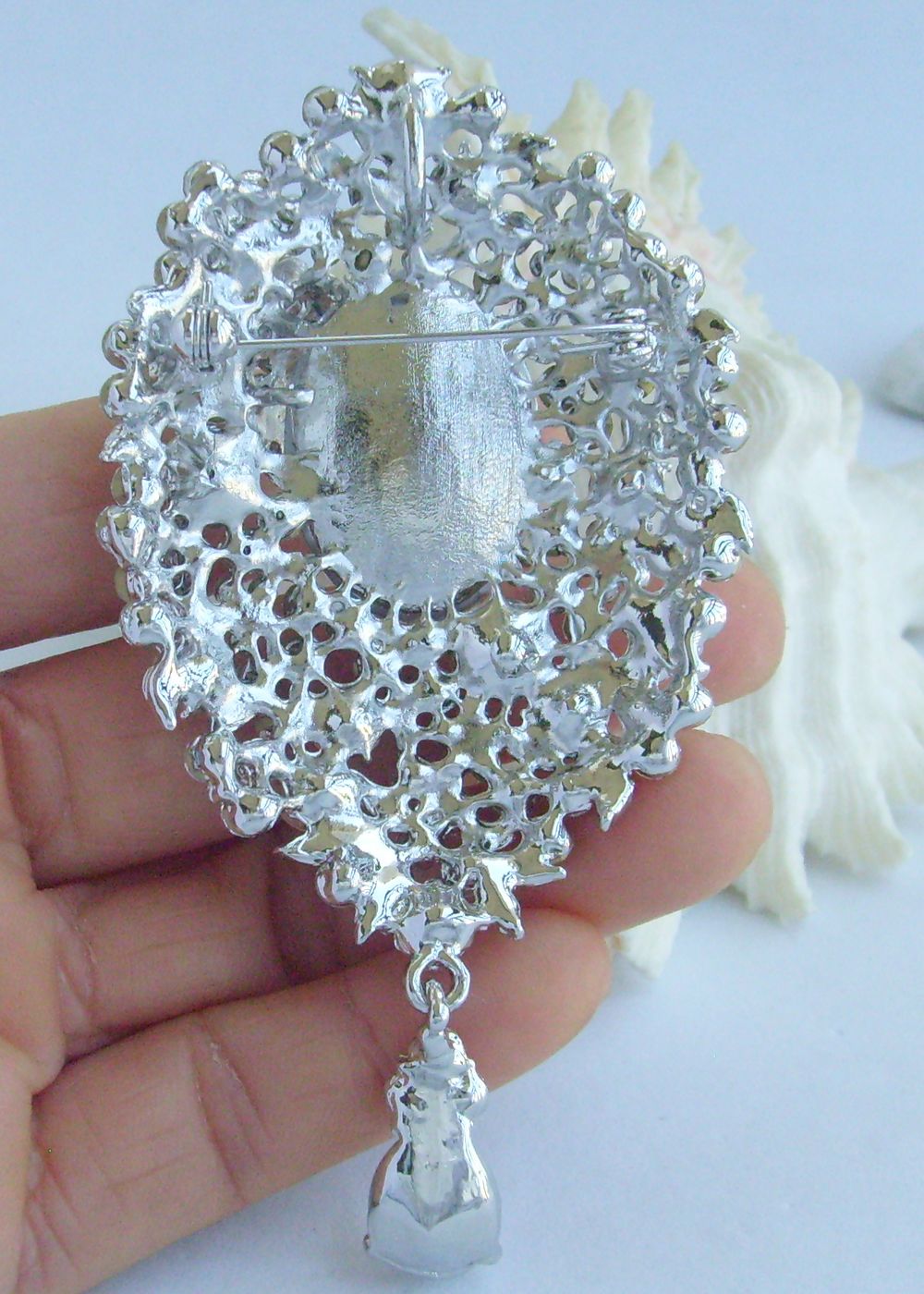 Sindary 3.9 Inch Rhinestone Crystal Teardrop Brooch Pin Pendant BP04882 (Silver-Tone Clear) 40g