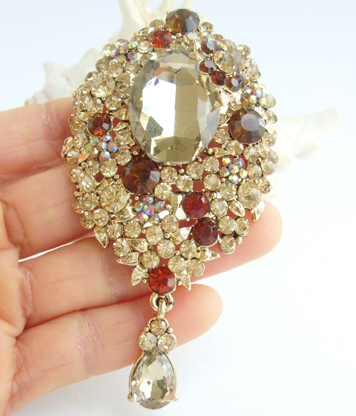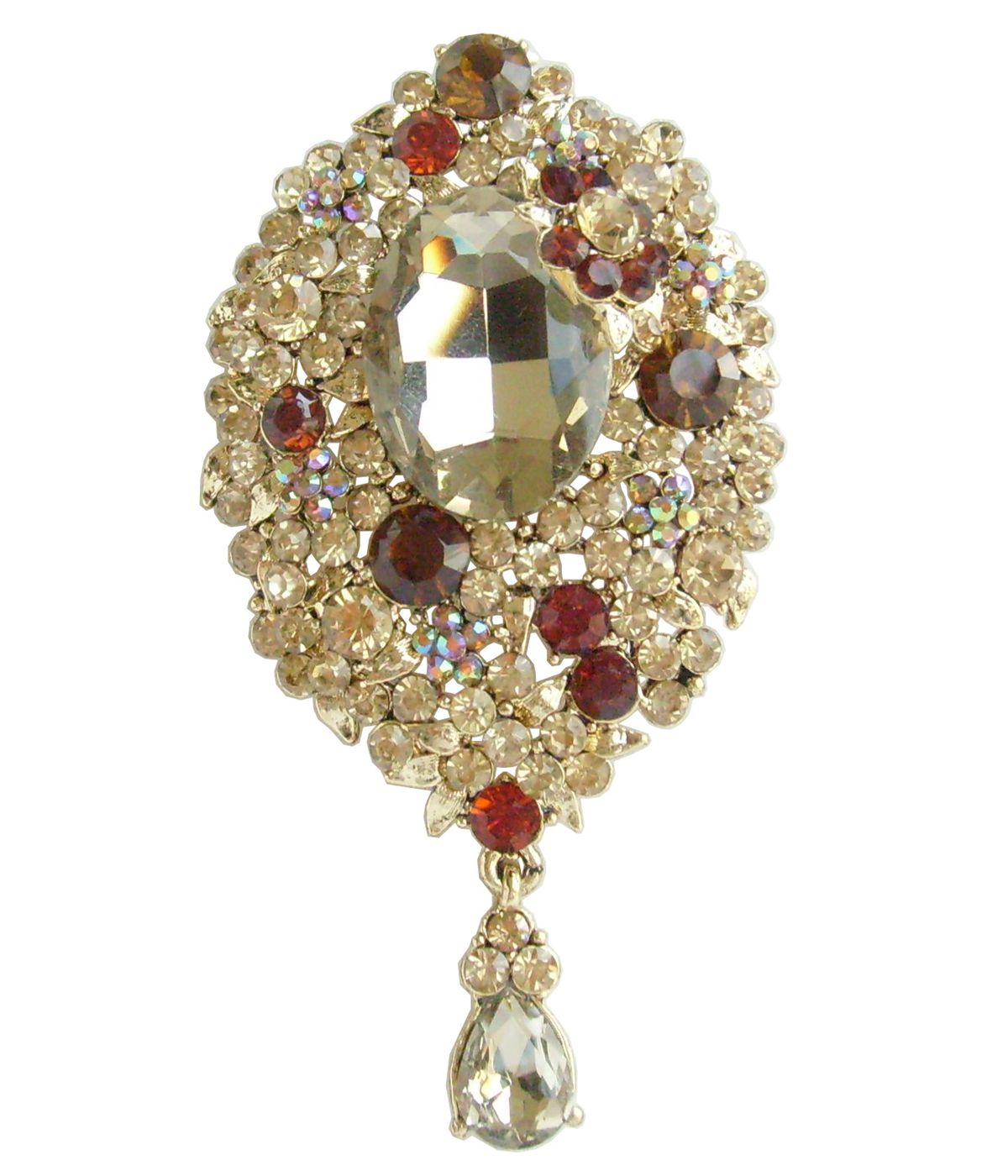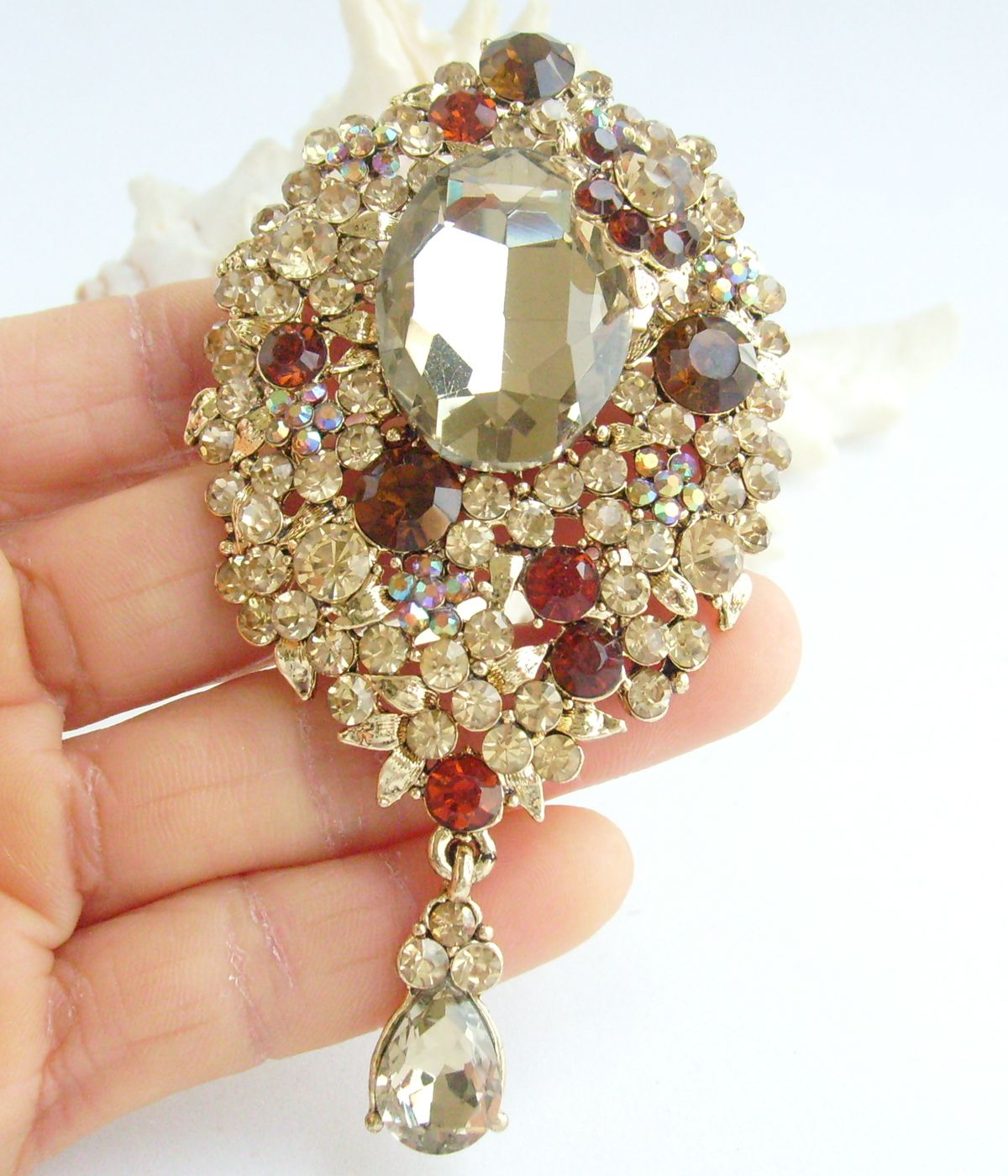 Sindary 3.9 Inch Rhinestone Crystal Teardrop Brooch Pin Pendant BP04882 (Gold-Tone Brown) 40g