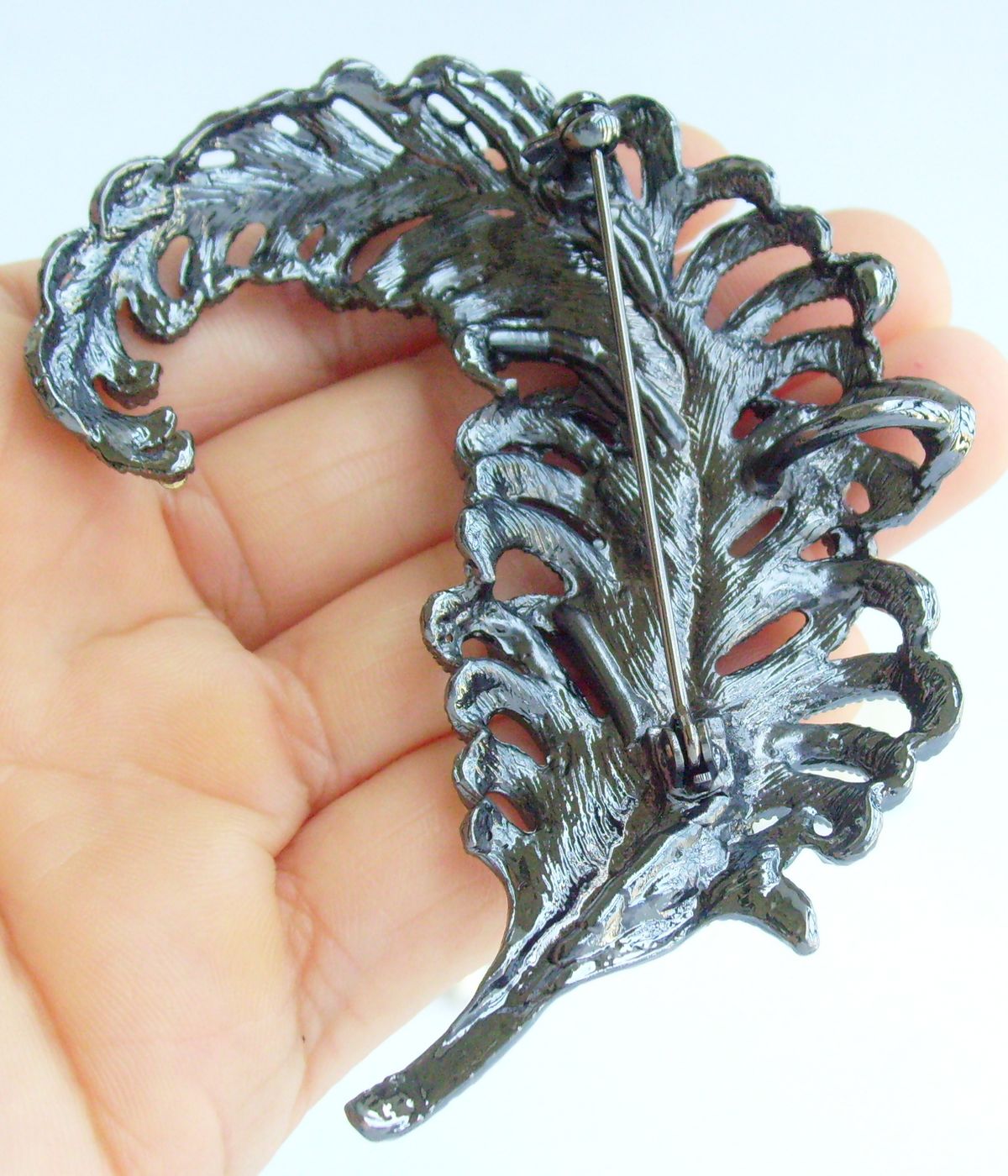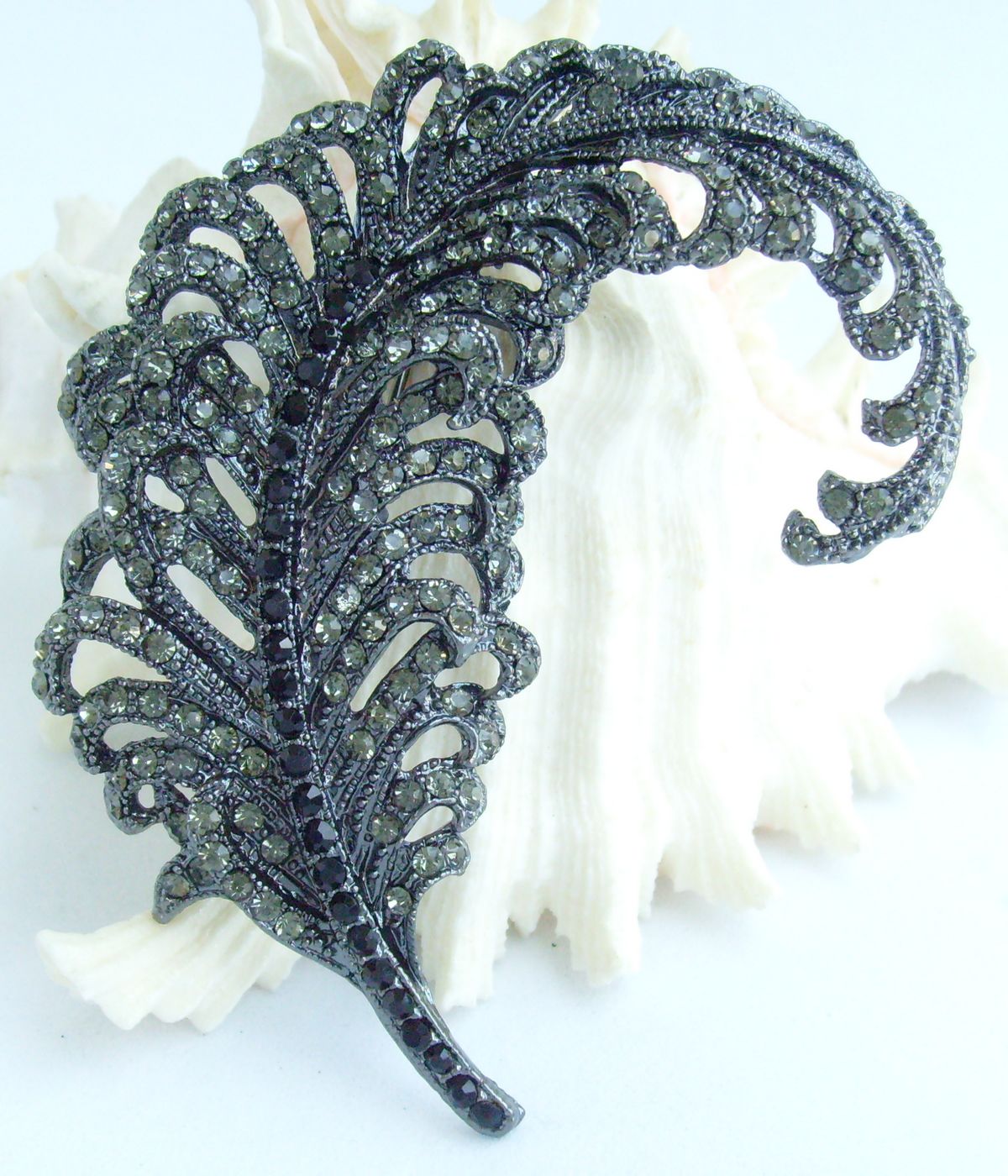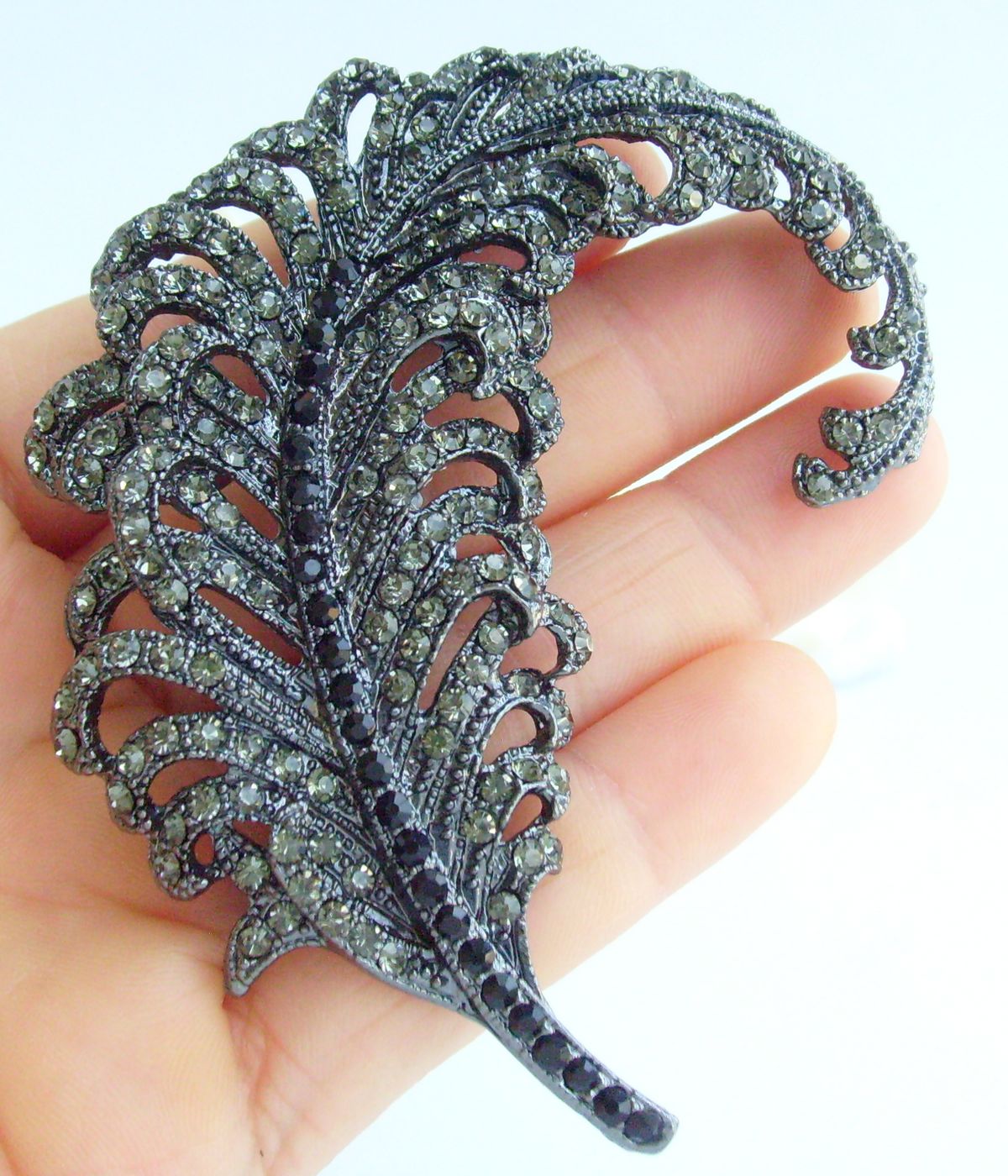 Sindary Rhinestone Crystal Feather Brooch Pin Pendant BP05065 (Black-Tone Black Gray) 40g