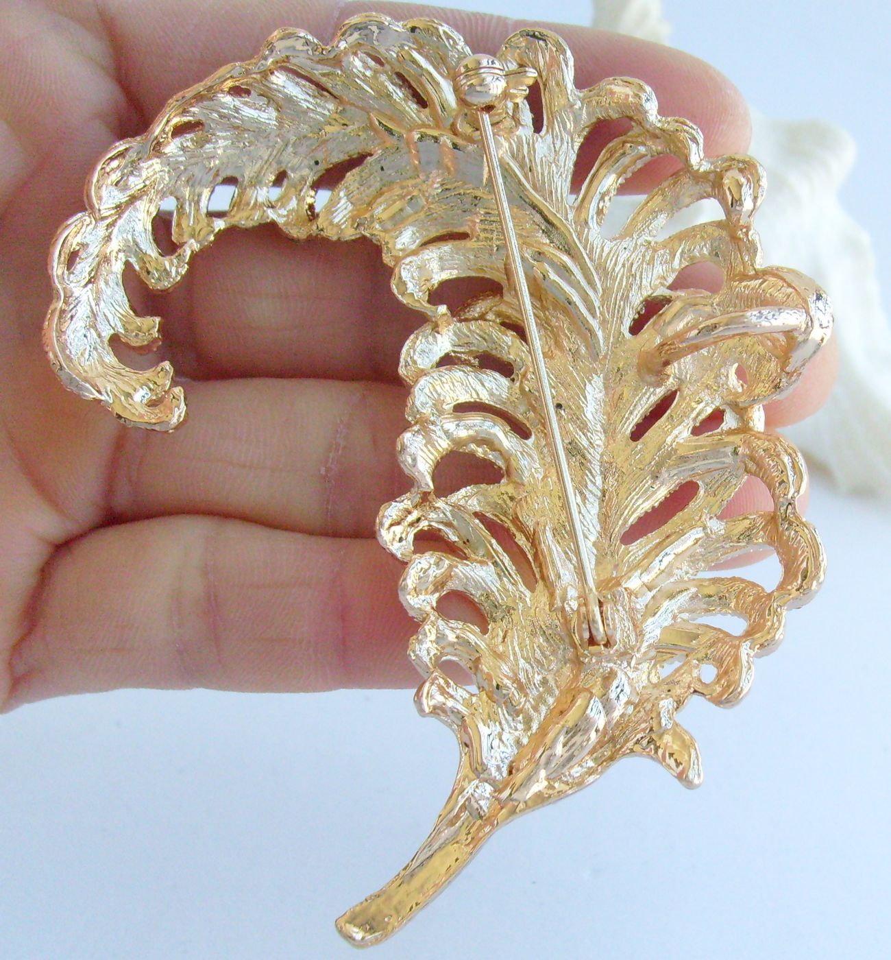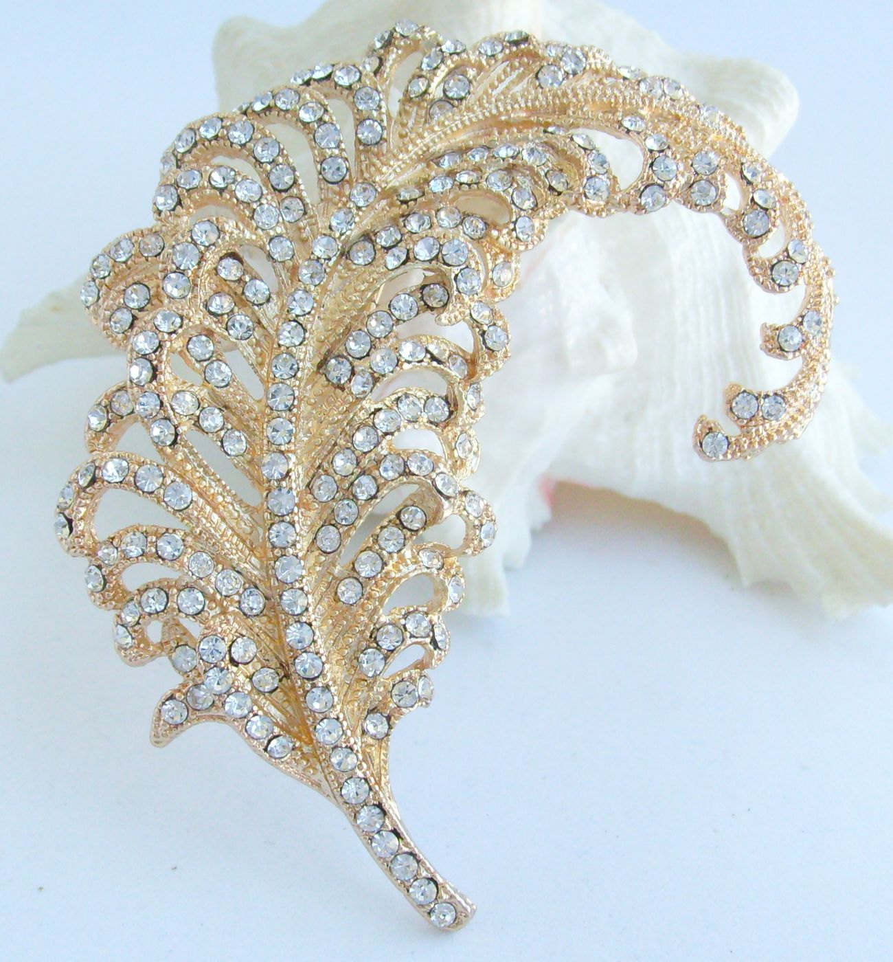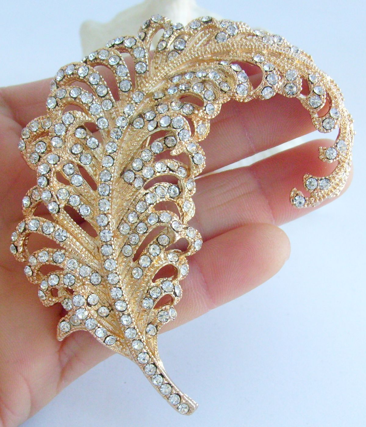 Sindary Rhinestone Crystal Feather Brooch Pin Pendant BP05065 (Gold-Tone Clear) 40g