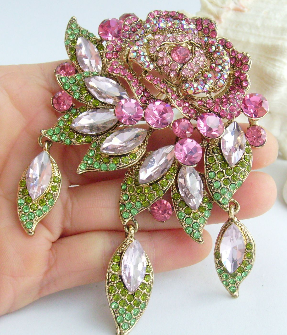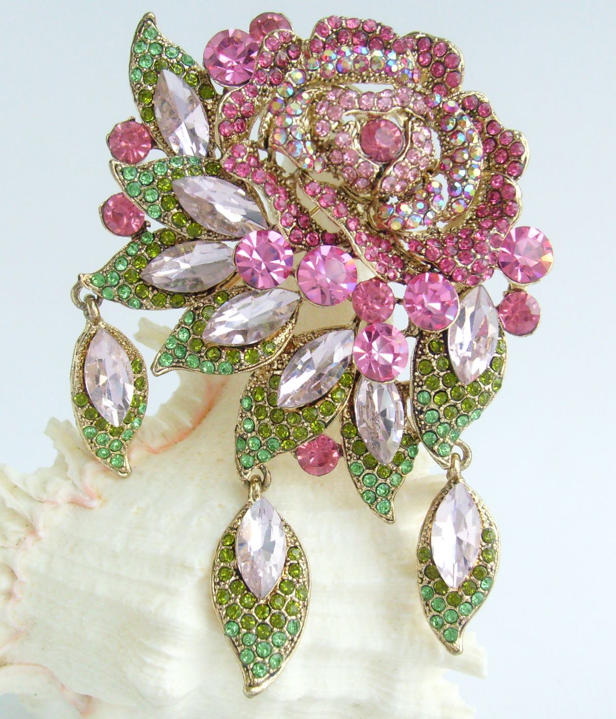 Sindary Jewelry 3.94 Inch Pretty Rhinestone Crystal Flower Brooch Pin Pendant BP06454 (Gold-Tone Pink) 65g