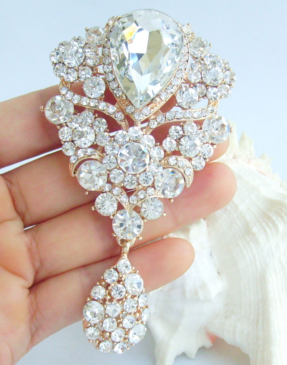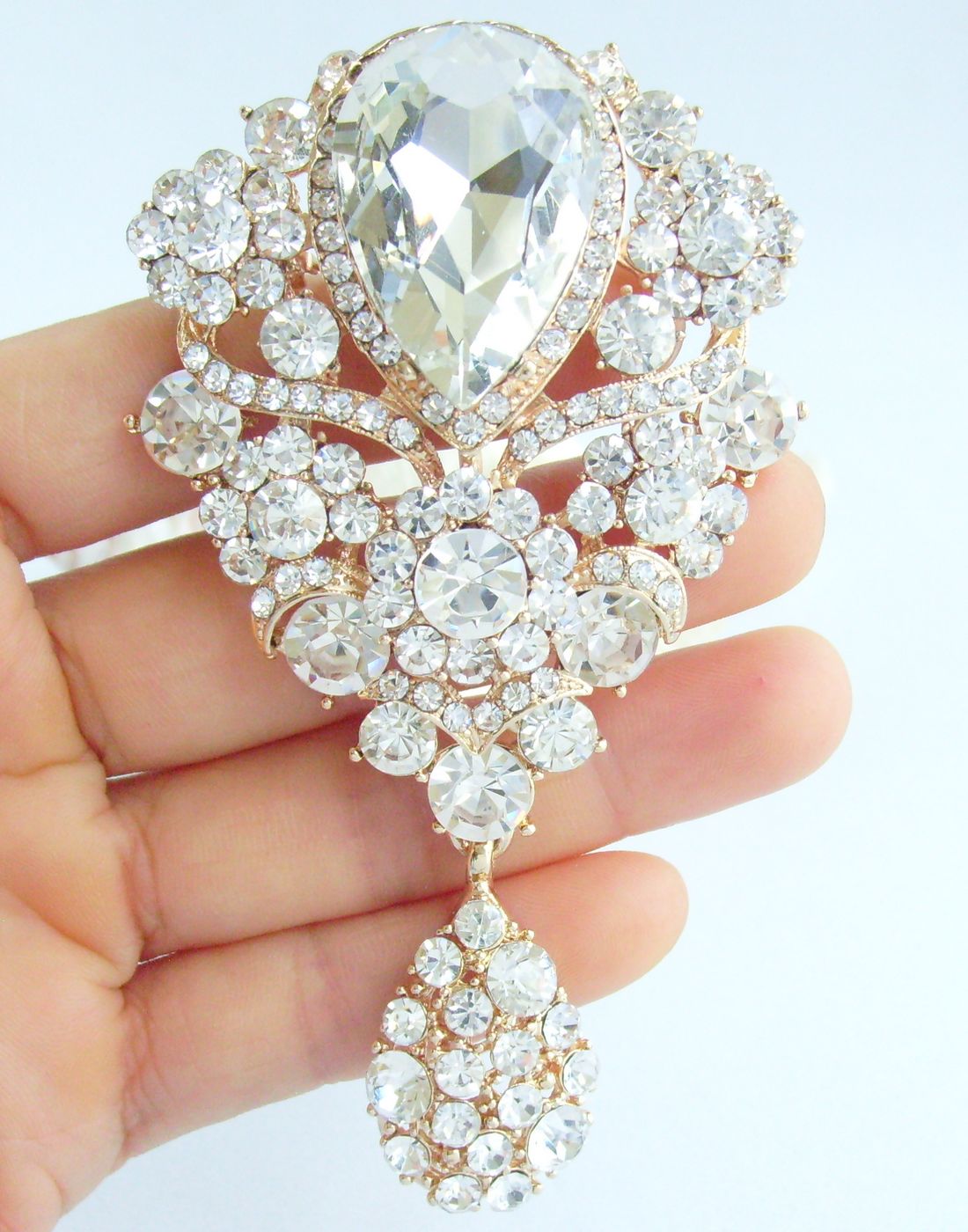 Sindary Rhinestone Crystal Teardrop Brooch Pin Pendant BP06024 (Gold-Tone Clear) 45g
