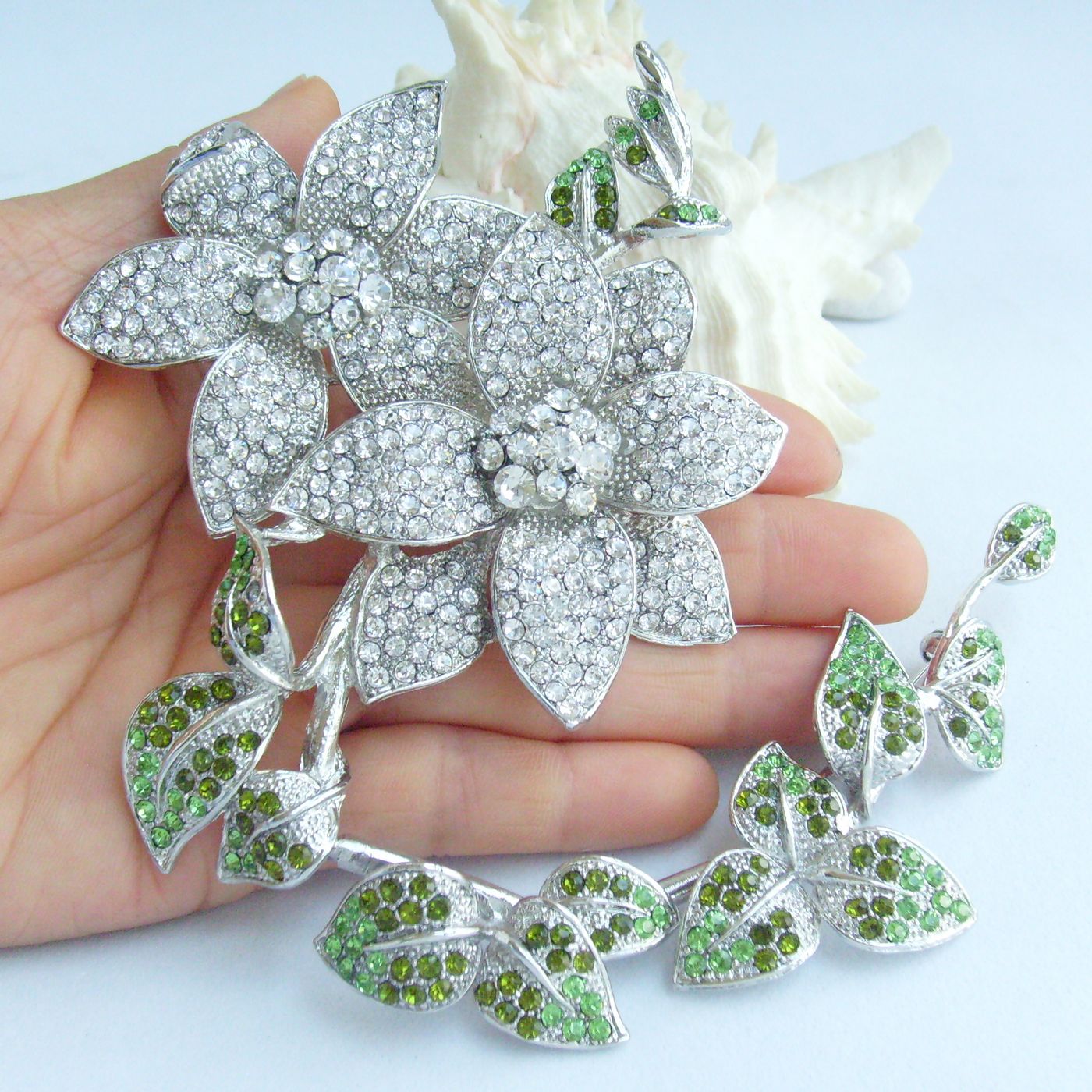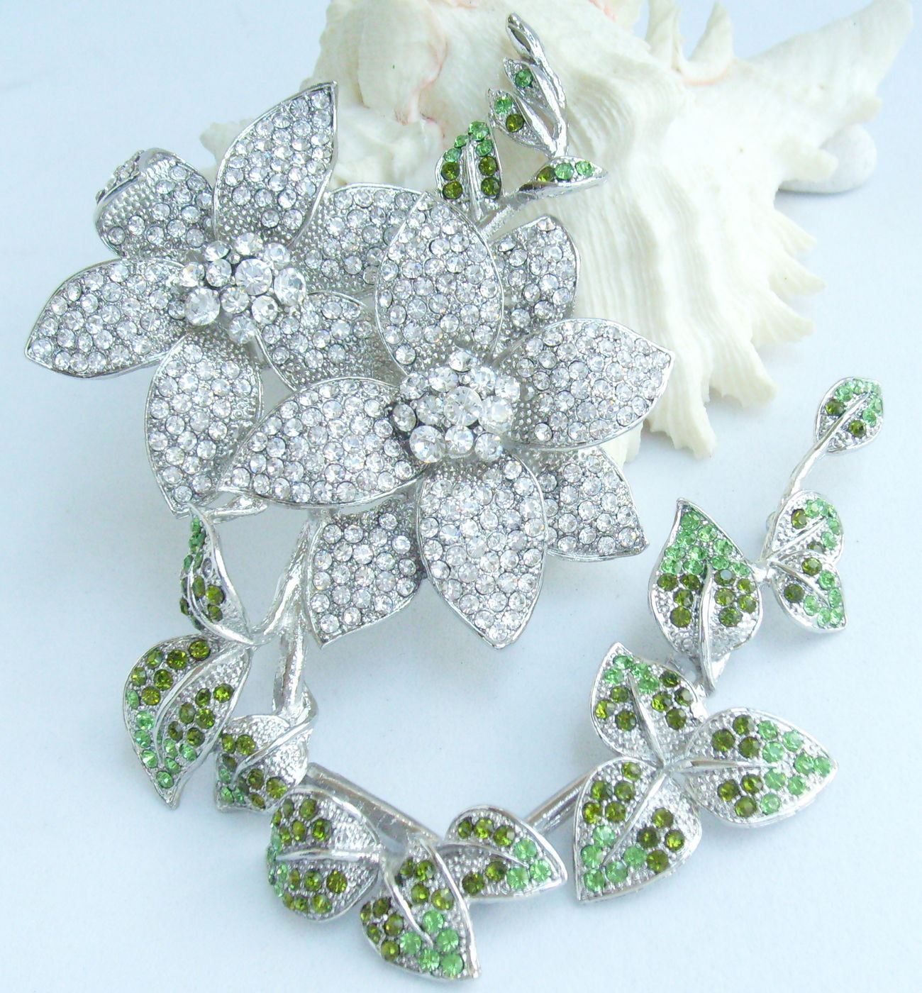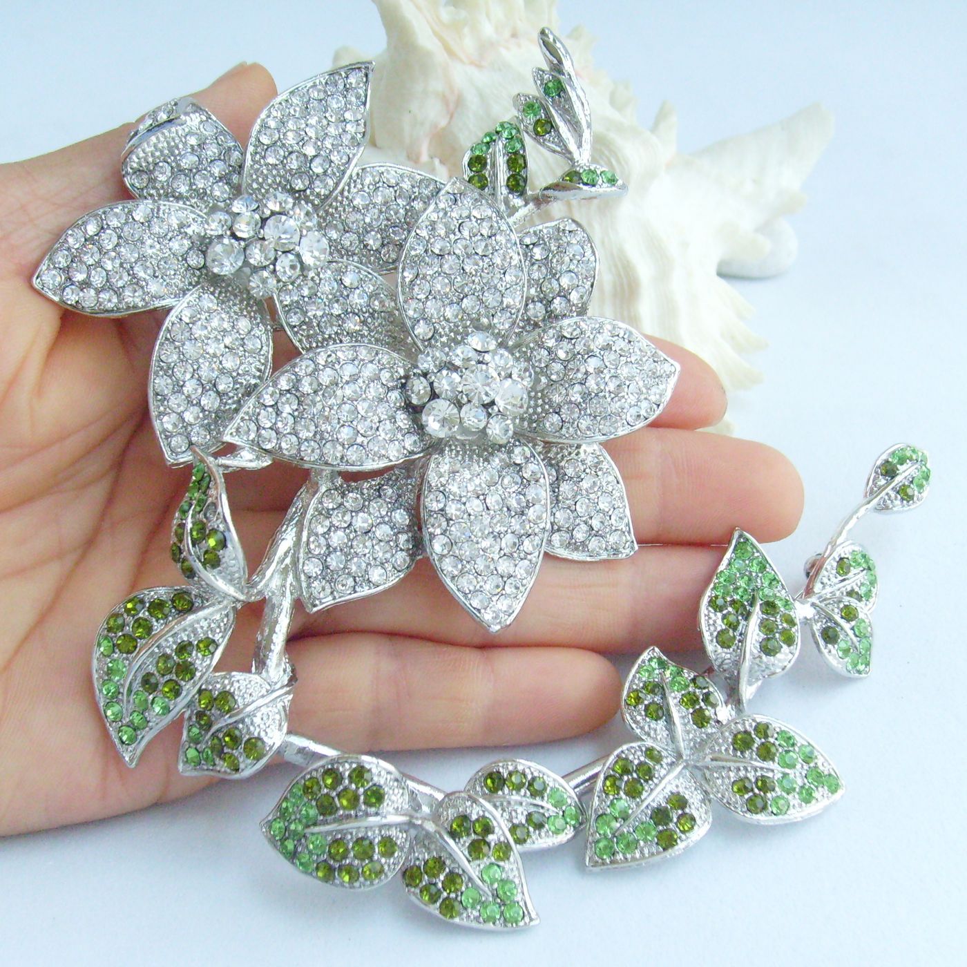 Sindary Elegant 8.8 Inch Rhinestone Crystal Long Flower Brooch Pin Pendant BP02957 (Silver-Tone Green Clear) 100g