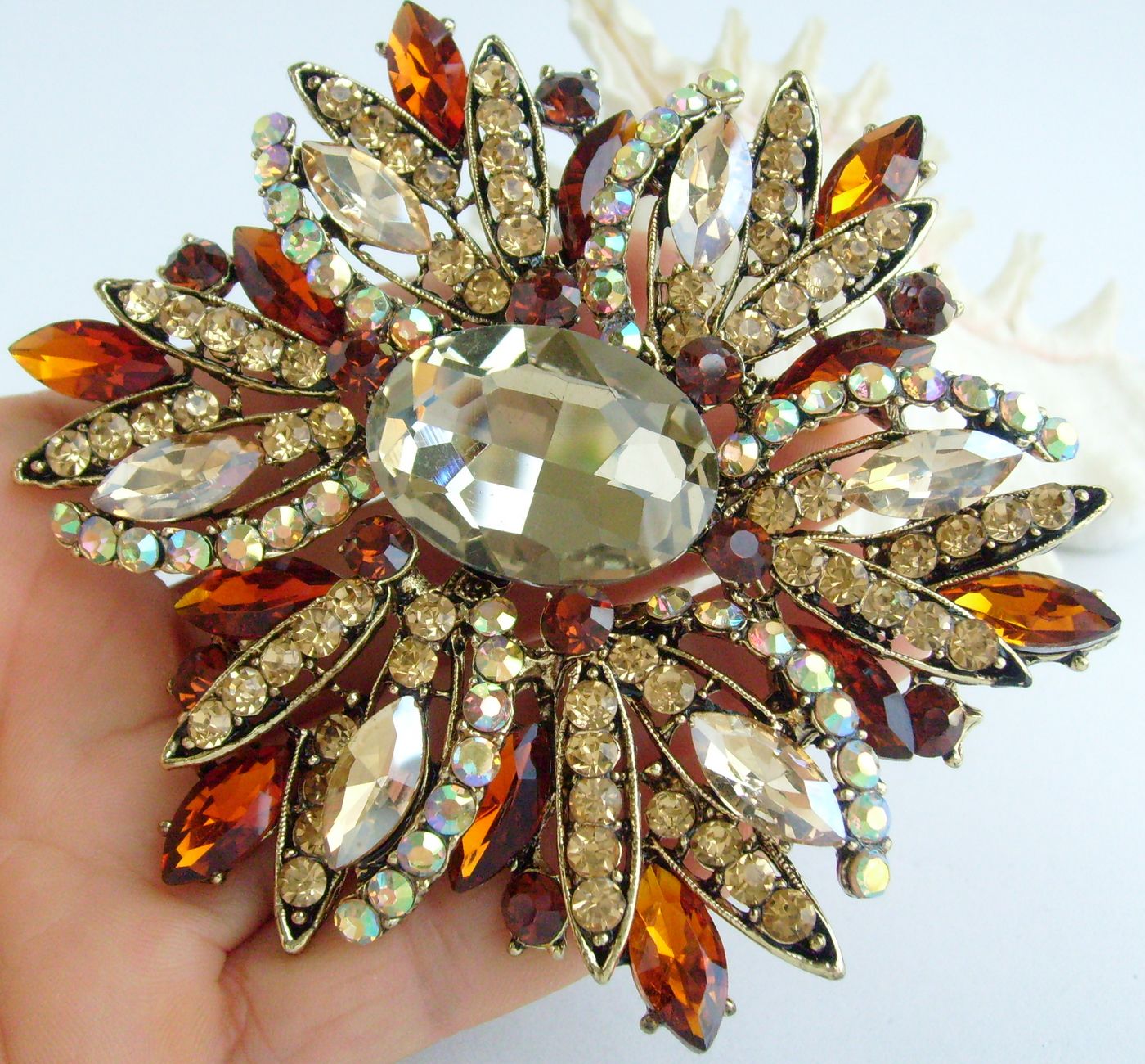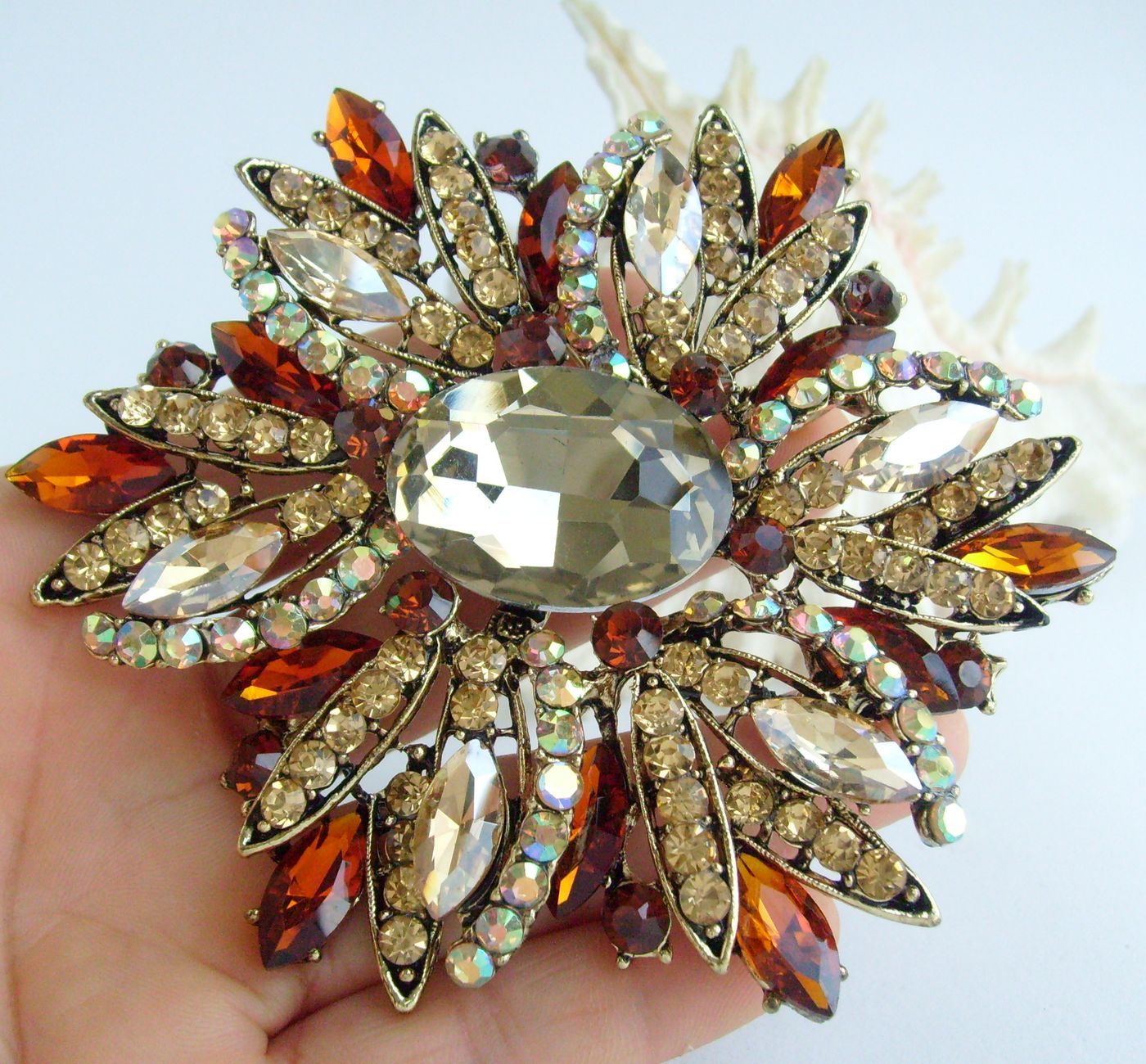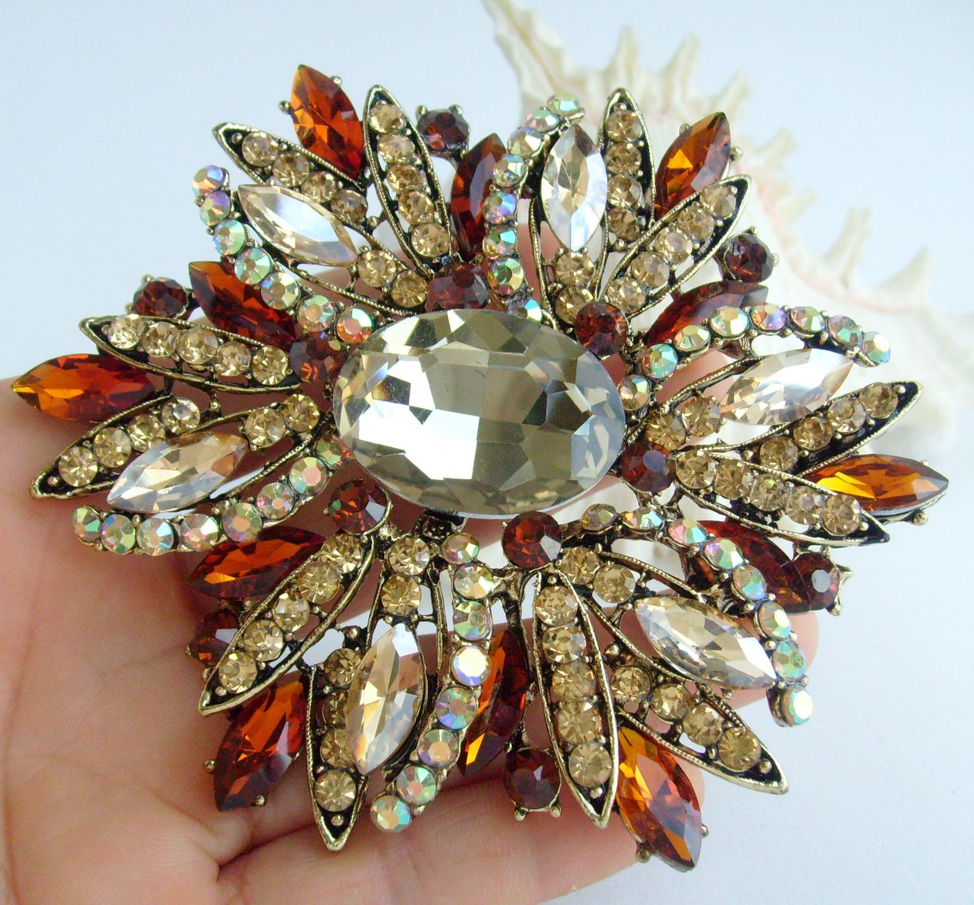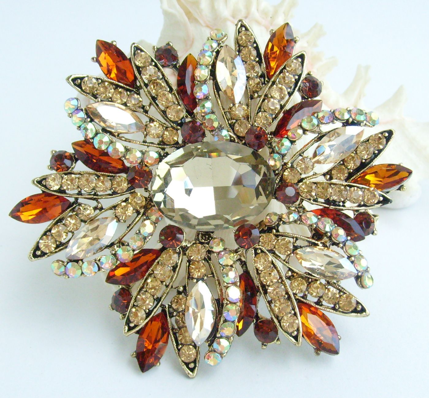 Sindary Classic 4 Inch Round Flower Brooch Pin Austrian Crystal Pendant Large Brooch for Women BP04053 (Gold-Tone Brown) 90g