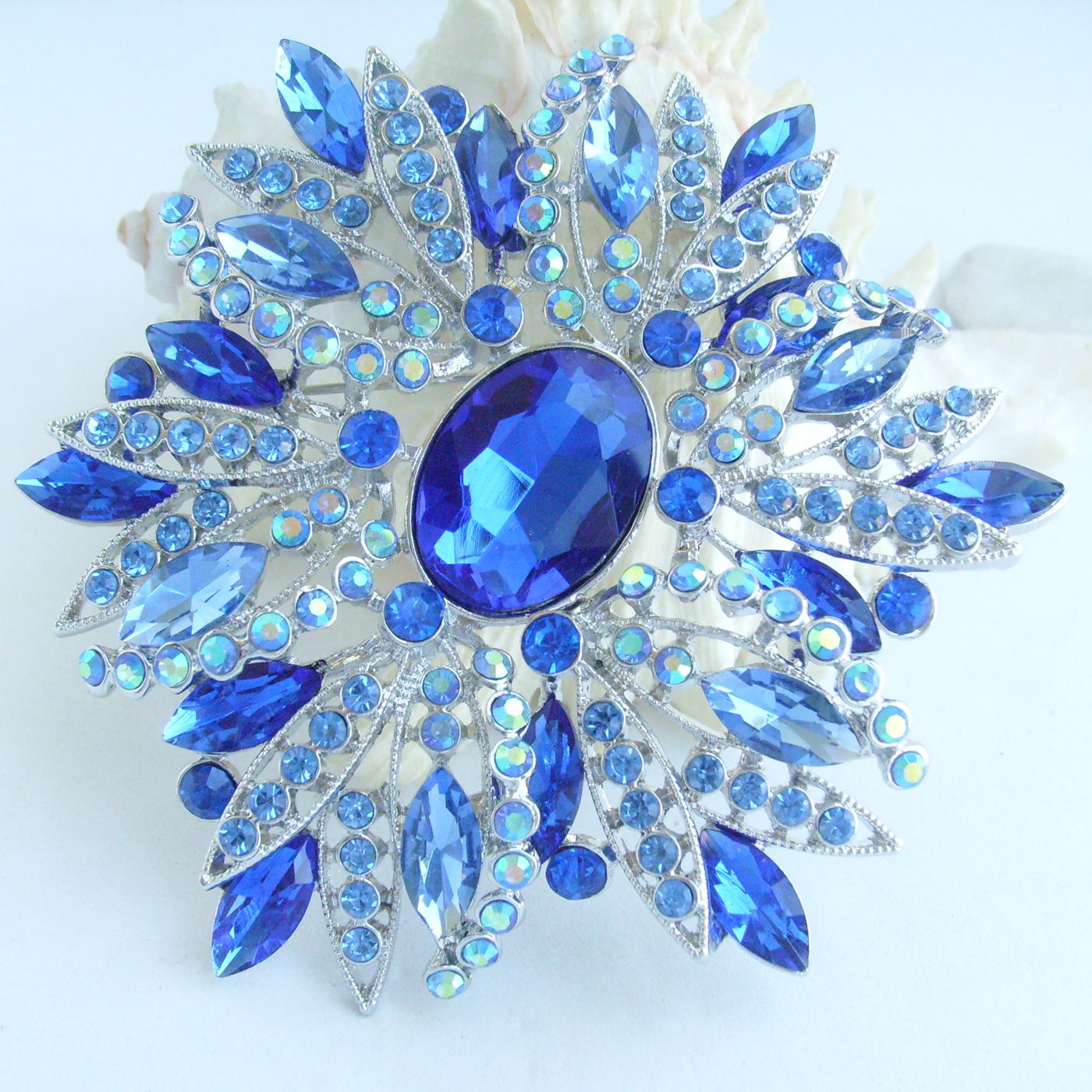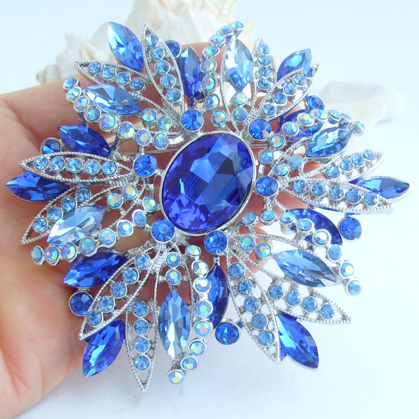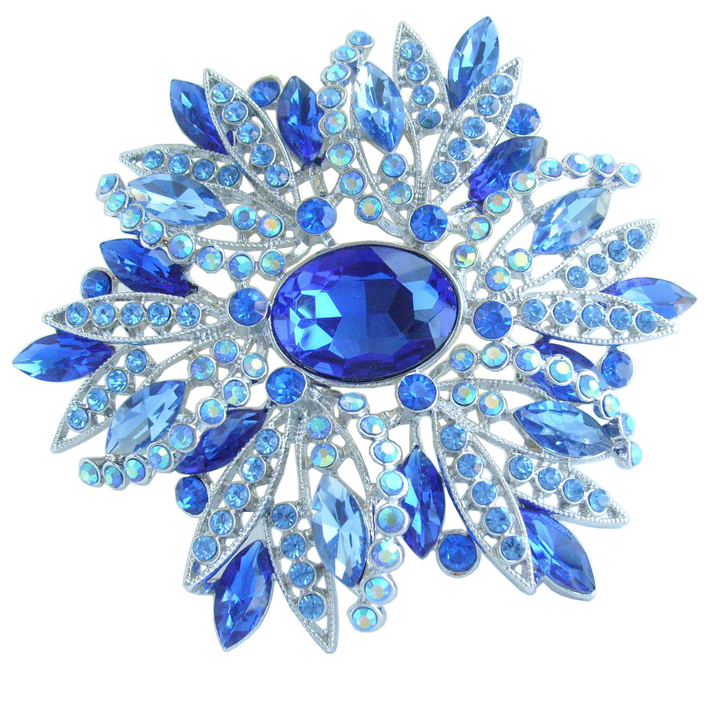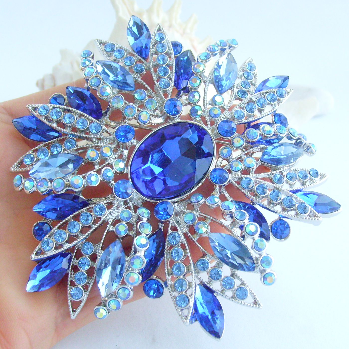Sindary Classic 4 Inch Round Flower Brooch Pin Austrian Crystal Pendant Large Brooch for Women BP04053 (Silver-Tone Blue) 90g