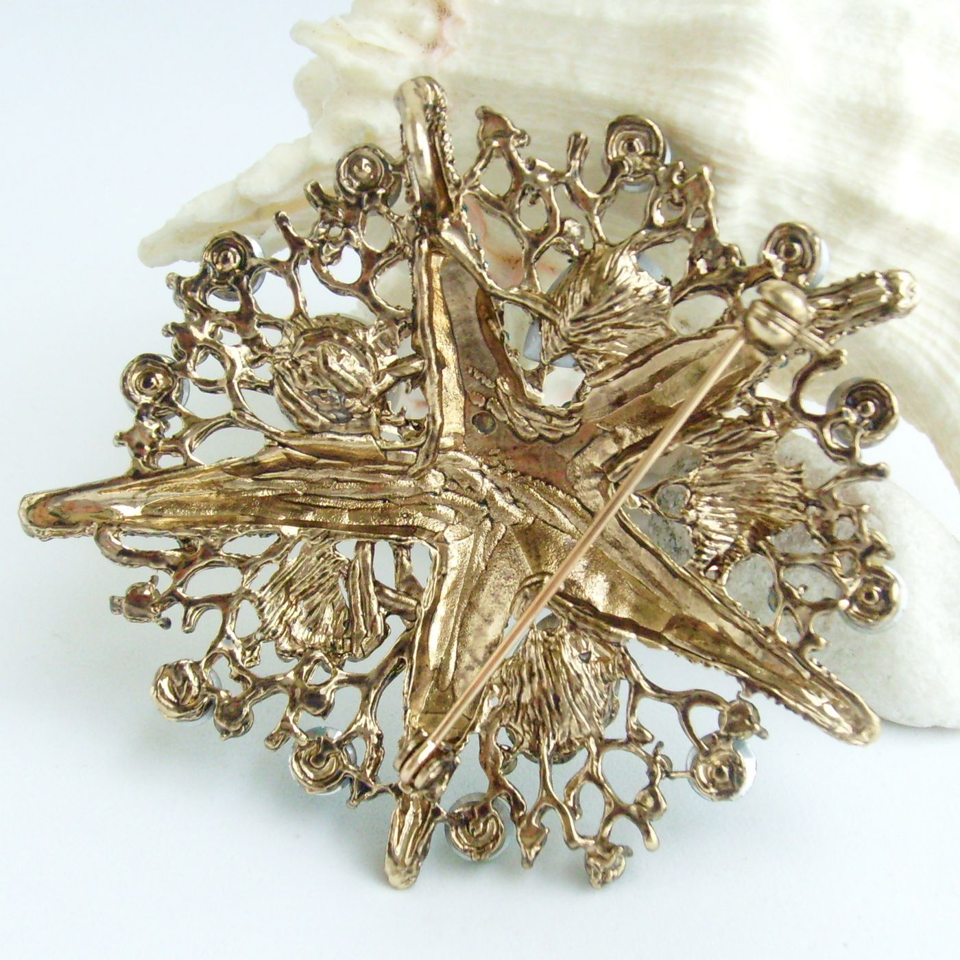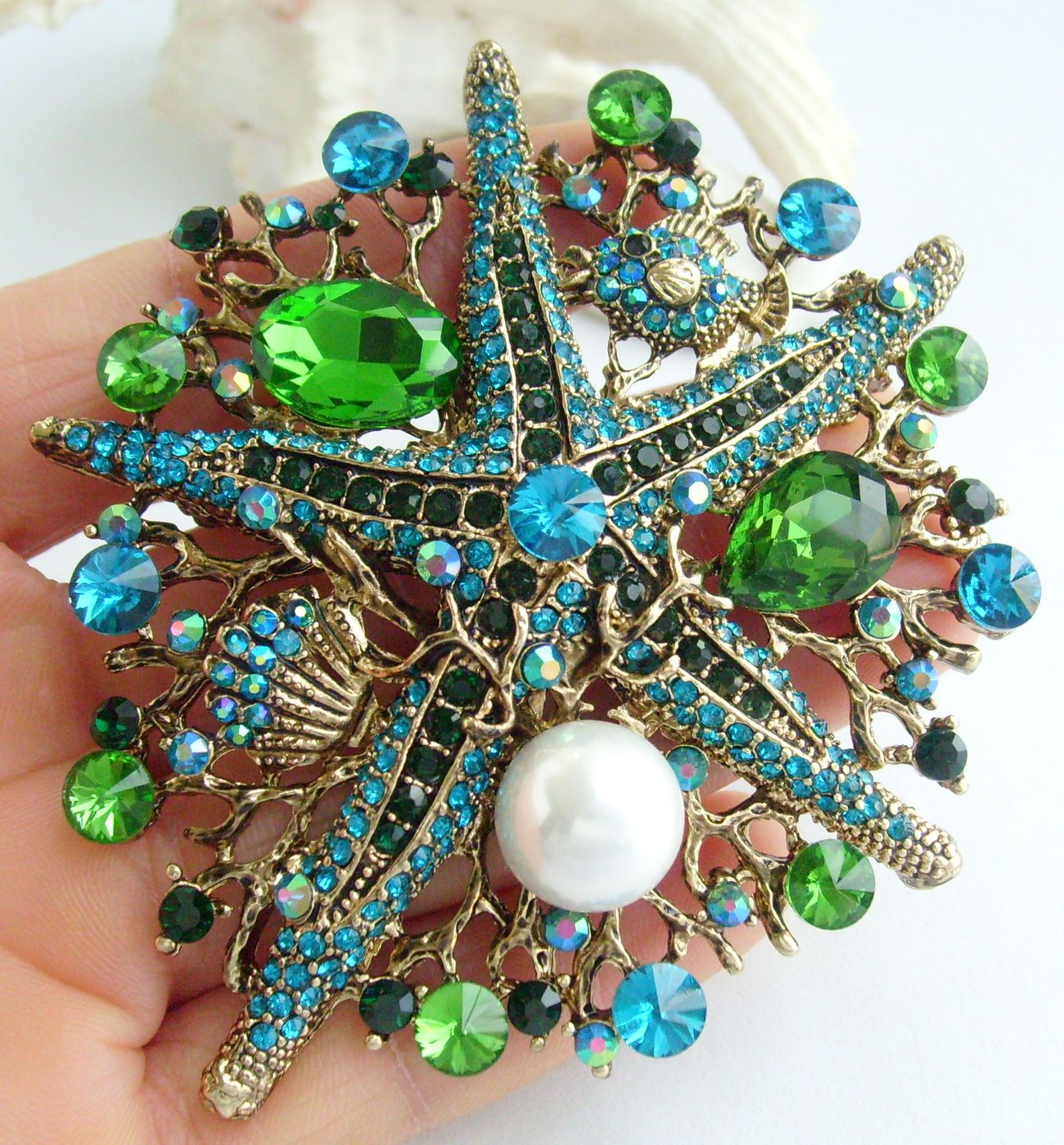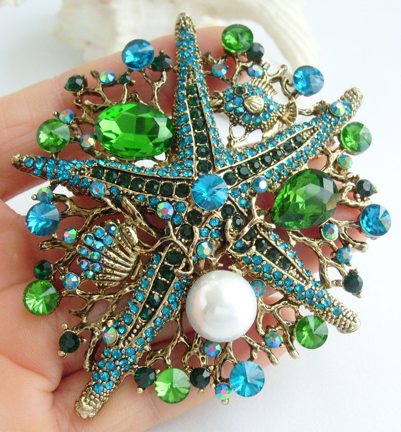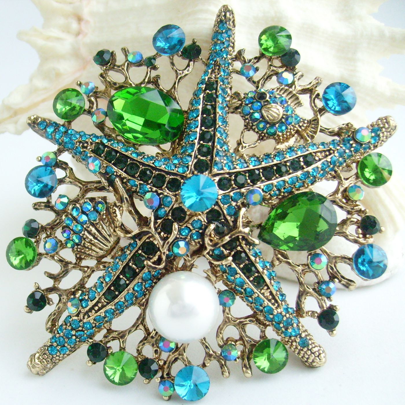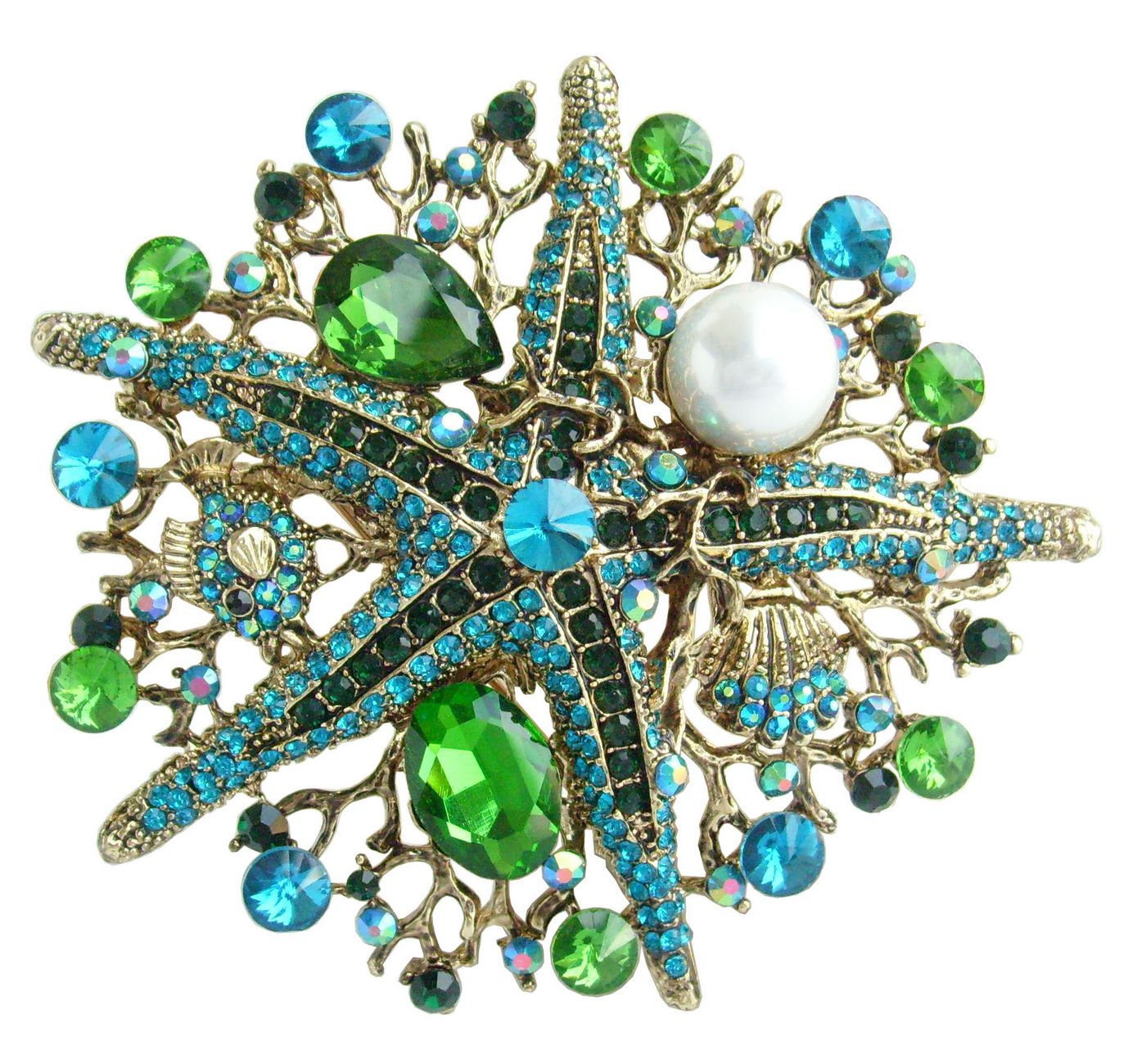 Sindary Rhinestone Crystal Starfish Brooch Pin Pendant BP06412 (Gold-Tone Green) 50g