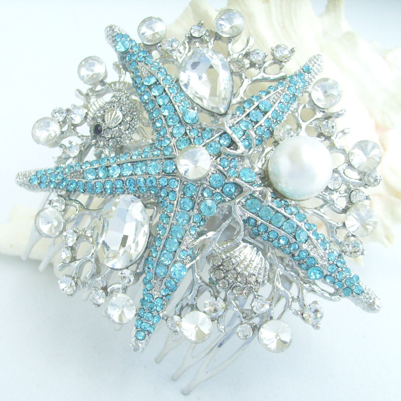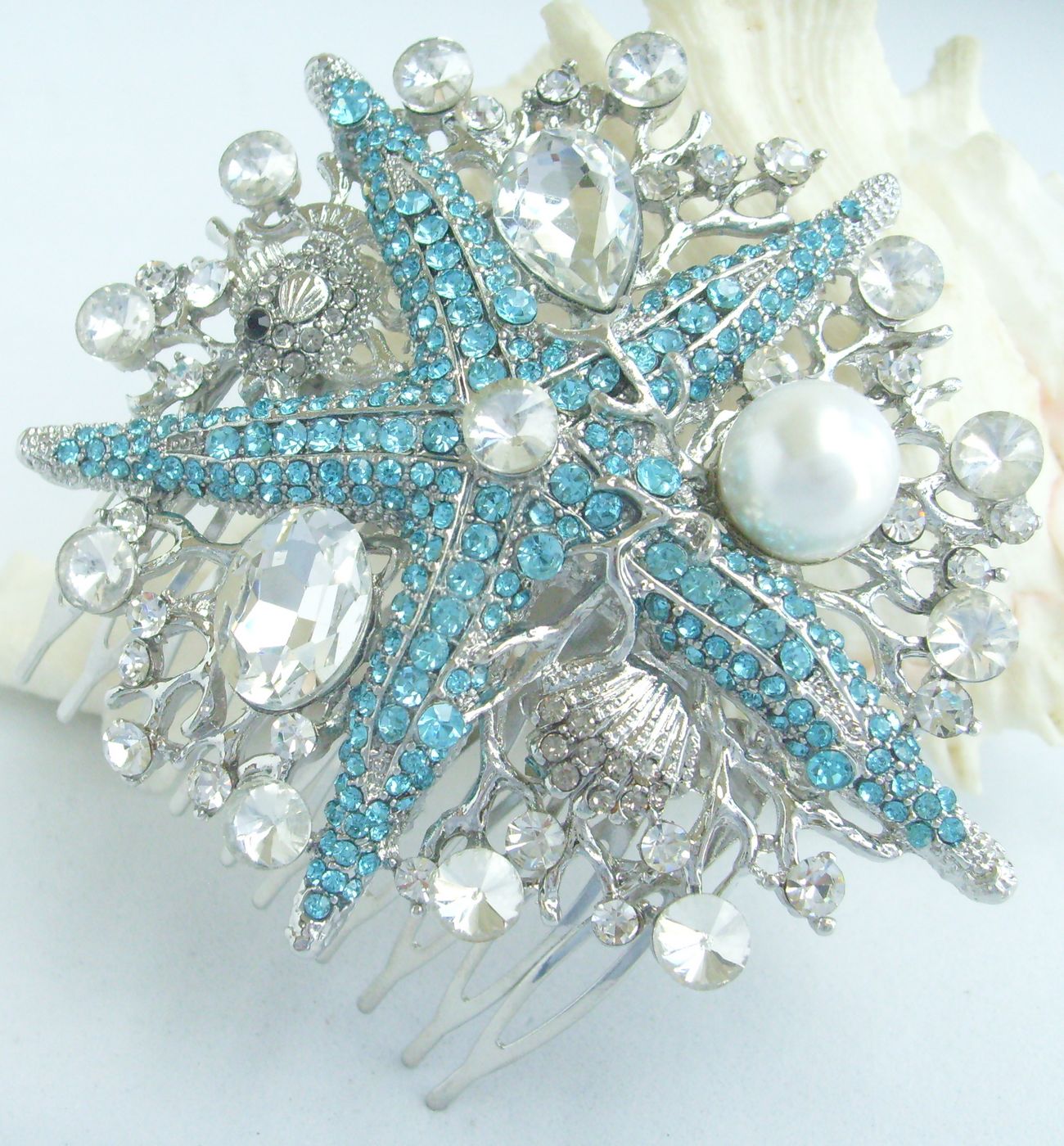 Sindary Wedding Bridal Party Headpiece Starfish Hair Clip Side Comb Rhinestone Hair Comb HC06412 (Silver-Tone Lake Blue Clear) 60g