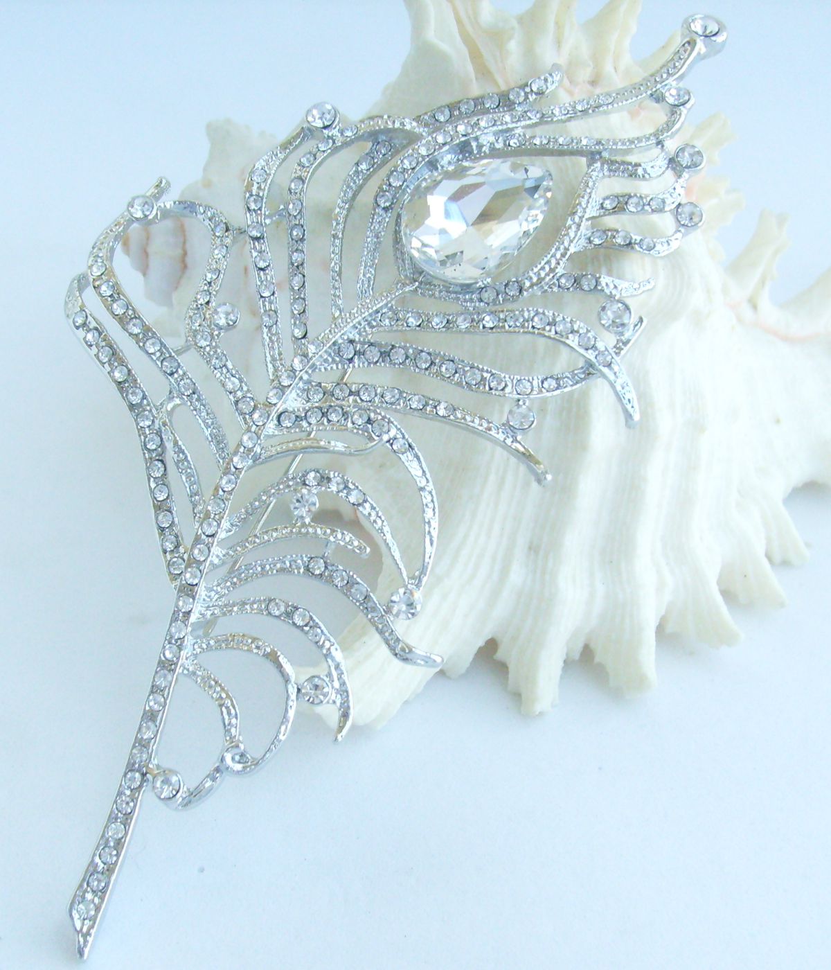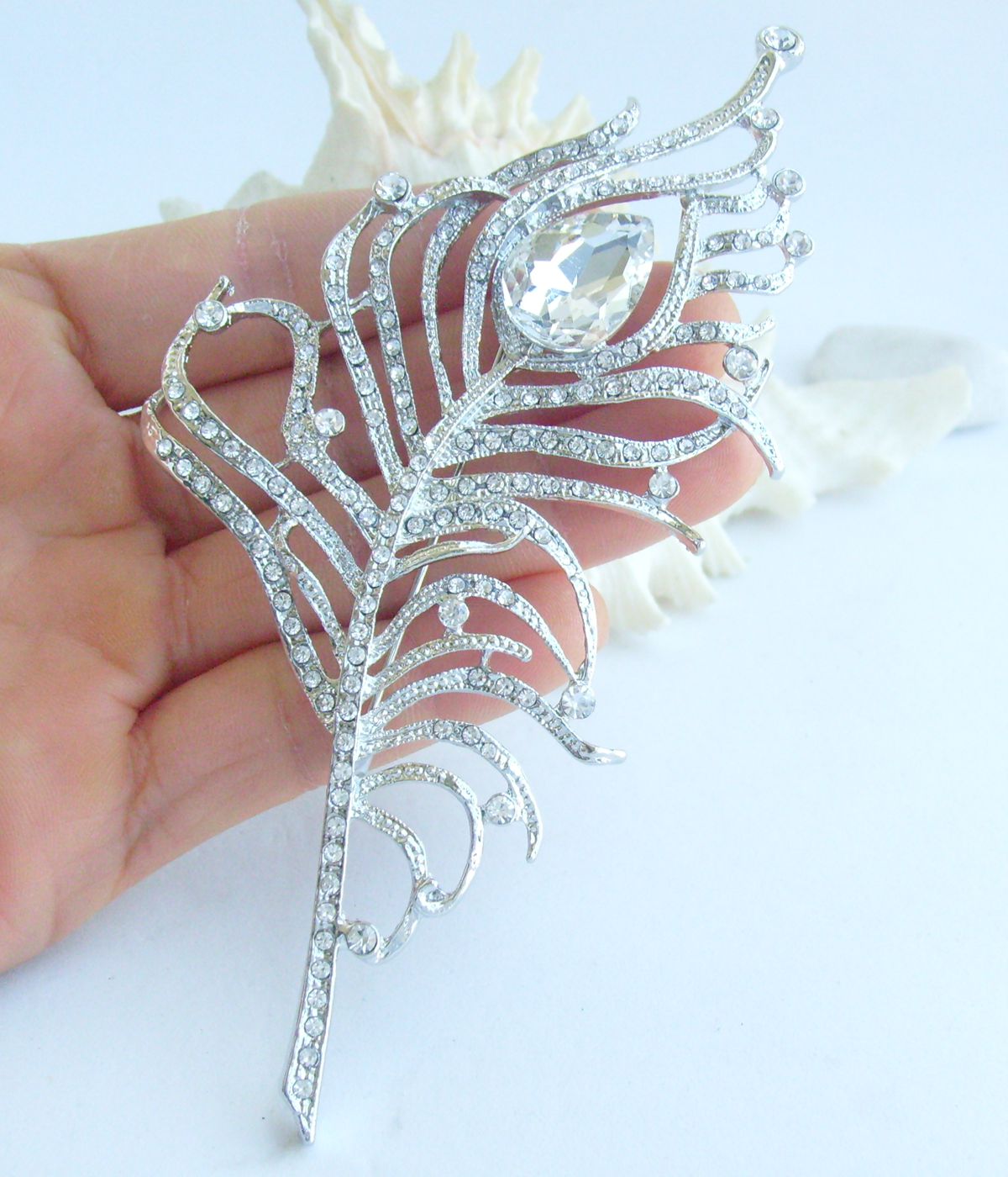 Sindary Rhinestone Crystal 4.9 Inch Peacock Feather Brooch Pin Pendant BP05860 (Silver-Tone Clear) 30g