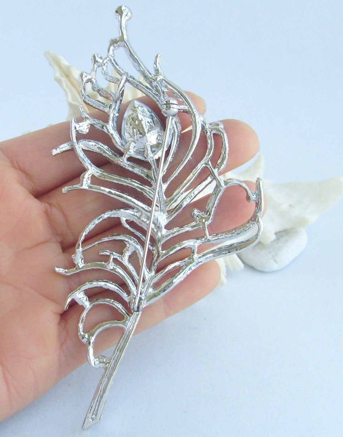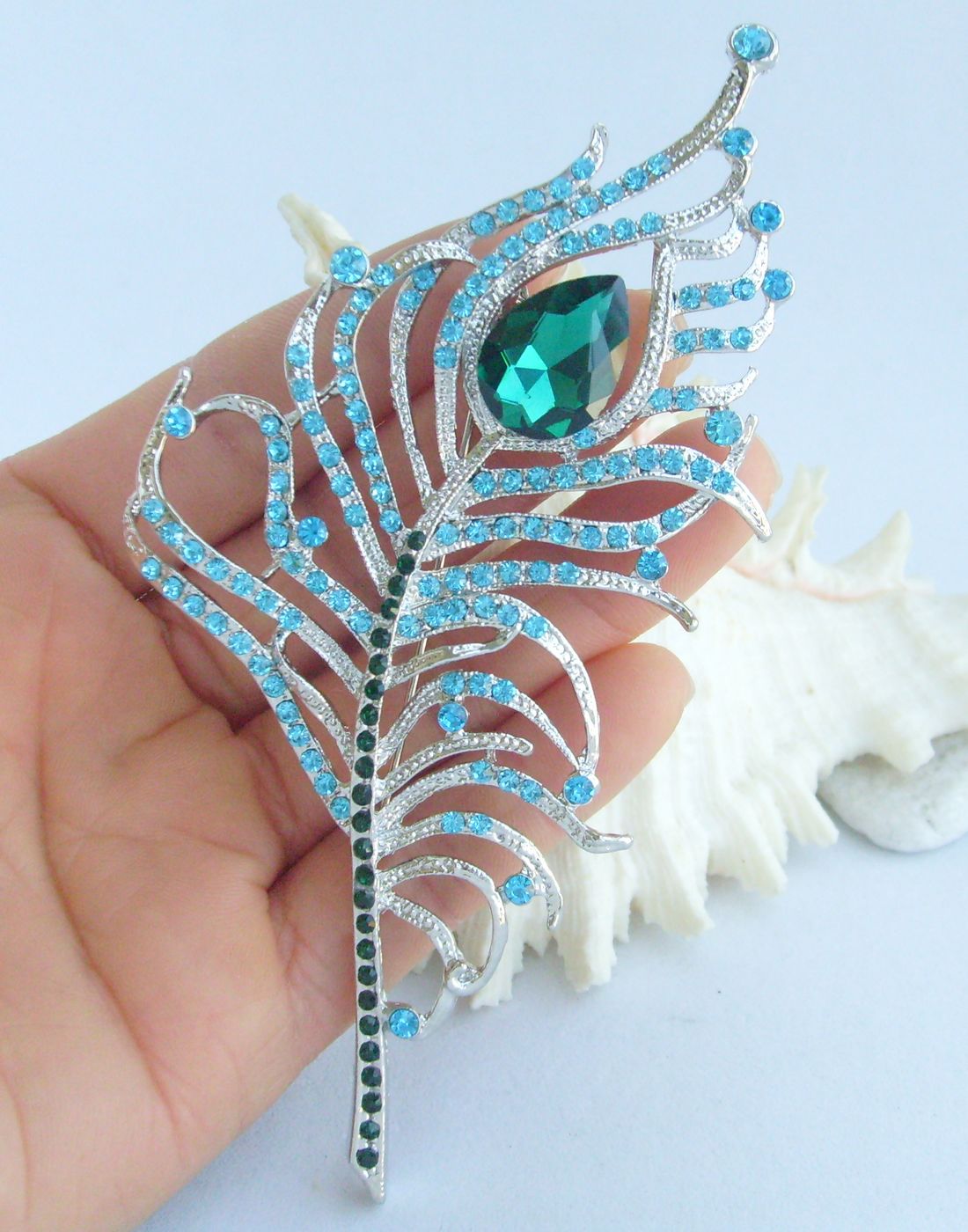 Sindary Rhinestone Crystal 4.9 Inch Peacock Feather Brooch Pin Pendant BP05860 (Silver-Tone Turquoise Green) 30g