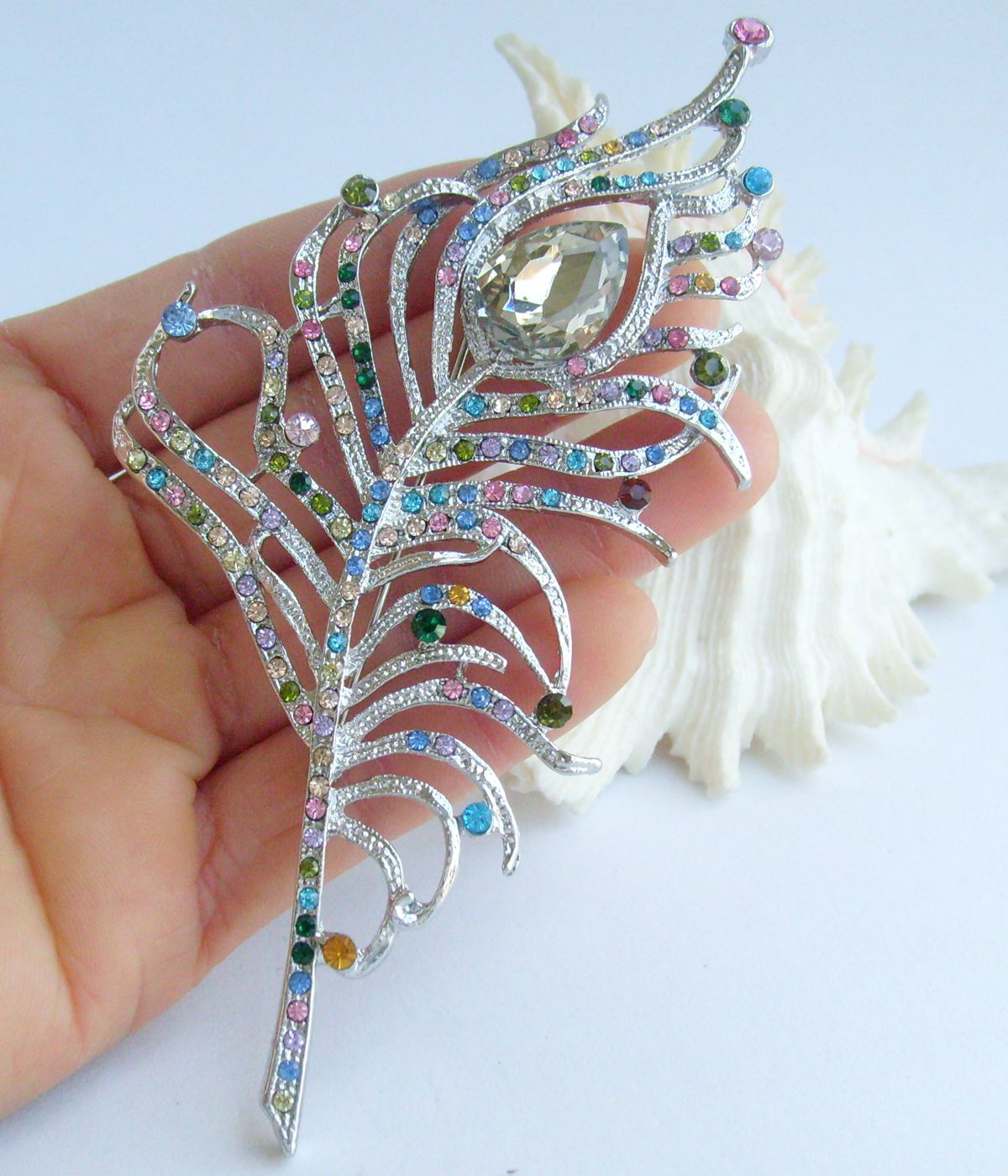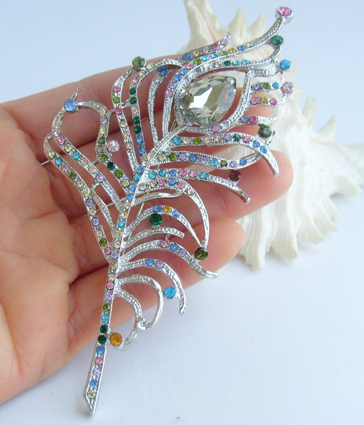 Sindary Rhinestone Crystal 4.9 Inch Peacock Feather Brooch Pin Pendant BP05860 (Silver-Tone Multicolor) 30g