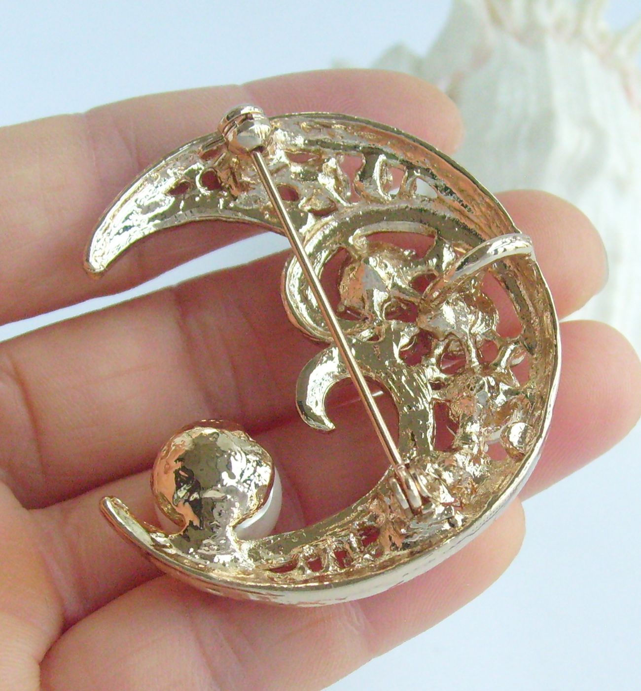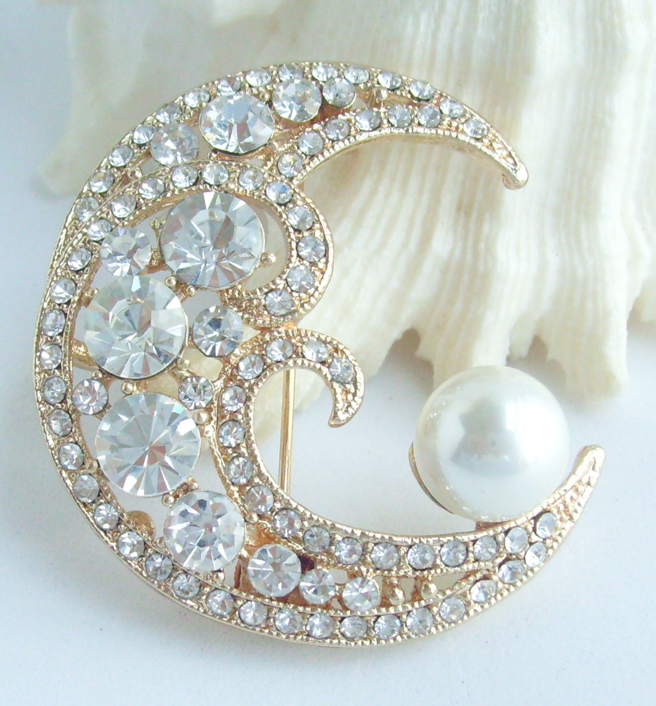 Sindary Pearl Rhinestone Crystal Half Moon Brooch Pin Pendant BP05817 (Gold-Tone Clear) 20g