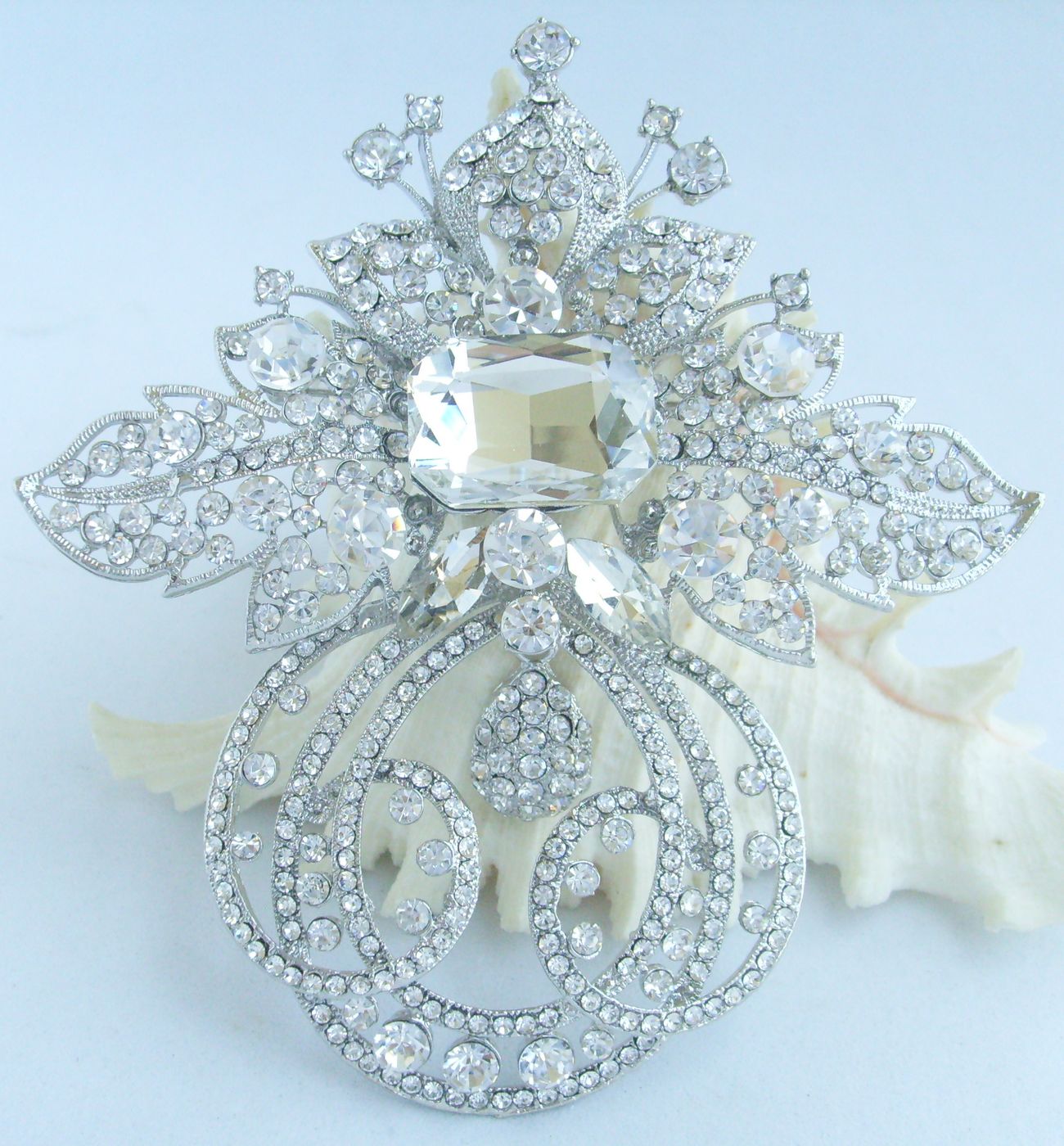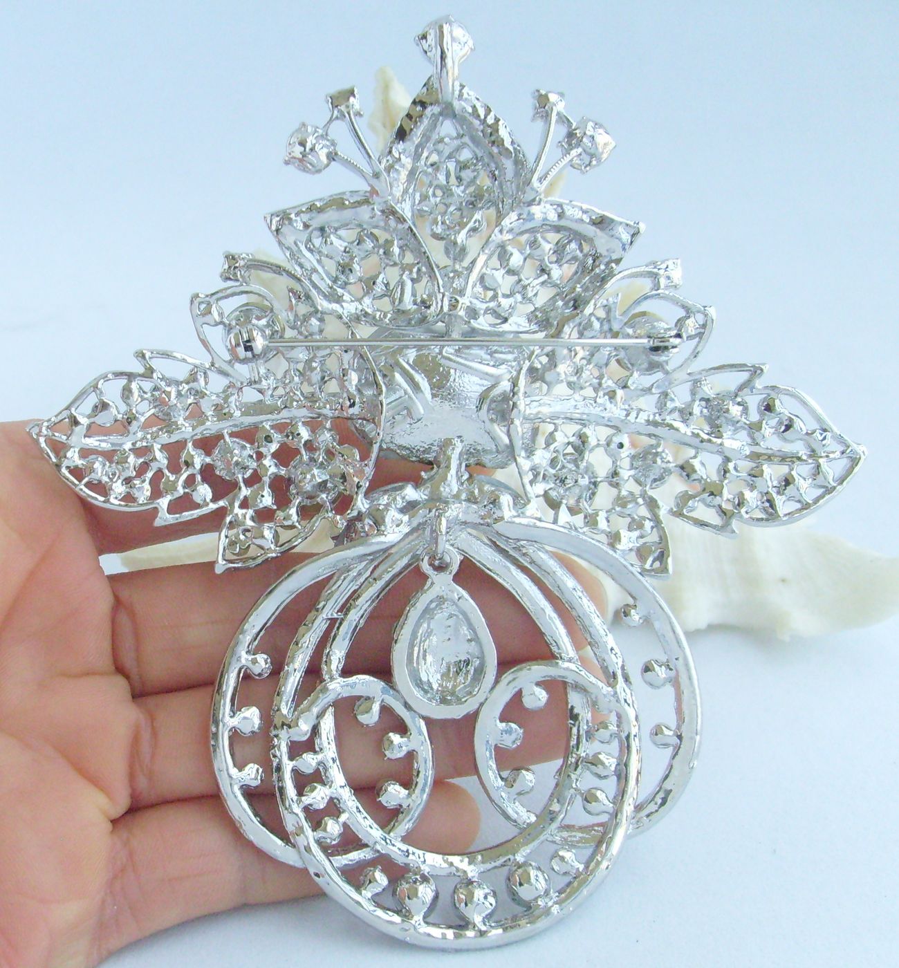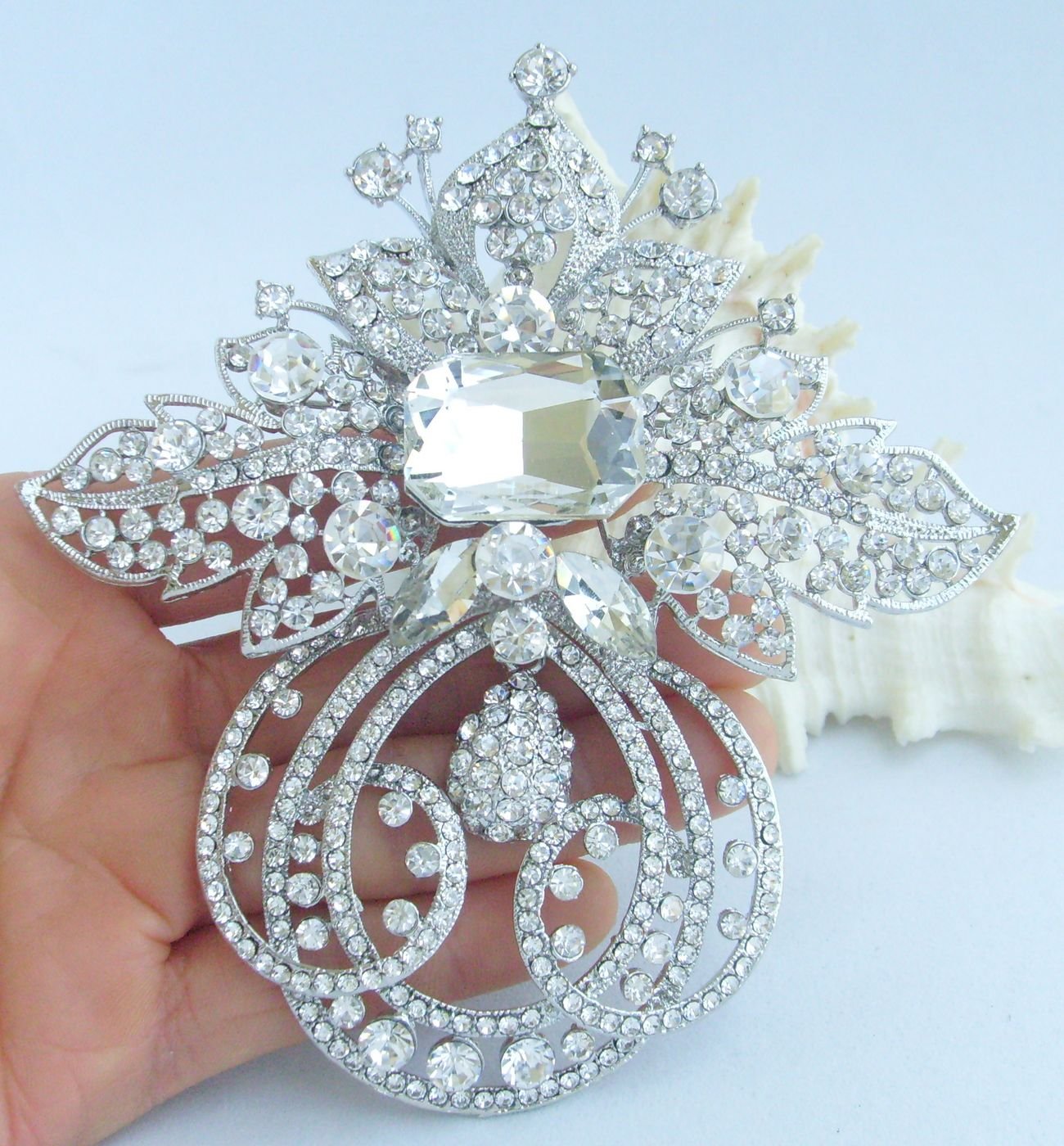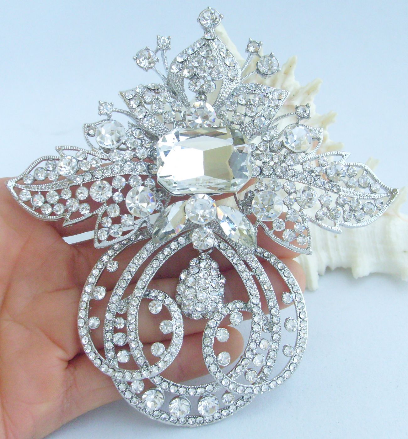 Sindary Rhinestone Crystal 4.7 Inch Large Teardrop Flower Brooch Pin Pendant Party Jewelry BP04249 (Silver-Tone Clear) 75g