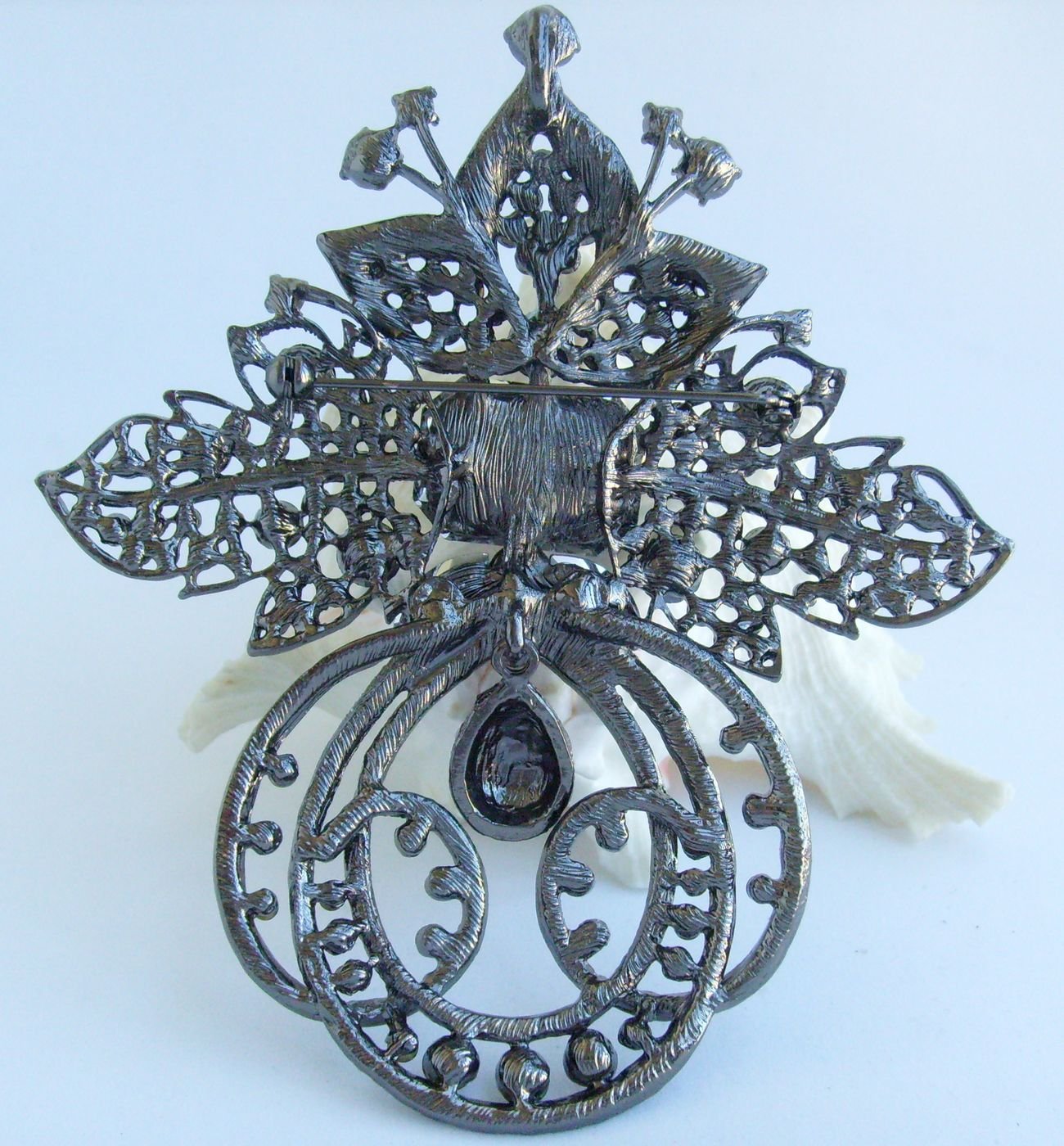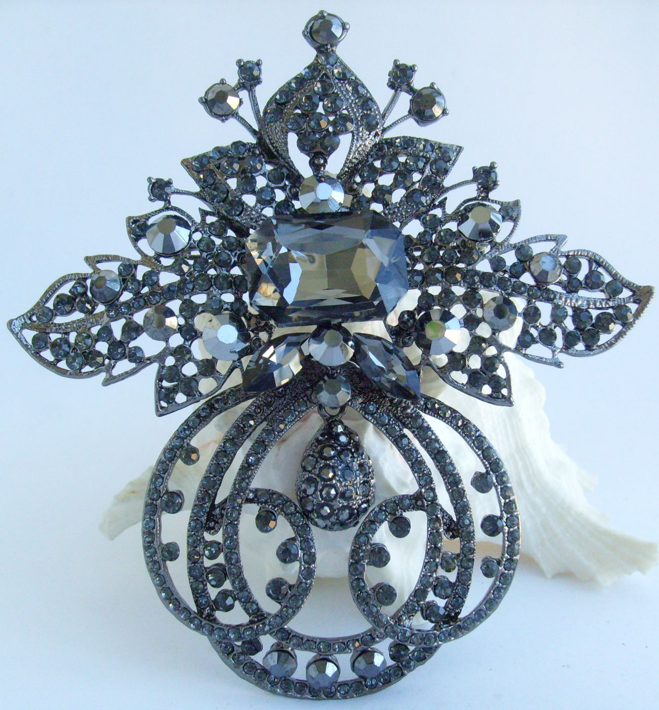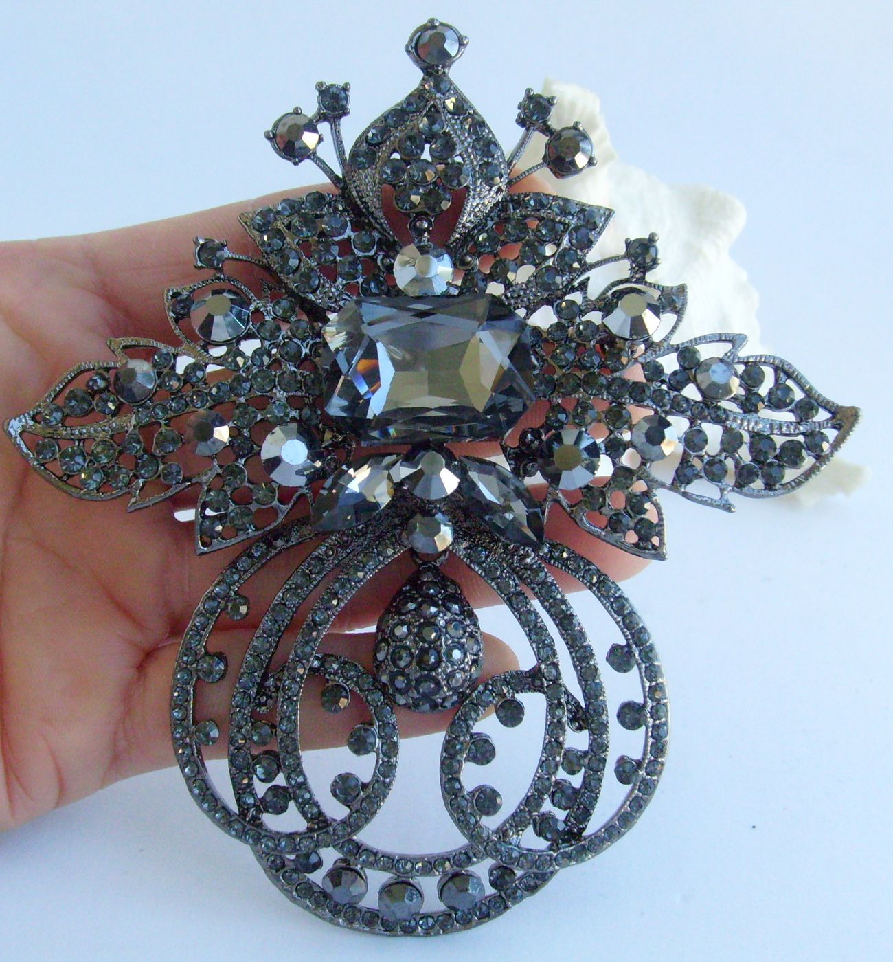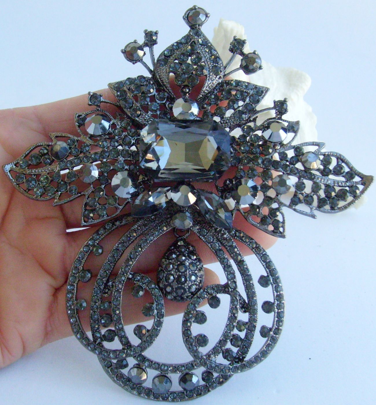 Sindary Rhinestone Crystal 4.7 Inch Large Teardrop Flower Brooch Pin Pendant Party Jewelry BP04249 (Black-Tone Black Gray) 75g