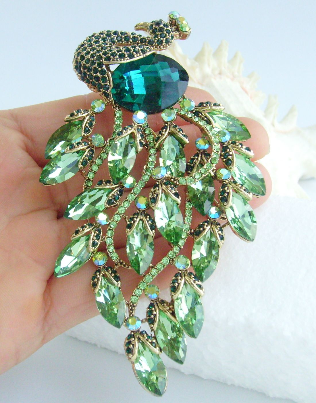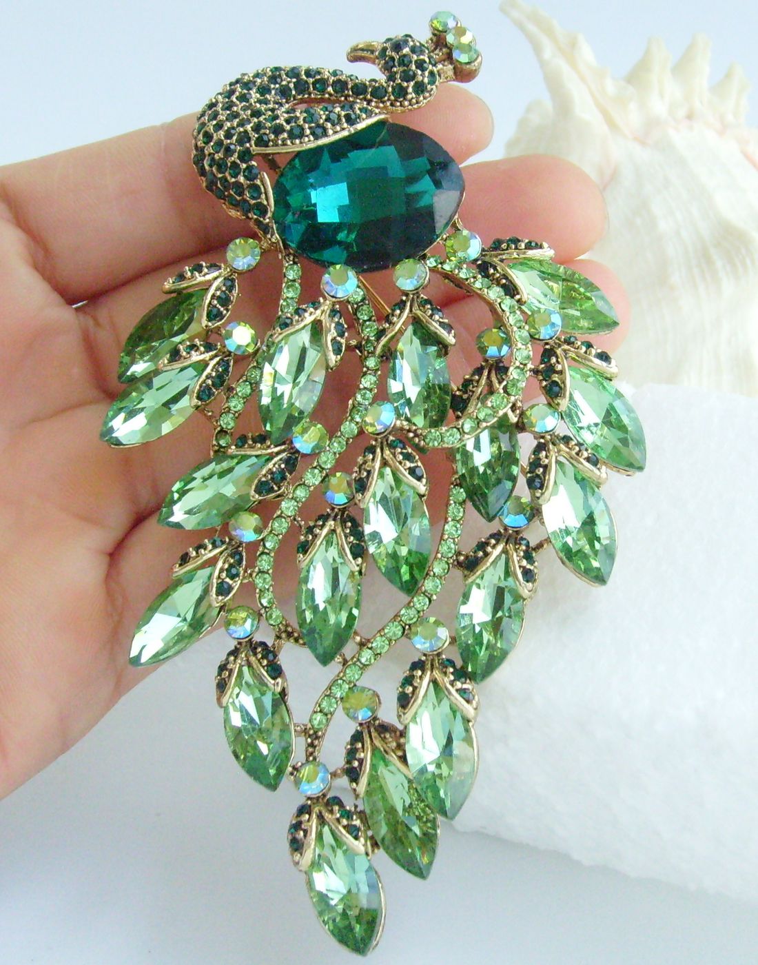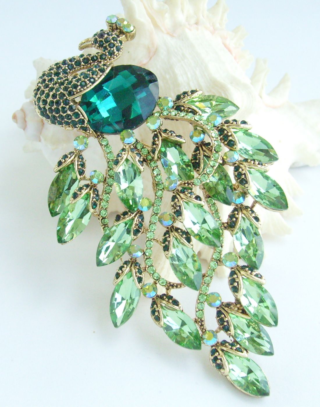 Sindary Rhinestone Crystal Animal Bird Peacock Brooch Pin Pendant BP06543 (Gold-Tone Green) 55g