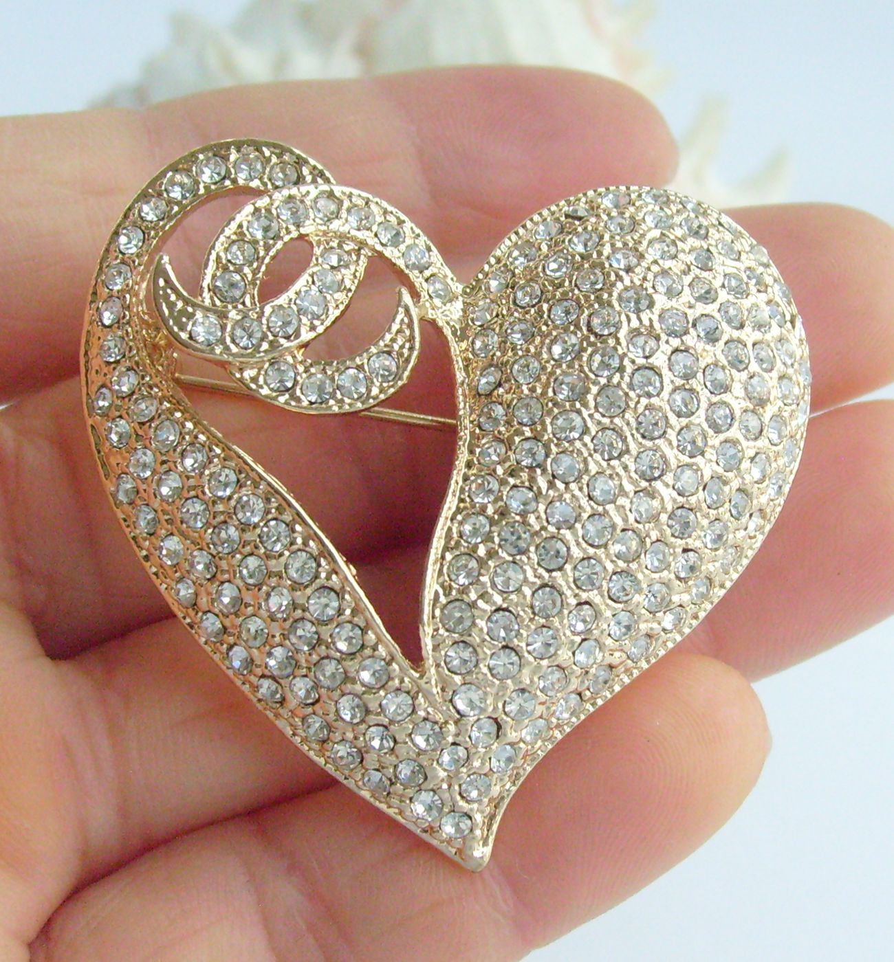 Sindary Rhinestone Crystal Pendant Love Heart Brooch Pin Pendant BP04831 (Gold-Tone Clear) 20g