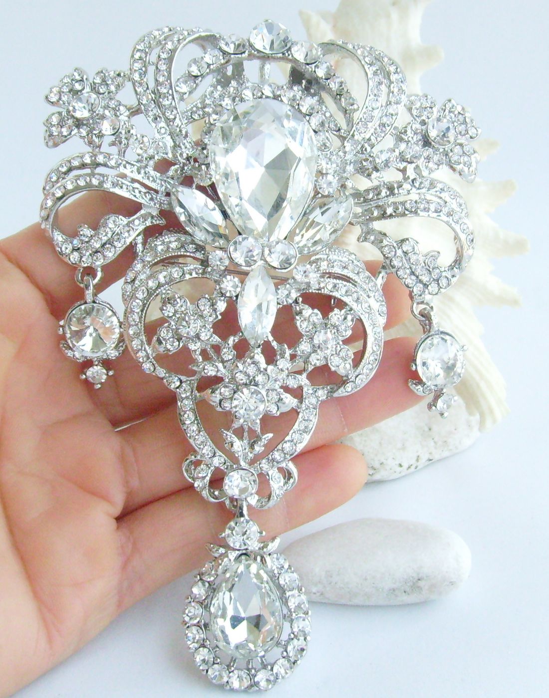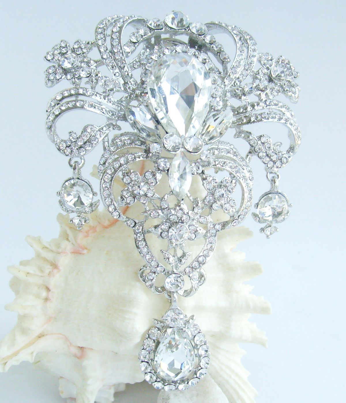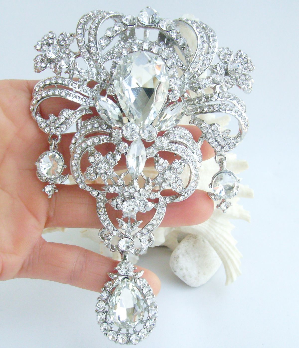 Sindary 5 inch Rhinestone Crystal Flower Teardrop Brooch Pin Pendant BP04042 (Silver-Tone Clear) 80g
