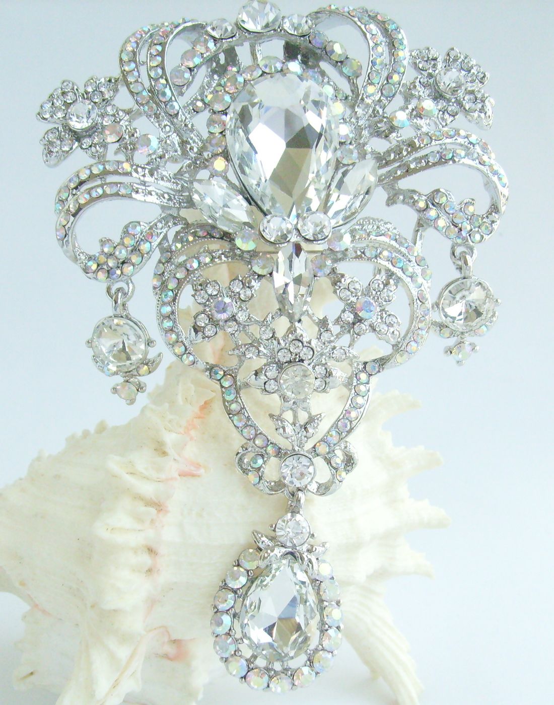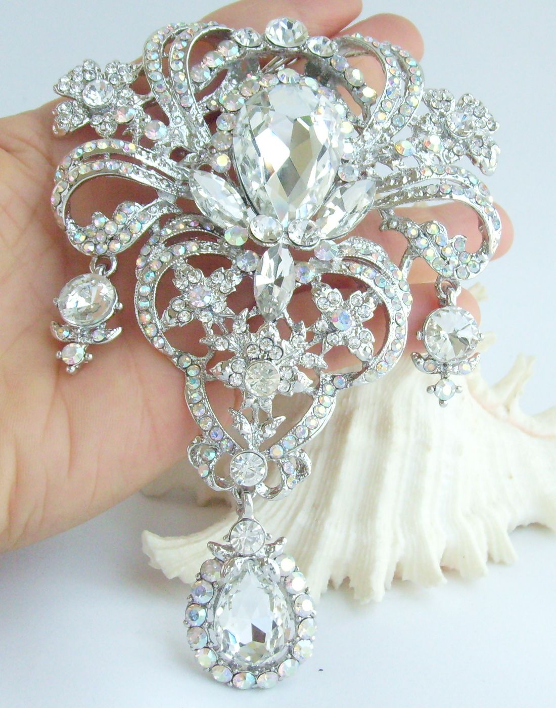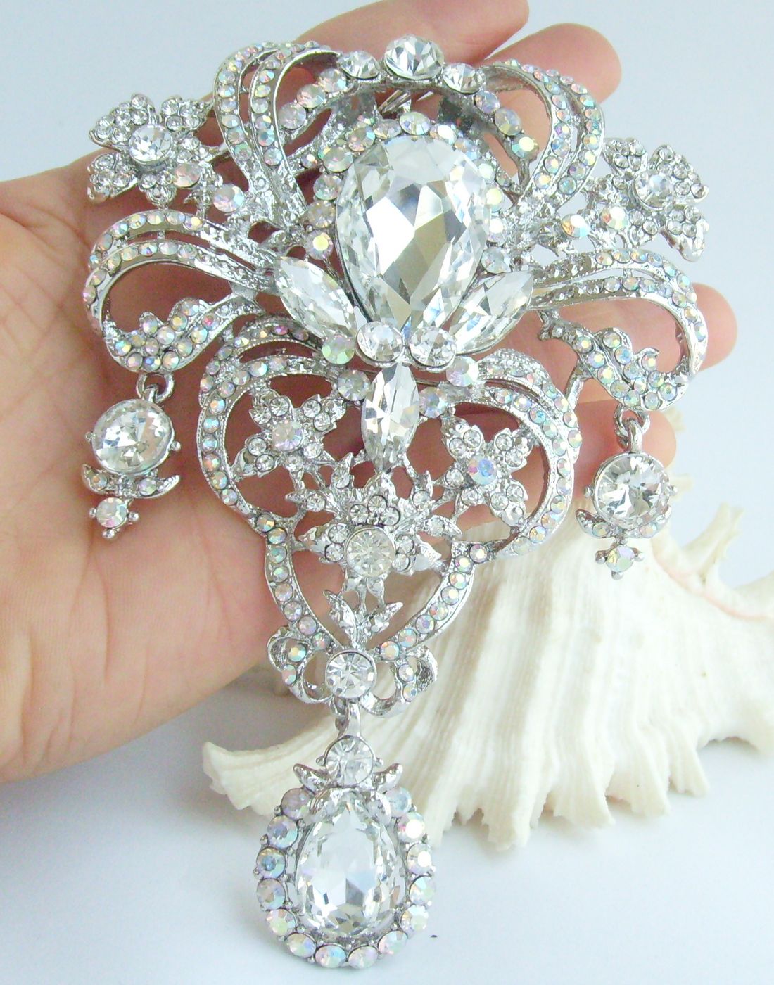 Sindary 5 inch Rhinestone Crystal Flower Teardrop Brooch Pin Pendant BP04042 (Silver-Tone Rainbow Clear) 80g