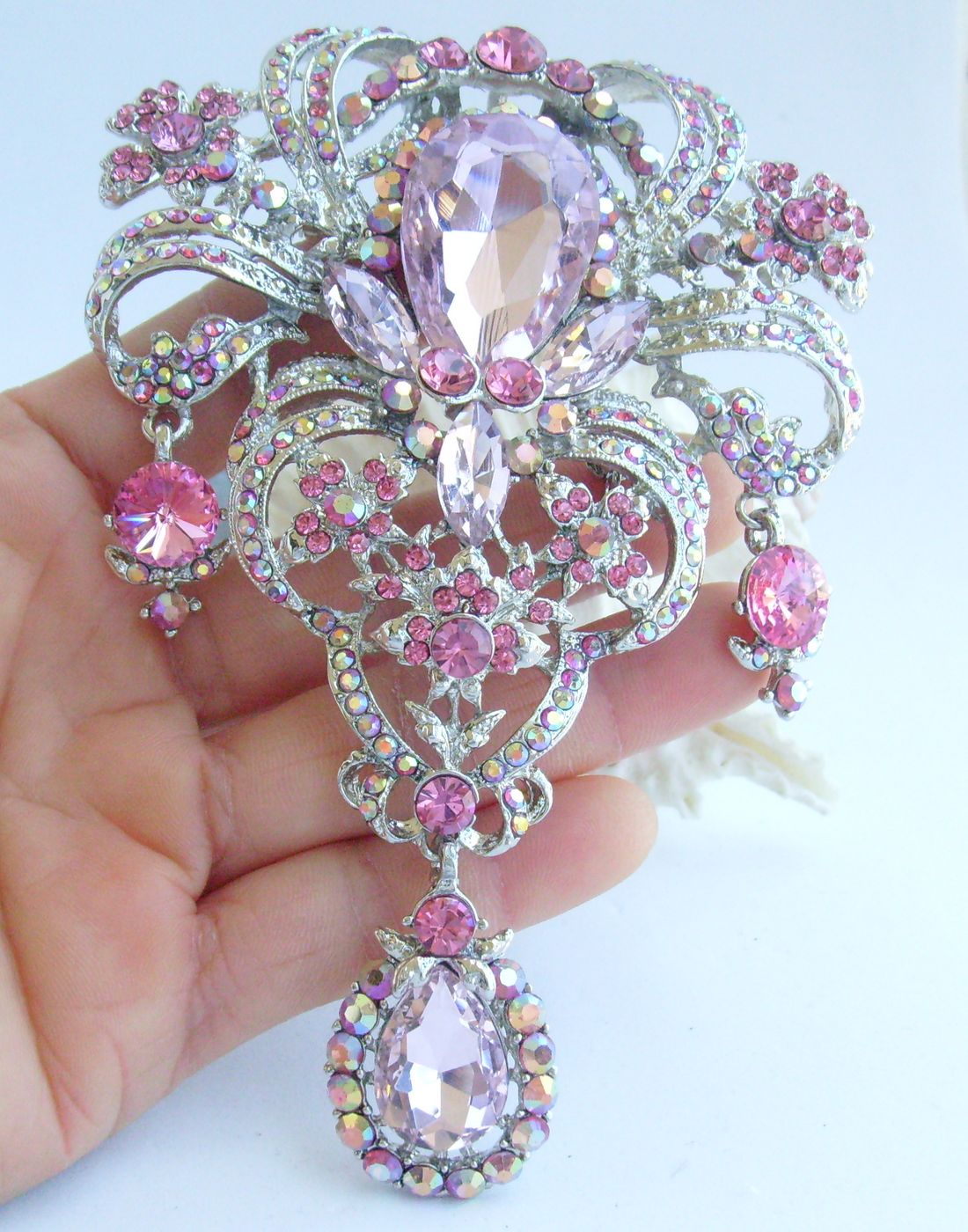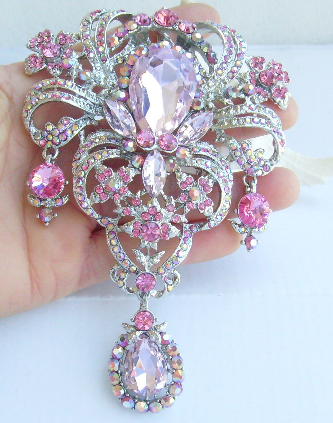 Sindary 5 inch Rhinestone Crystal Flower Teardrop Brooch Pin Pendant BP04042 (Silver-Tone Pink) 80g