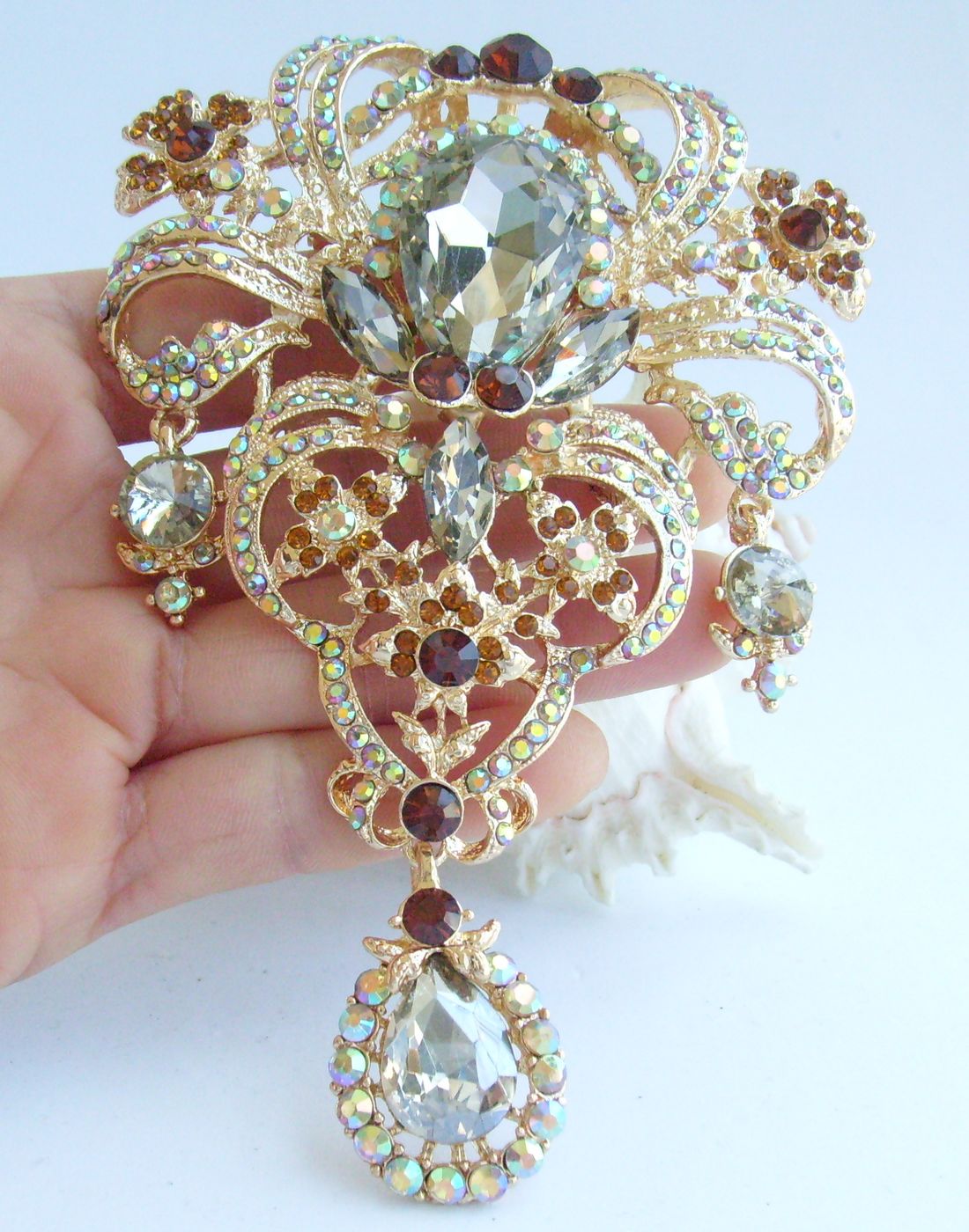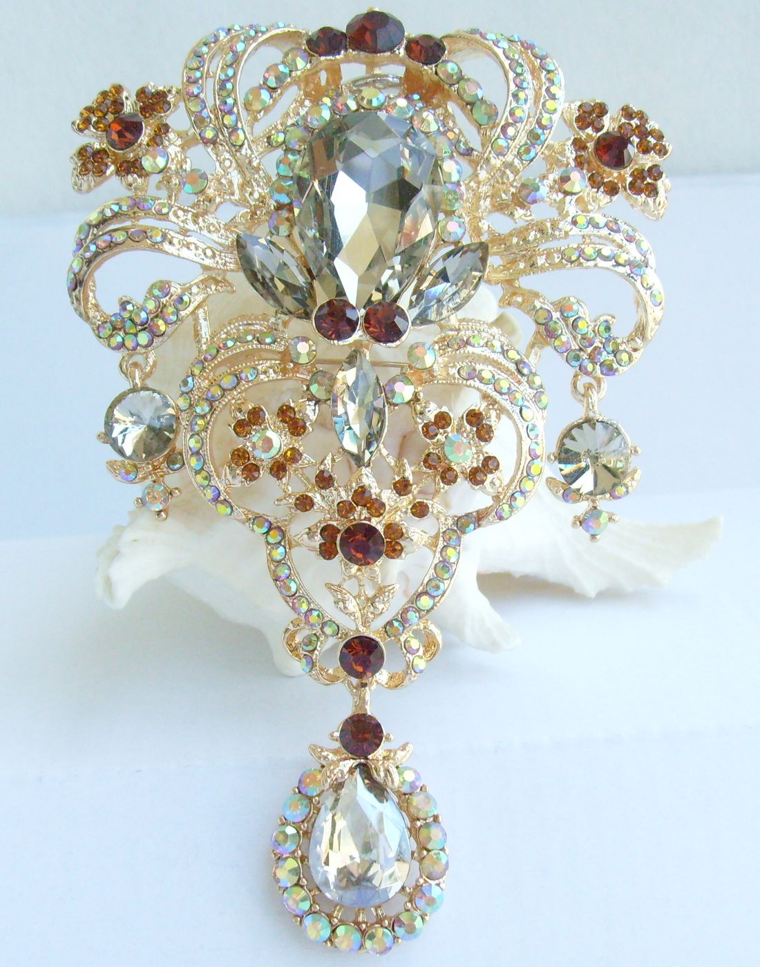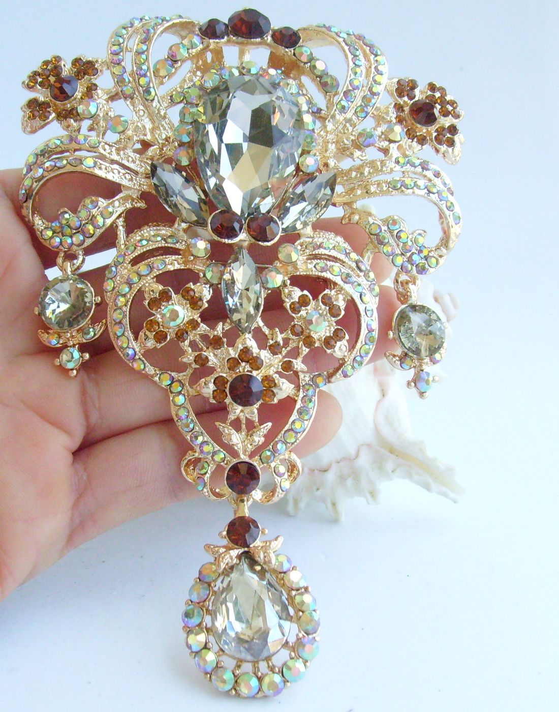 Sindary 5 inch Rhinestone Crystal Flower Teardrop Brooch Pin Pendant BP04042 (Gold-Tone Brown) 80g