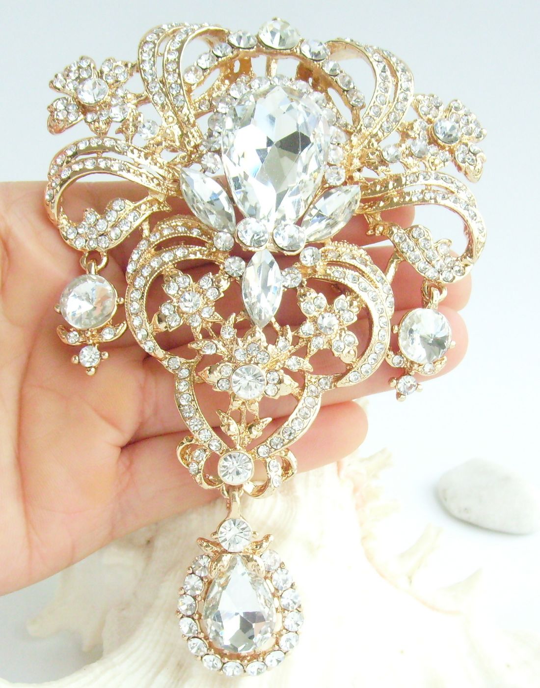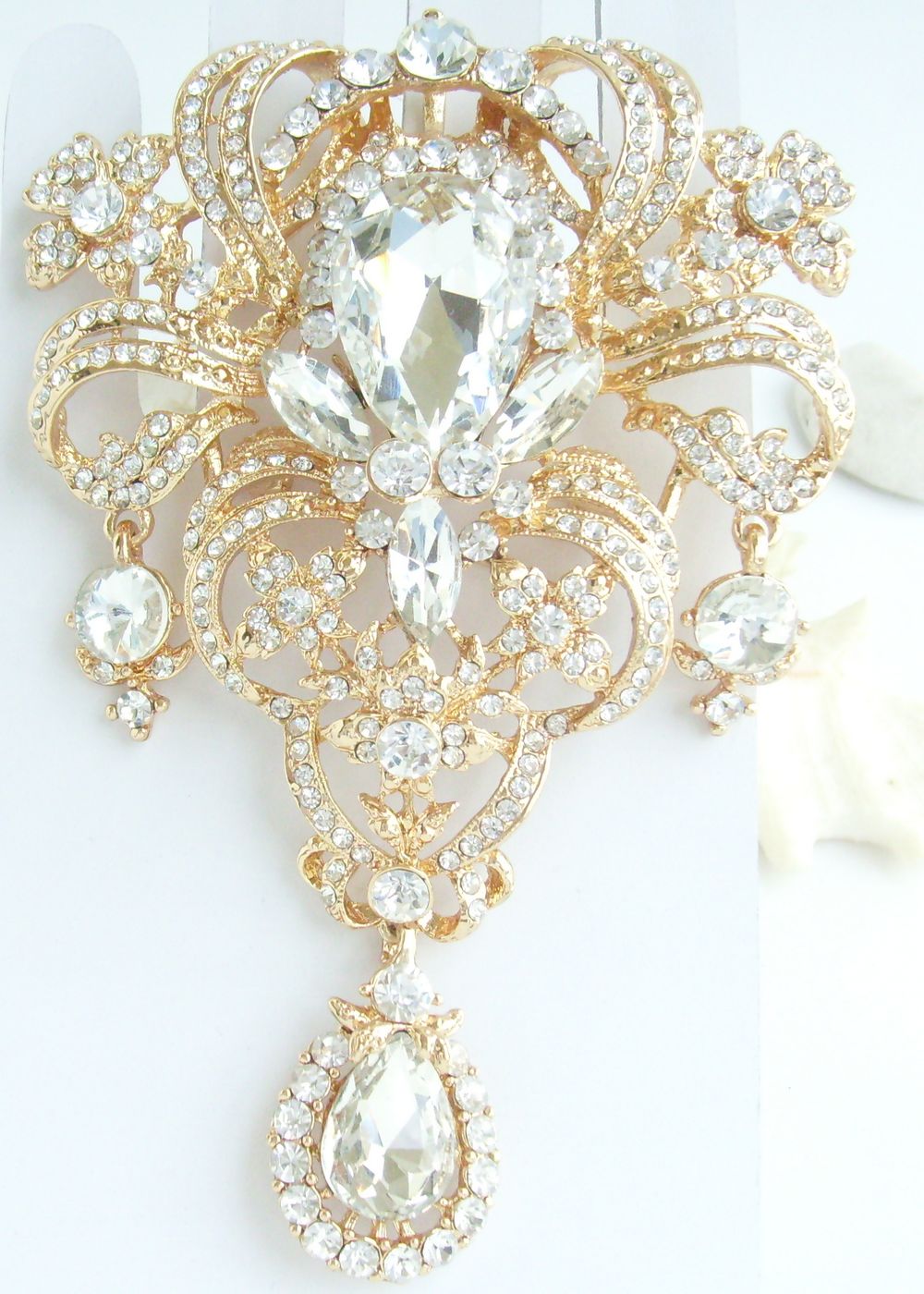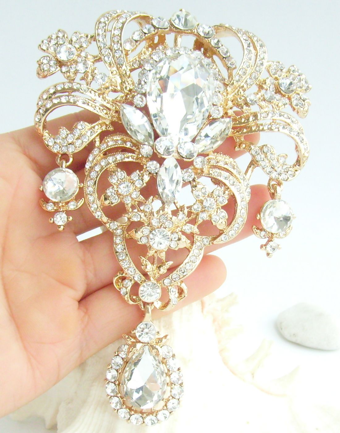 Sindary 5 inch Rhinestone Crystal Flower Teardrop Brooch Pin Pendant BP04042 (Gold-Tone Clear) 80g