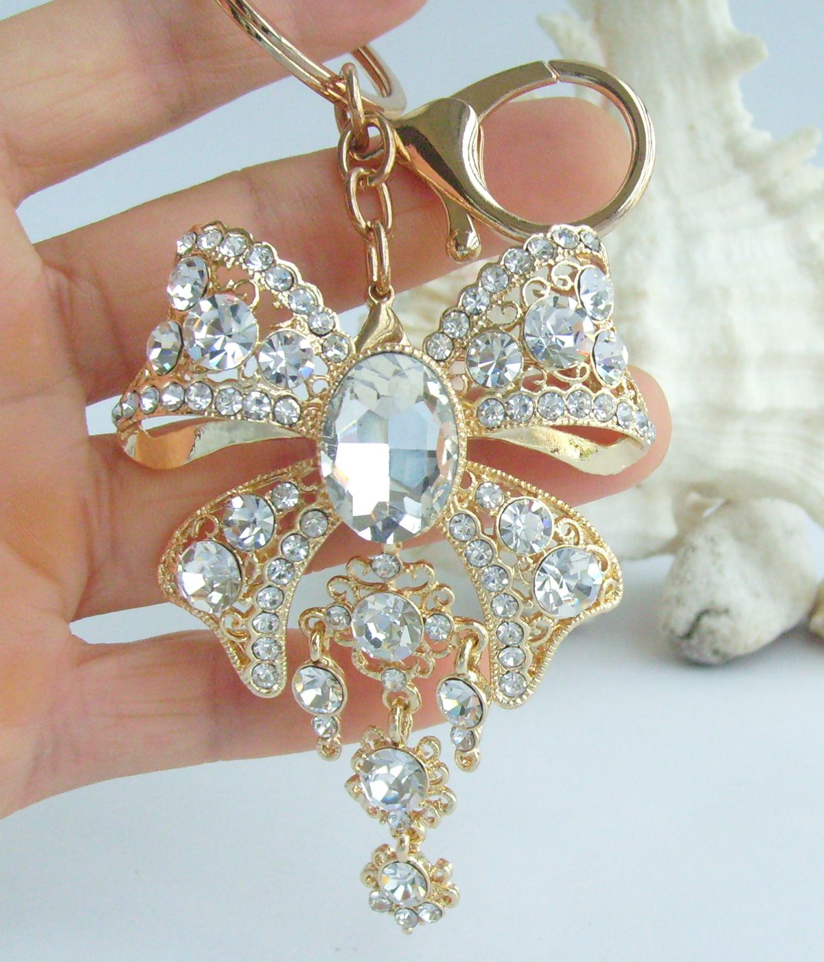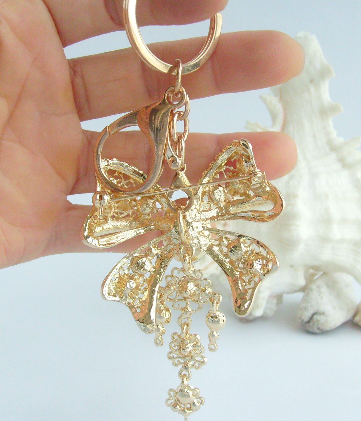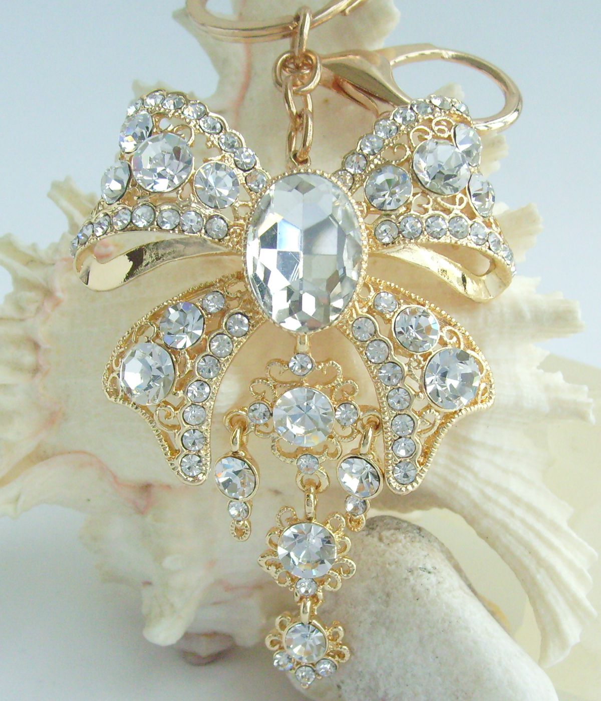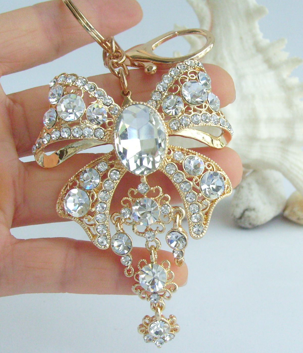 Sindary Rhinestone Crystal Elegant Bowknot Keychain Keyring Pendant KP04503 (Gold-Tone Clear) 40g