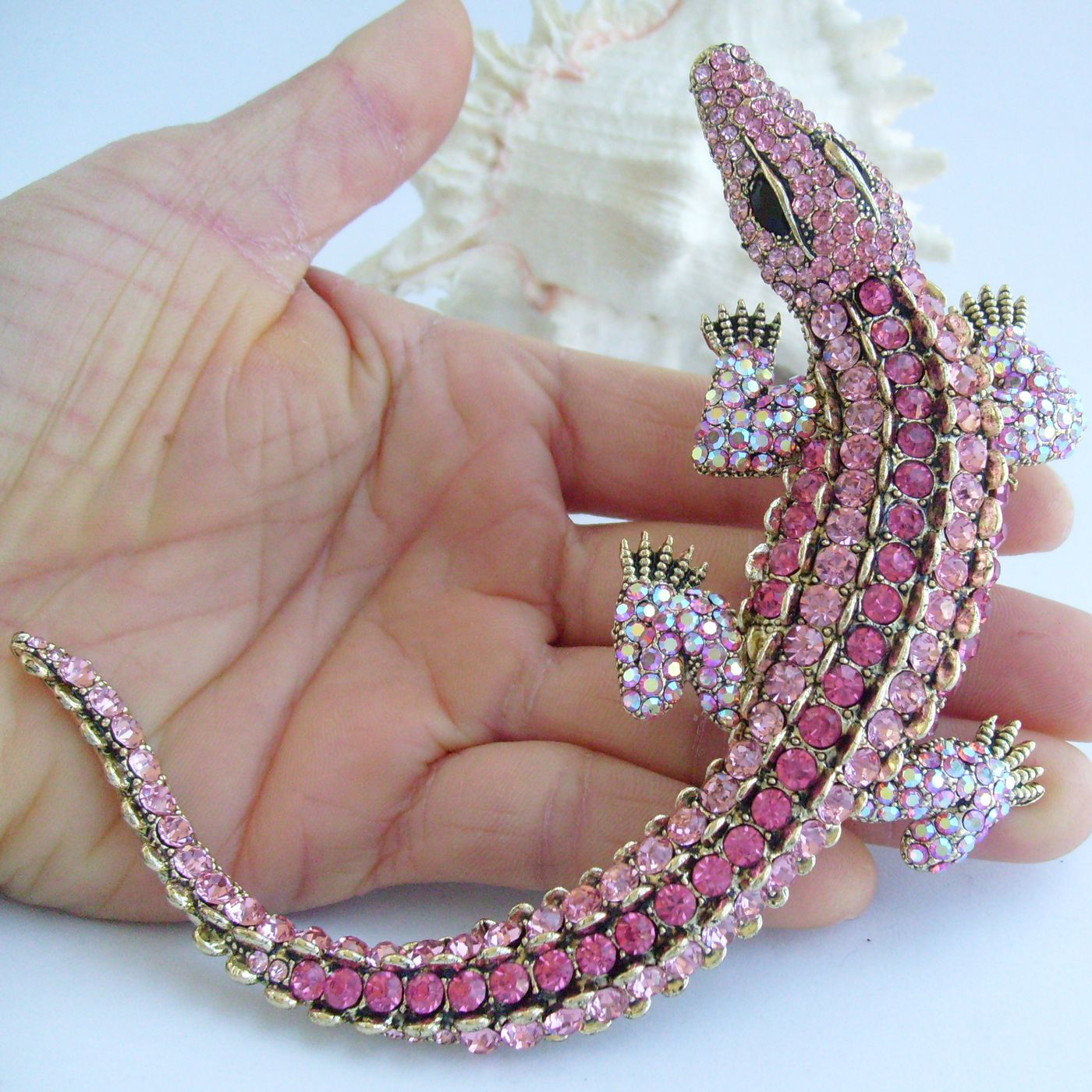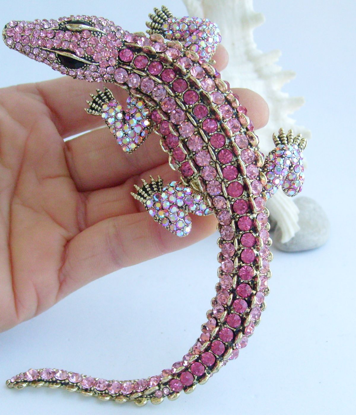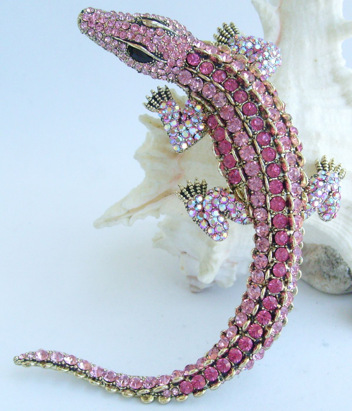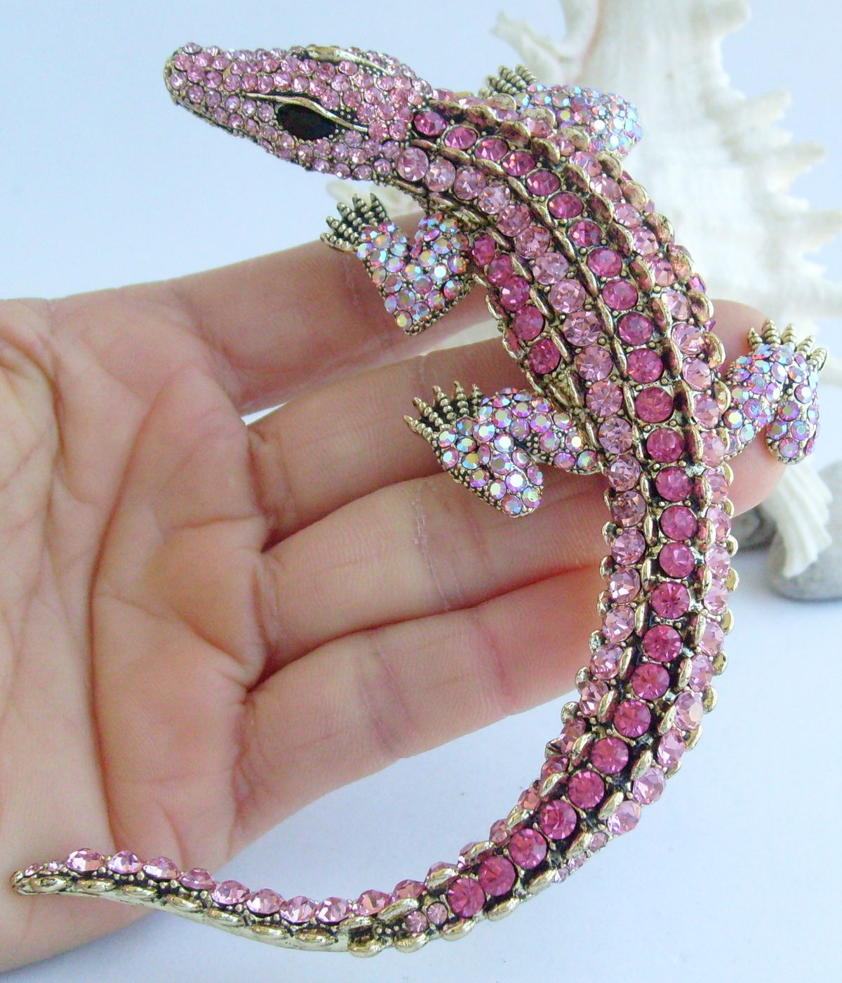 Sindary Unique Alligator Crocodile Brooch Pin Pendant Rhinestone Crystal BP05009 (Gold-Tone Pink) 60g