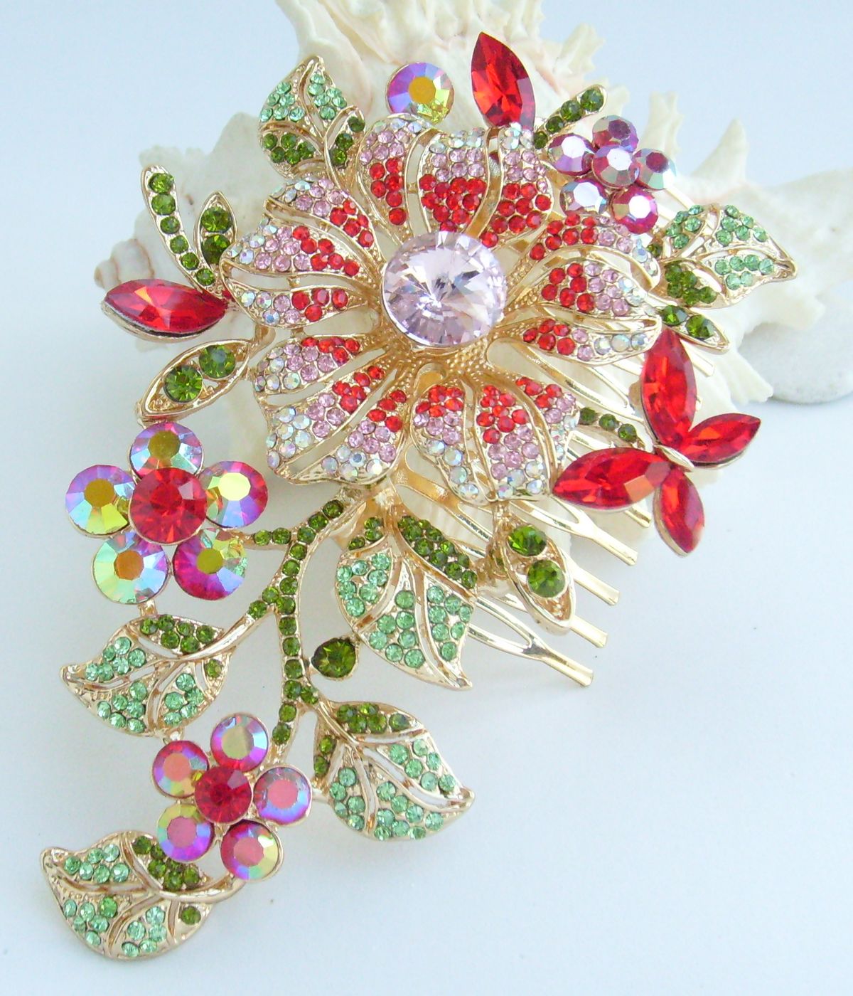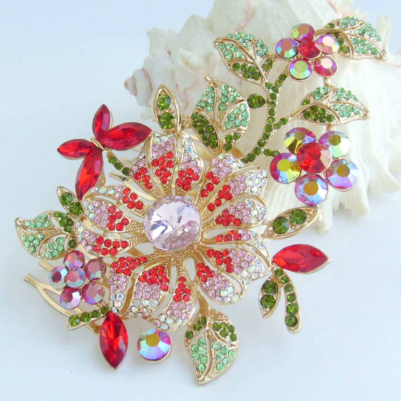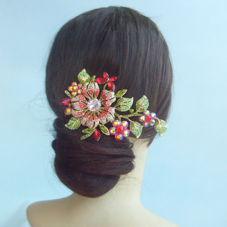 Sindary Wedding Bridal Party Headpiece Flower Hair Clip Side Comb Rhinestone Hair Comb HC04712 (Gold-Tone Red)