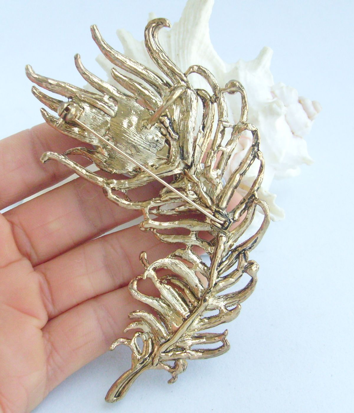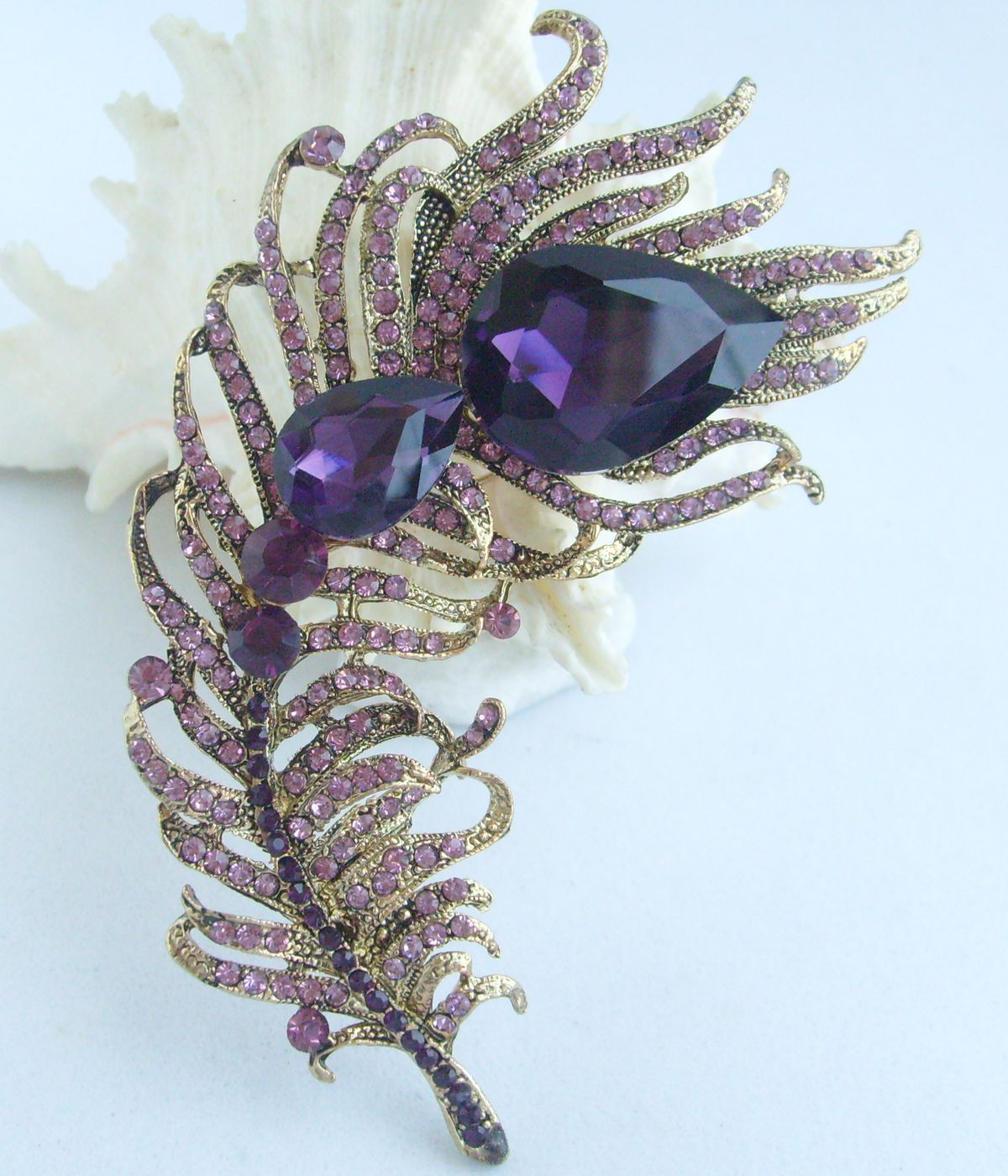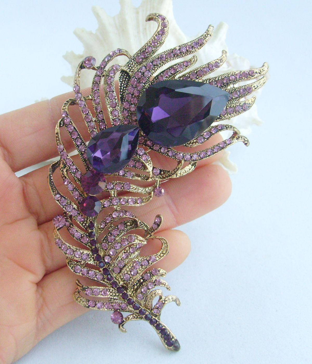 Sindary Elegant Peacock Feather Brooch Pin Pendant Rhinestone Crystal BP05038 (Gold-Tone Purple) 50g